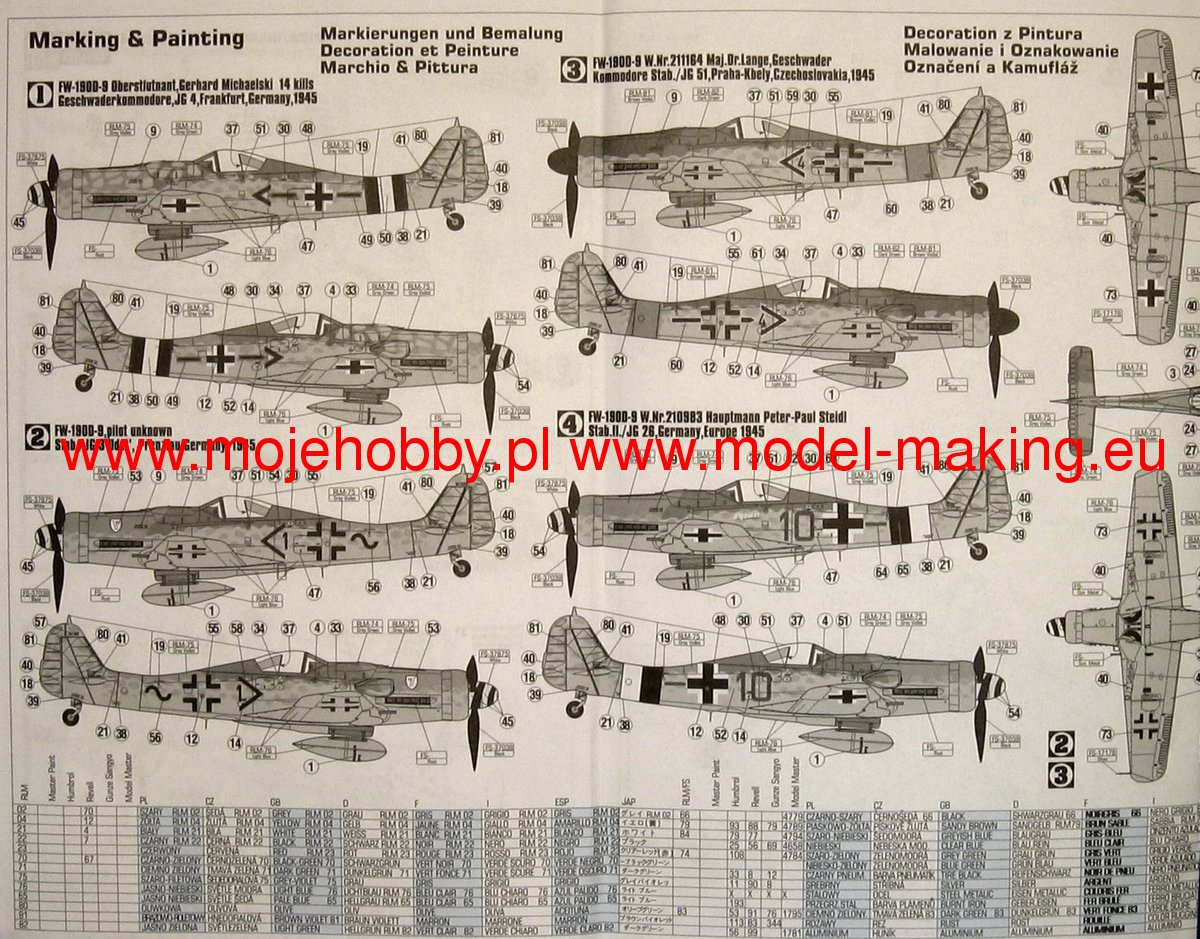 Note: Comany Mistercraft frequently changes, without any notice, the decals that come with the model, so they may differ from the photos and descriptions on our website. If you need a specific version, please let us know about that by entering the appropriate notice in the comments field when placing the order. The Focke-Wulf Fw-190 is a German, single-engine, full-metal fighter aircraft with a covered cabin in the low wing design of the Second World War. The pilots considered the Fw-190 to be a better aircraft than the Messerschmitt Bf-109. A self-supporting low wing with a working Fw-190 coating was commissioned by the Luftfahrtministerium, assembled in the fall of 1937. Kurt Tank submitted two propulsion proposals - the first with a liquid-cooled Daimler-Benz DB 601 engine, and the second with the new BMW 139 radial engine. The latter was chosen, and the work started in the spring of 1938 was headed by Obering R. Blaser. The first prototype of the Fw-190V1 was ready in May 1939, and it was flown in Bremen on June 1, 1939 by Captain Hans Sander. The second prototype, the FW-190V2, armed with two MG131 and two MG17 machine guns - all 7.92 mm caliber, was flew in October 1939. To reduce aerodynamic drag, both were equipped with a tunnel air inlet in the propeller cap, but problems with overheating of the engine resulted in a return to the proven NACA shield design. Before the tests of these prototypes began for good, the decision was already made to replace the BMW 139 engine with a stronger, but longer and heavier BMW 801. It required many changes, strengthening the structure and moving the cabin back, which later became a source of problems with the center of gravity. The advantage was the removal of problems with exhaust gas permeation and overheating of the cabin interior due to its direct vicinity to the BMW 139 engine. The third and fourth prototypes were abandoned, and the Fw-190V5 with the new engine was completed at the beginning of 1940. Later, it received wings with a wingspan enlarged by one meter (from the original 9.5 m), which made it 10 km / h slower, but it increased the rate of climb and improved maneuverability. It was marked Fw-190V5g, and the variant with the shorter wing was Fw-190V5k. The first seven machines of the Fw-190A-0 information series had a short wing, the rest - a longer one. The first operational unit equipped with the Fw-190 - 6./JG 26 stationed at Le Bourget, declared its operational readiness in August 1941 and from the first meeting of the new fighter with the British Supermarine Spitfire, its advantage over them became apparent. During the war, a dozen or so versions of this great plane were created. The machines of the "A" version, along with a dozen or so modernizations, served as fighter planes. The versions marked "B" and "C" were only prototypes of high-altitude fighters intended for fighting strategic bombers, but they did not enter into serial production. The "D" variant, as the only one of the Fw-190s, was powered by the new 1750HP Jumo 213A engine and was the German response to the P-51 Mustang. The new engine extended the fuselage by several dozen centimeters. This variant also performed mainly hunting and high-altitude fighter tasks. Numerous variants of the "F" version were used as fighter-bombers as direct support of the battlefield. The "G" version played the same role as the "F" version, but had a greater range. During the entire war, over 20,000 copies of this one of the best fighters of World War II were produced. Technical data (version Fw-190A-8): length: 9m, wingspan: 10.51m, height: 3.95m, maximum speed: 656km / h, rate of climb: 15m / s, maximum range: 800km, maximum ceiling 11410m , armament: fixed-2 MG131 13mm machine guns and 4 MG151 20mm cannons (2 MG 151 / 20E cannons for the D-9 version).