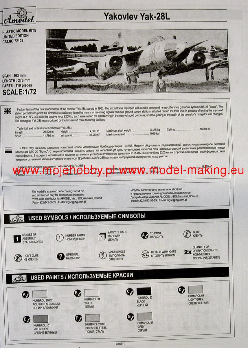 Jakowlew Yak-28 był odrzutowym, średnim samolotem bombowym, myśliwskim i rozpoznawczym o konstrukcji metalowej w układzie wolnonośnego średniopłata produkcji radzieckiej. Napęd zapewniały dwa silniki odrzutowe Tumanski R-11. Oblot prototypu miał miejsce w 1958 roku, a produkcja seryjna trwała w ZSRR w od 1959 do 1972 roku. Szacuje się, że w jej toku powstało ok. 1200 egzemplarzy tej maszyny. Jakowlew Yak-28, pomimo zewnętrznego podobieństwa do samolotu Yak-25, nie był oparty o jego konstrukcję, chociaż wykorzystywał niektóre jego podzespoły. W toku produkcji seryjnej powstało bardzo wiele wersji rozwojowych. Pierwsza z nich (Yak-28A) pozwalała na wykorzystywanie pocisków naprowadzanych radarowo. Krótko później opracowano wersję Yak-28I ze znacznie doskonalszą elektroniką oraz systemem radarowym. Powstała także wersja szkoleniowa (Yak-28U) z podwójnym kokpitem. W 1963 roku oblatano prototyp wersji obserwacyjnej (Yak-28R), bazującej w dużym stopniu na modelu Yak-28I. Od 1964 roku wprowadzano partiami do służby wersję myśliwską (Yak-28P), która mogła wykorzystywać nowoczesne jak na owe czasy pociski AA-3 Anab. Jakowlew Yak-28 nie był eksportowany, a w latach 80. XX wieku wycofywano ze służby poszczególne wersje tego udanego samolotu. Co oprócz modelu będę potrzebować do jego sklejenia?