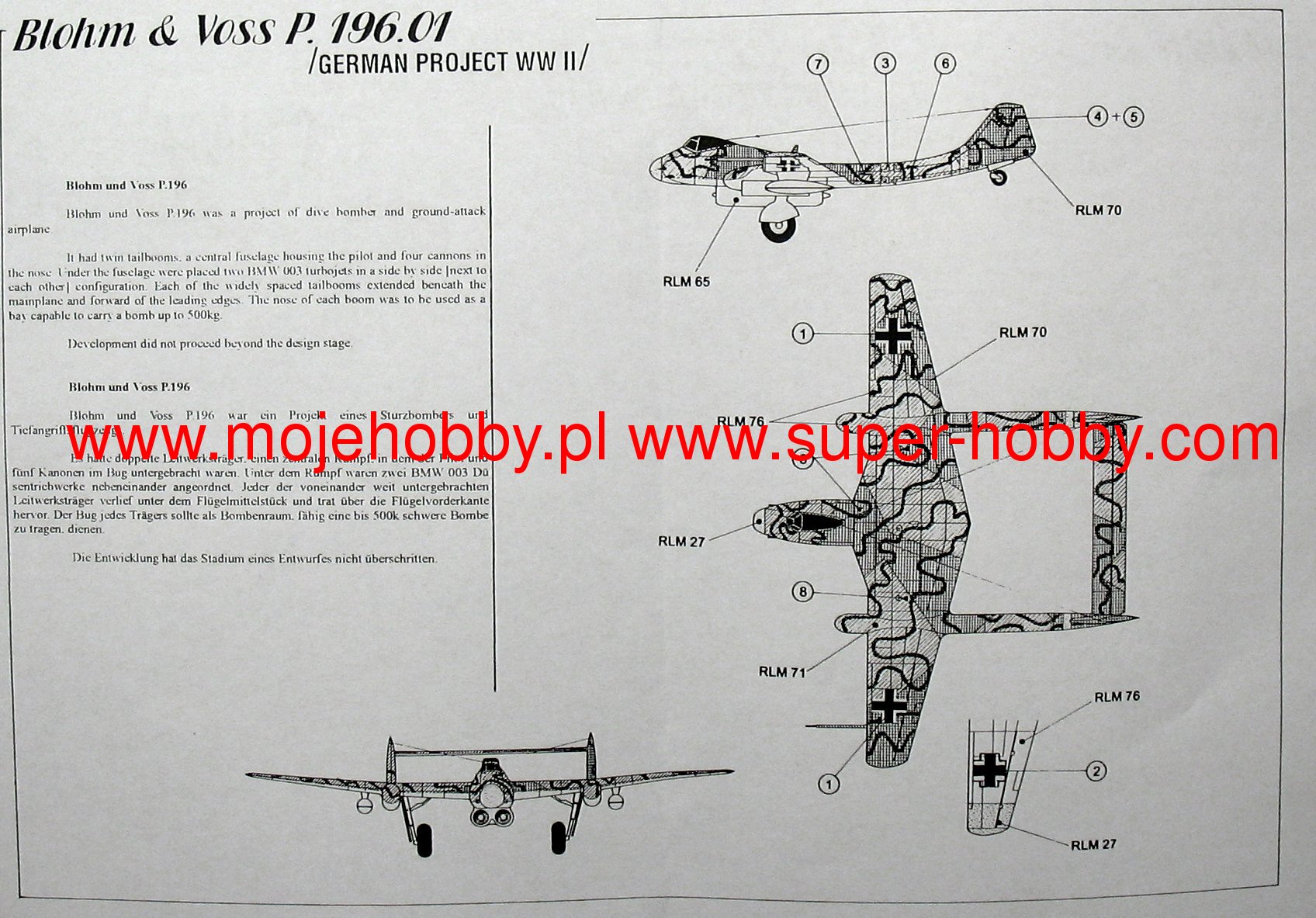 Blohm und Voss P.196 was a project of a German WWII dive bomber. The propulsion was supposed to be provided by two BMW 003 jet engines. The on-board armament was to consist of four 20 mm or 30 mm cannons. The plane was to be capable of carrying a load of bombs weighing up to 1000 kilograms. The machine has never been tested, much less entered mass production. The Blohm und Voss P.196 was designed as the successor to the Ju-87 Stukas bomber by a team of engineers led by Richard Vogt. The design was highly avant-garde: it involved a double-beam vertical tail, a large center wing and a very short fuselage. The power unit consisting of two engines was to be located under the fuselage of the plane. Moreover, the use of a classic double-support main undercarriage was planned. Ultimately, however, the Blohm und Voss production office quickly abandoned the P.196 project - the machine never got past that stage.