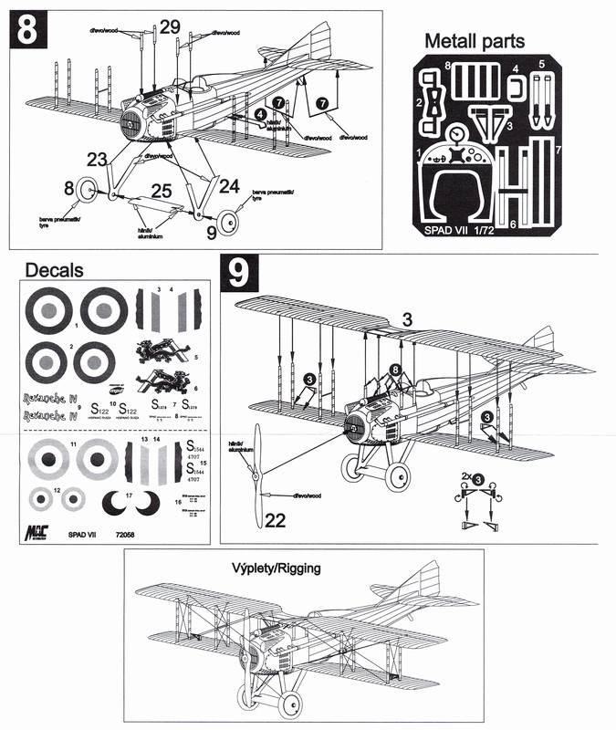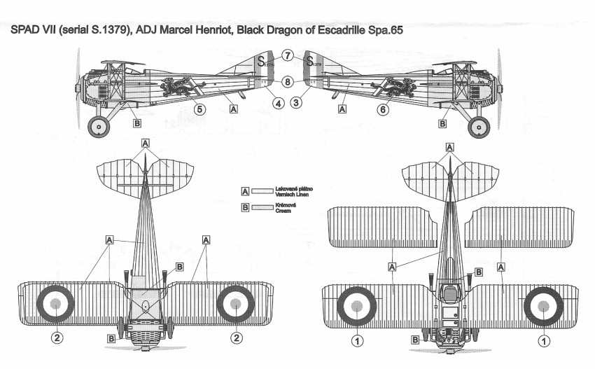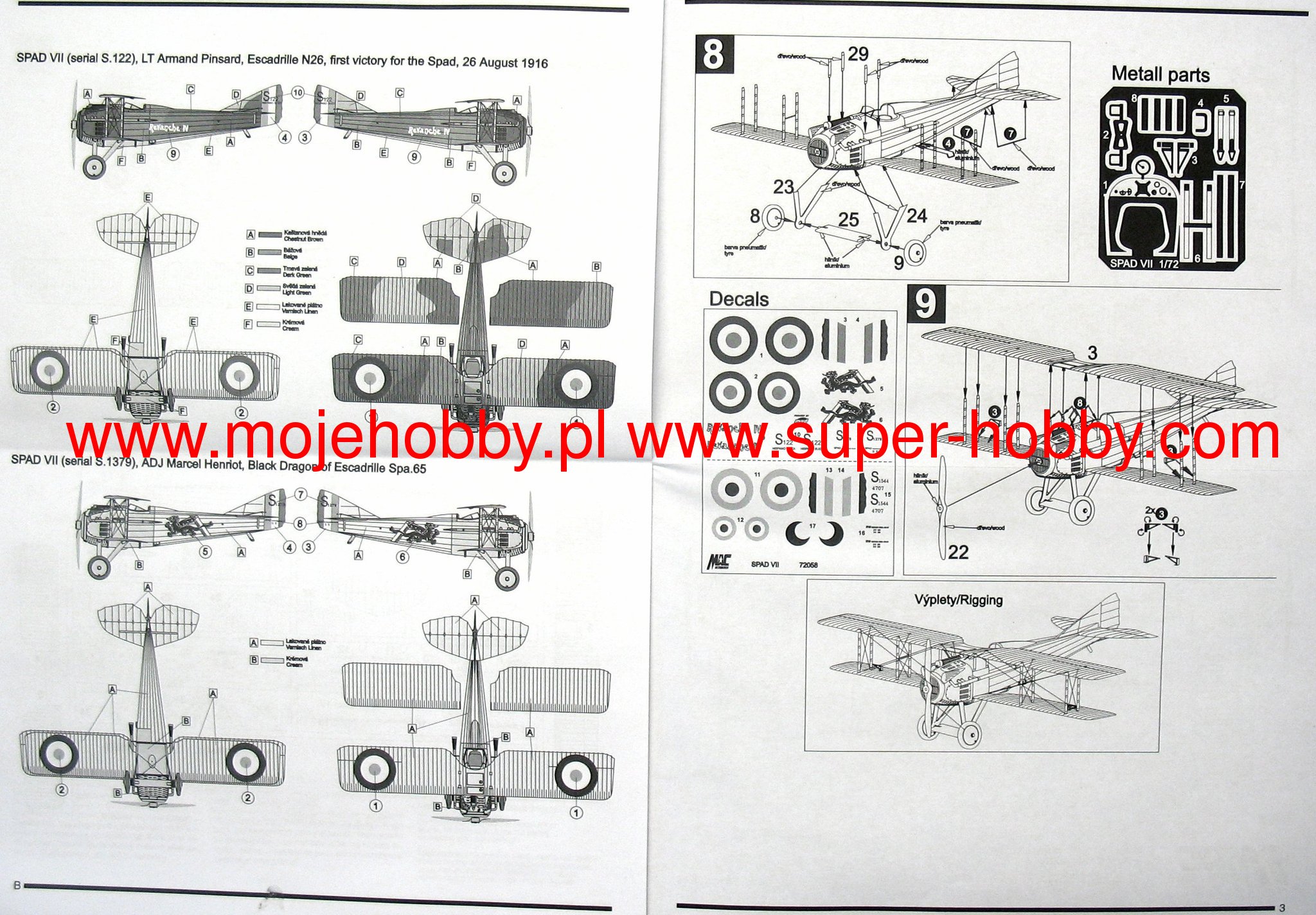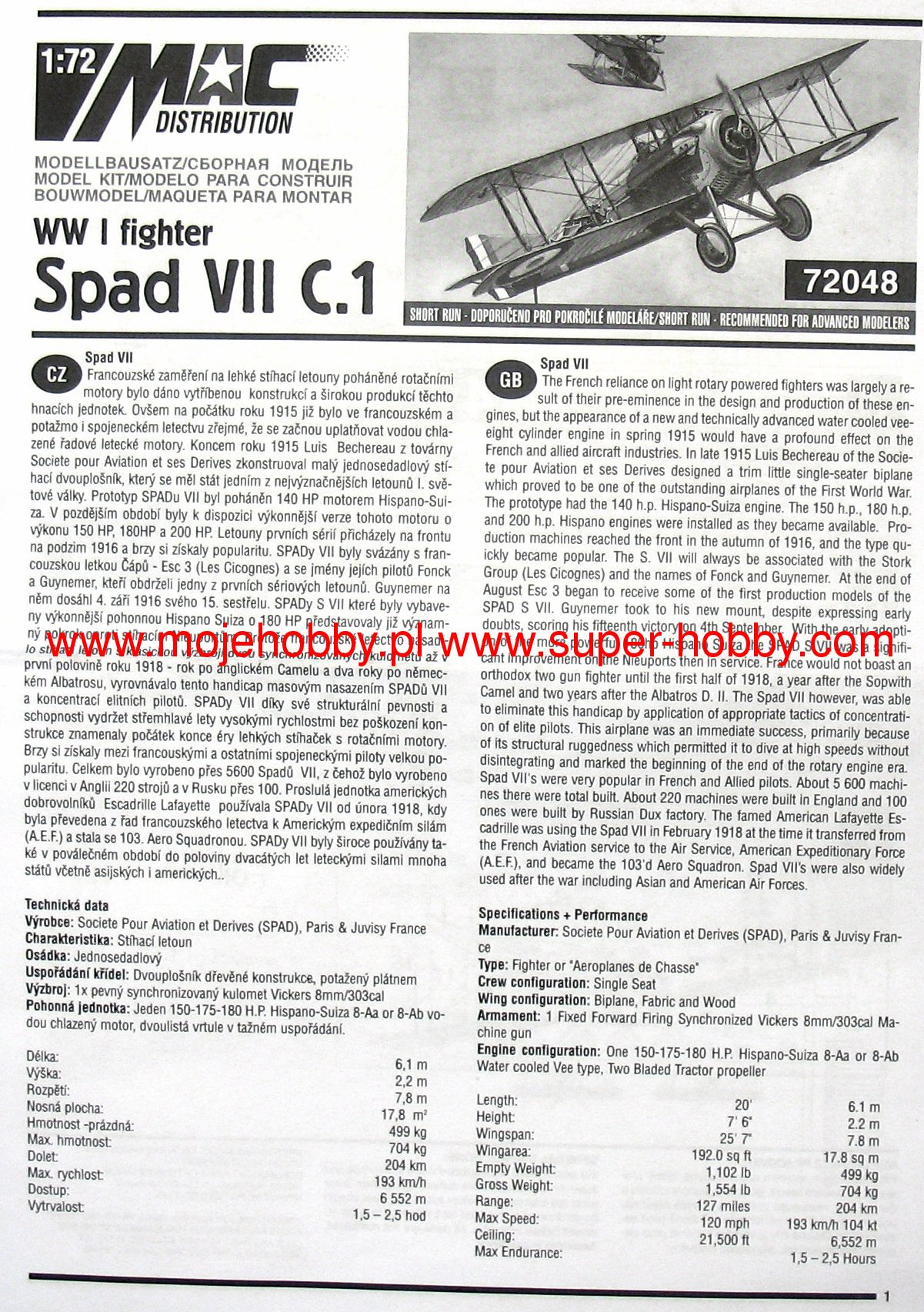 The SPAD VII plane is a French, single-engine fighter plane in a biplane system with a wooden structure covered with canvas. The flight of the prototype took place in May 1916, and serial production continued in the years 1916-1917. The creator of the machine was Eng. Louis Bechereau. The machine was powered by a Hispano-Suiza 8Ba V-engine with high efficiency and low weight. Ultimately, after many improvements, the engine obtained 180HP. The machine turned out to be fast, had very good flight characteristics, was durable and its only drawback was not the best maneuverability, especially compared to the Niueport 17. The machine was exported min. to Russia, Great Britain, Italy and Belgium. Technical data: length: 6.08 m, wingspan: 7.81 m, height: 2.2 m, maximum speed: 192 km / h, practical ceiling: 5330 m, maximum range: 360 km, armament: fixed - 1 machine gun cal.7, 7mm.