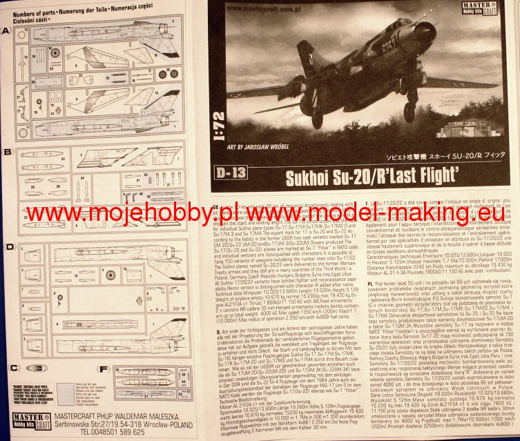 Су-20 советский истребитель-штурмовик с изменяемой геометрией крыла, экспортный вариант Су-17. Оба самолета (Су-17 и Су-20) были очень похожи друг на друга. Однако они различались используемым приводом на Су-20 применялся двигатель Лулька АЛ-21Ф. В СССР такая модернизация Су-17 получила обозначение Су-17М, который в качестве экспортного самолета обозначался как Су-20. Также был создан разведывательный вариант - Су-20Р. Эта машина была впервые продана в Польшу (с 1974 г.), где служила в составе 7-й бомбардировочно-разведывательной бригады в Повидзе. В ходе эксплуатации польская авиация адаптировала свои самолеты Су-20 для перевозки разведывательных контейнеров ККР. Технические данные: длина: 19,02м, размах крыла (со сложенными крыльями): 10,02м, высота: 5,1м, максимальная скорость: 1,7Ма, скороподъемность: 230м/с, максимальная дальность: 2250км, вооружение: стационарное - 2 НР-30 30-мм орудия, подвесные до 4070 кг груза.Примечание: Mistercraft часто меняет наклейки, поставляемые с моделями, без предварительного уведомления, и они могут отличаться от фотографий и описаний на нашем веб-сайте. Если вам нужна конкретная версия, сообщите нам об этом, введя соответствующий комментарий в поле для комментариев при размещении заказа.