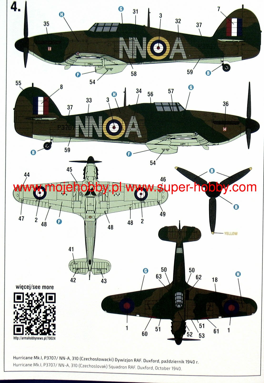 Описание В набор входят: - пластиковые детали, - декаль для четырех вариантов окраски и маркировки (два полных комплекта государственной и эксплуатационной маркировки), - шаблон для вырезания масок кабины из маскировочной ленты. Варианты окраски: 2 польских ВВС, 1 х Чехословакии и 1 х американских добровольцев: - Hurricane Mk.I V7118