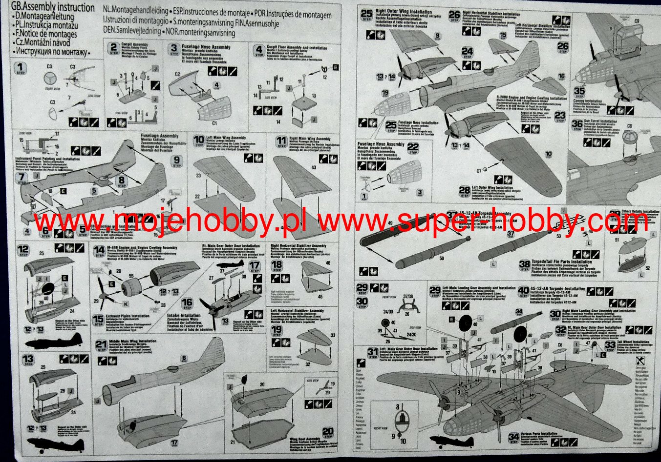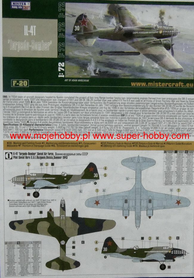 Note: Comany Mistercraft frequently changes, without any notice, the decals that come with the model, so they may differ from the photos and descriptions on our website. If you need a specific version, please let us know about that by entering the appropriate notice in the comments field when placing the order. Ilyushin Ił-4 (DB-3F) is a Soviet, twin-engine, low-wing medium bomber from the Second World War. The Il-4 was a far-reaching modernization of the DB-3 aircraft. The changes concerned, inter alia, the structure of the airframe and wing and, above all, the use of duralumin instead of steel on a much larger scale. The flight of the Il-4 machine took place in 1940, and it entered service a year later. Serial production continued until 1944. In its course, there were also further improvements - self-sealing fuel tanks, the use of protective weapons with a larger caliber, and above all the use of Tumanski M-88B 14-cylinder engines with a capacity of 1100 HP, in place of the Tumanski M-88 engines with a capacity of 1000 HP. Ilyushin Il-4 was the primary medium bomber of the Soviet Air Force throughout the war. It was used in many operations on the Eastern Front, especially in the period 1942-1943, as well as in several propaganda bombing raids over Berlin. The Il-4T aircraft was also used as a long-range torpedo bomber. About 5256 copies of this machine were produced globally. Technical data: length: 14.76m, wingspan: 21.44m, height: 4.1m, maximum speed: 410km / h, rate of climb: 6.9m / s, maximum range: 3800km, maximum ceiling 8700m, armament (early production series): fixed - three 7.62 mm SzKAS machine guns, suspended - up to 2700 kg of bombs.