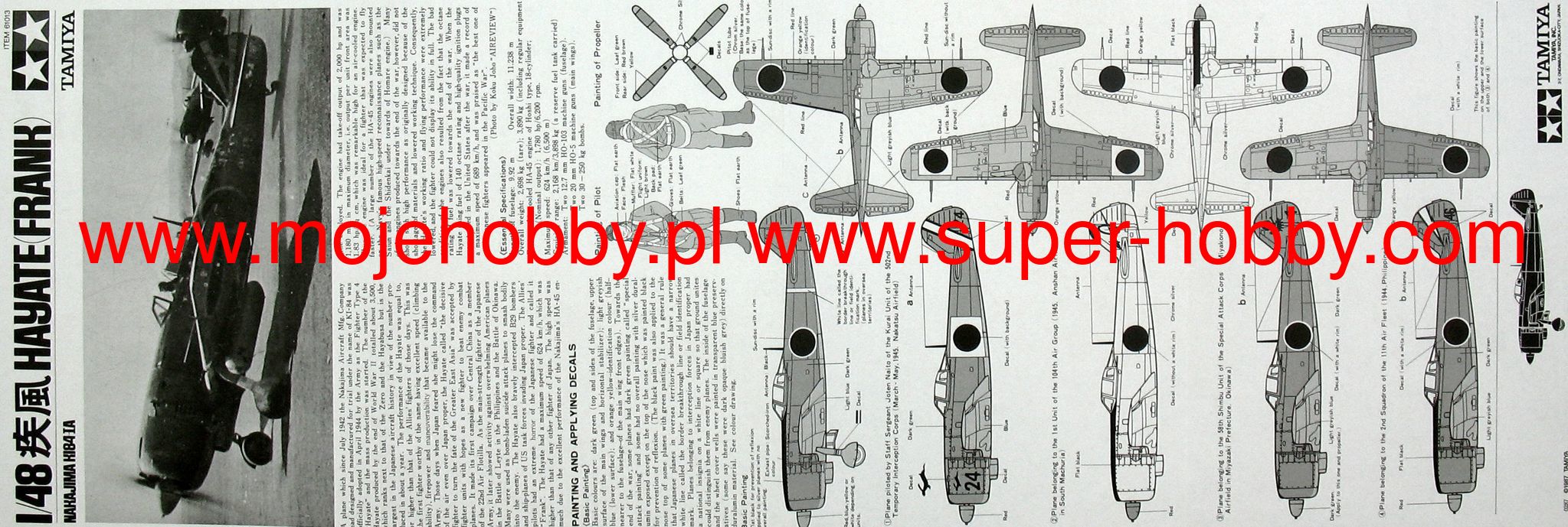 Nakajima Ki-84 Hayate (яп. Windstorm) японский одномоторный одноместный истребитель полукорпусной цельнометаллической конструкции с низкорасположенным крылом. Полет прототипа состоялся в апреле 1943 г., а с 1944 г. машина поступила в строй. Ki-84 был самым важным японским истребителем в конце войны, с отличными летными характеристиками, максимальной скоростью и маневренностью. Он смог без проблем вступить в равную борьбу с машинами союзников. Кроме того, в отличие от гораздо более известного Зеро, он имел хорошую броню, мощное стрелковое вооружение и самоуплотняющиеся топливные баки, что делало его очень опасным противником. Основной серийной версией является Ki-84-I с несколькими модификациями, оснащенными двигателями Nakajima Ha-45 различных моделей, из которых наиболее широко применялся 23-й (1900 л.с.). Ki-84 этой серии обслуживал мин. в Китае, Окинаве и защищал Японские острова от ударов с воздуха союзников. Стоит отметить, что на закате войны были предприняты попытки заменить дефицитный алюминий деревом или сталью, но такие варианты Ки-84 так и не производились в больших количествах. Всего было выпущено 3514 экземпляров Ки-84. Технические данные: длина: 9,93м, размах крыла: 11,23м, высота: 3,38м, максимальная скорость: 687км/ч, скороподъемность: 19,3м/с, максимальная дальность: 2150км, максимальный потолок 10500м, вооружение: постоянное -2 12,7мм Пулеметы Хо-103 и 2 20-мм пушки Хо-5, подвесные до 500 кг бомб.