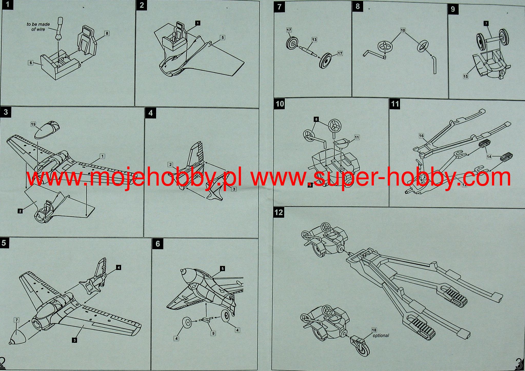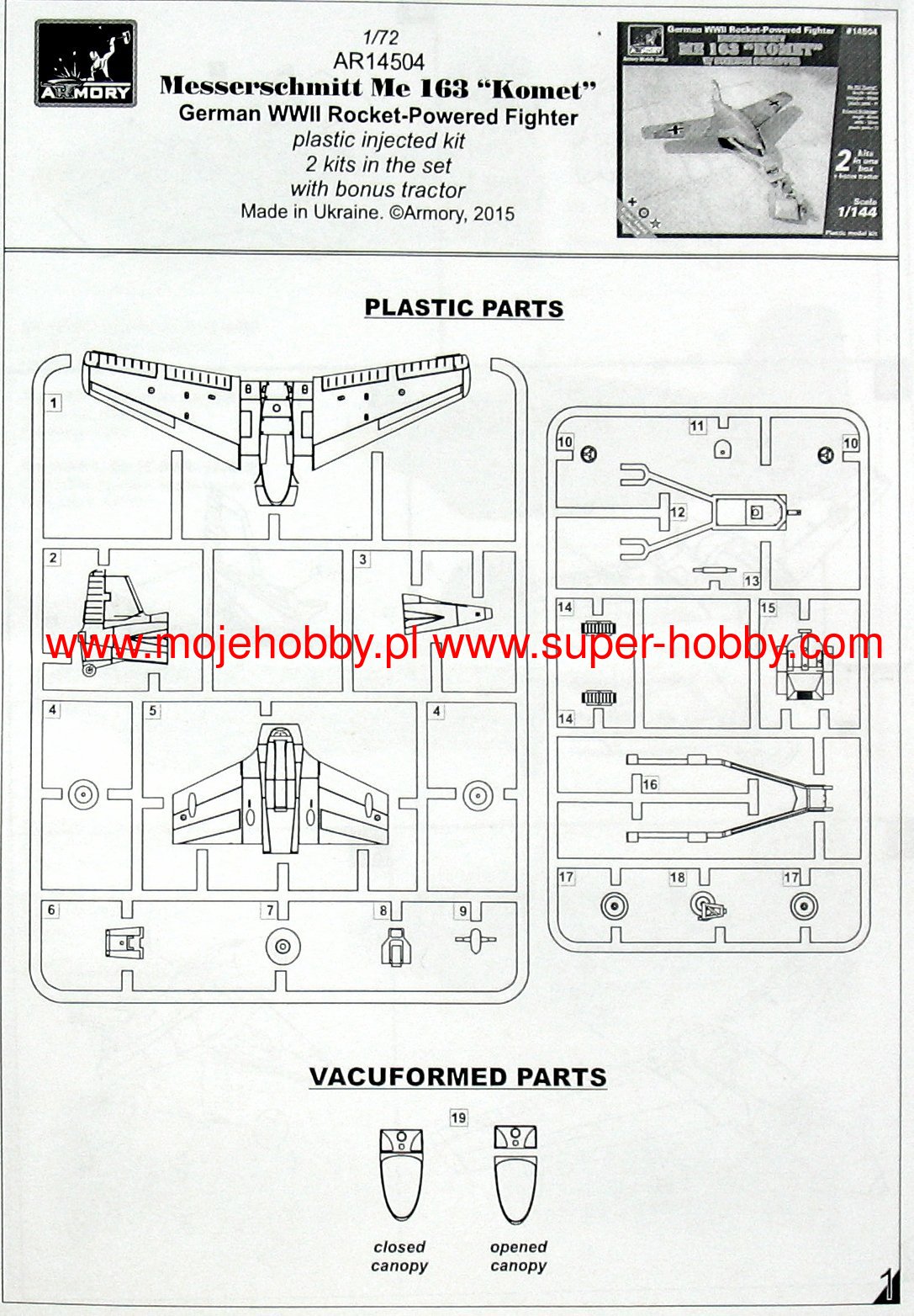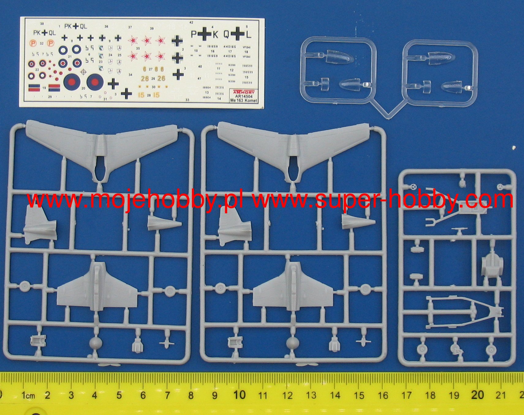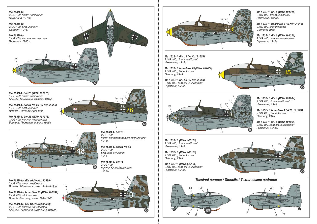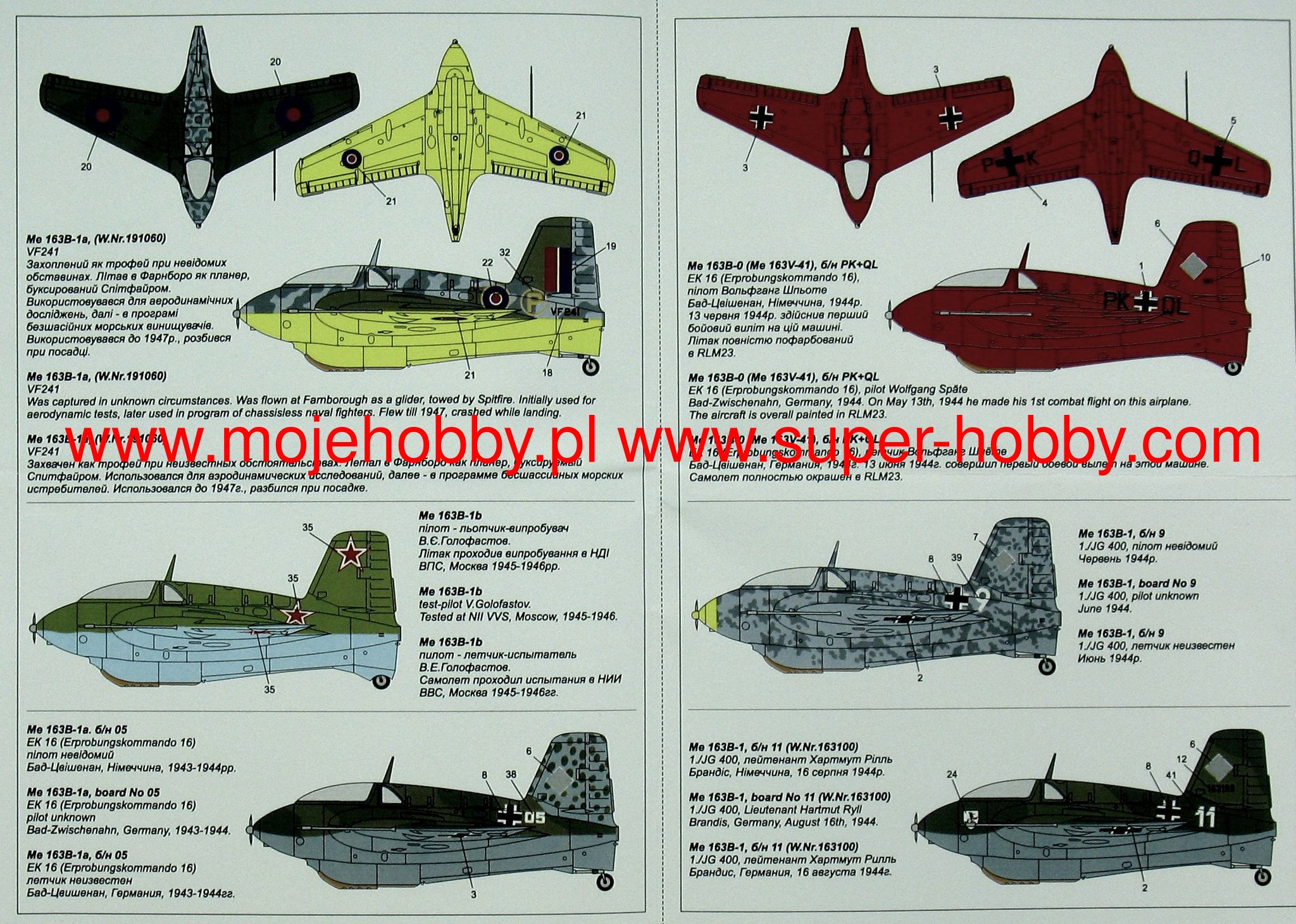 The Messerschmitt Me-163 Komet is a German rocket-powered fighter in a tailless mid-wing system with oblique wings and a mixed design. The flight of the prototype took place on February 13, 1941, but the entry into the line units took place only in 1944. The beginnings of the Me-163 date back to gliders and tailless airplanes constructed by prof. Lippisch, and especially DFS-194. It was this design that formed the basis of the Me-163A. The first flight of this machine with a rocket engine took place in 1941, and the engine was Walter HWK R.II. The following years are the time of trials and tests with a revolutionary design and the same drive. A new engine was also used - Walter HWK 109-509B-1. The first unit to fly the Me-163 was the 16th Experimental Unit, and shortly thereafter also the Group from the Jagdgeschwader 400. Their task was to develop tactics and undergo training on new machines. The first combat use took place in July 1944. Until the end of the war, these machines were used as fighters to intercept Allied bombers. In total, there were about 280 aircraft of this type in the line. The Me-163 was undoubtedly a revolutionary machine - the new propulsion and unusual shape made it a very characteristic aircraft with a considerable maximum speed, exceeding the performance of allied aircraft. However, it should be remembered that it was difficult to pilot, after landing it was completely defenseless and could operate rather from paved runways. In addition, the fuel mixture tended to self-ignite. One should also remember about the dramatically short range, which effectively limited its combat use. Technical data (version Me-163B): length: 5.98m, wingspan: 9.33m, height: 2.75m, maximum speed: 959km / h, rate of climb: 160m / s, maximum range: 100km, maximum ceiling 12,100m , armament: fixed - two 30mm MK108 cannons.