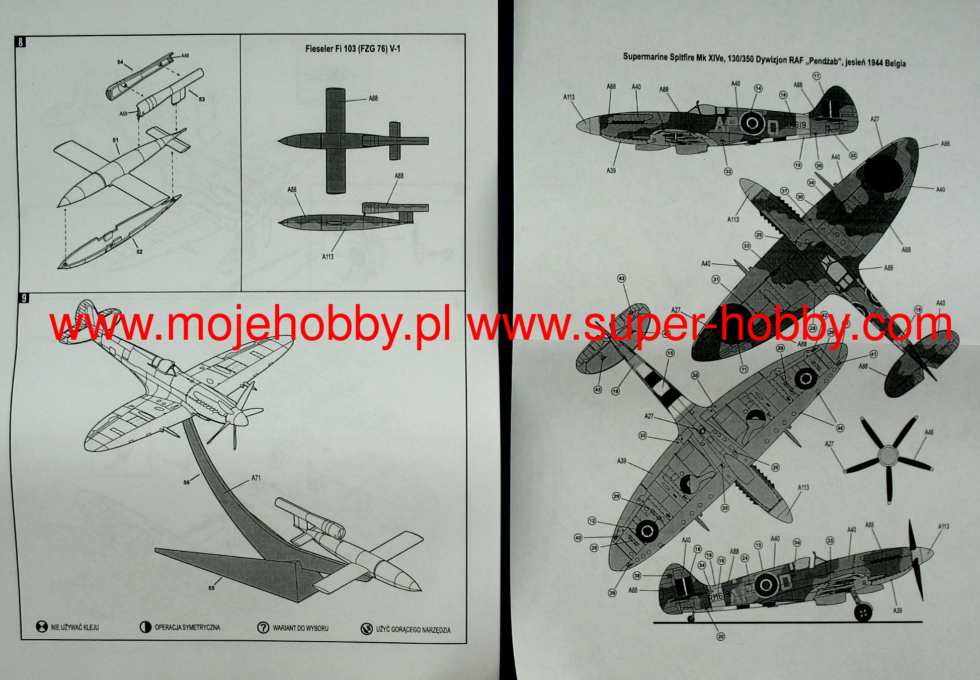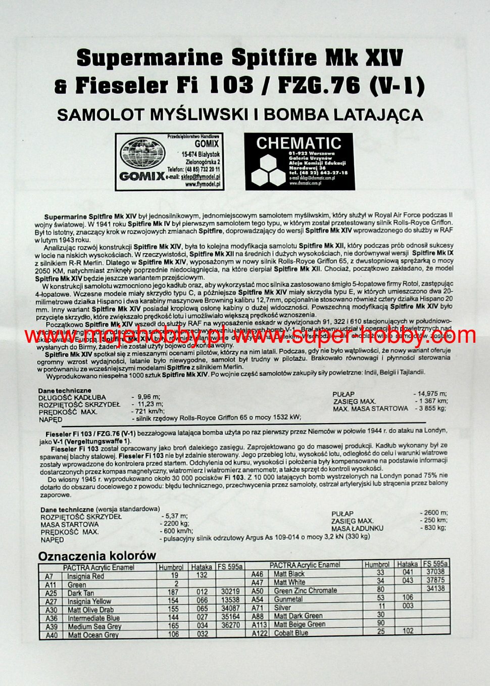Supermarine Spitfire is probably the most famous British fighter from the Second World War. It was an all-metal machine with a low wing configuration, characteristic elliptical wings, a classic tail and a retractable landing gear. The prototype flight took place on March 5, 1936. The Spitfire proved to be the RAF's staple of the war, which continued to do well after the war, remaining in production for 10 years. The history of the Spitfire began on the drawing desk of RJ Mitchell, Supermarine's lead designer. The first machines went to RAF units in 1938, but when the Battle of Britain began in the summer of 1940, there were already 19 squadrons of modern fighters at the airfields - together with the slightly older Hurricanes of the Islands, 600 aircraft were defending. With the expansion of hostilities, the Spitfire served wherever the RAF operated in the Far East, North Africa and Italy, during the Normandy landings and fighting in France, and finally during the operation in Germany in 1945. For many Britons, he became a symbol of victory in World War II. This wonderful machine has at least a dozen production versions. The most important of them are, among others the first mass-produced Spitfire Mk.I powered by a 1030hp Rolls-Royce Merlin II engine. It was above all this machine that made such an excellent contribution to the Battle of Britain. Many versions of this model have been developed, including PR Mk IA (reconnaissance version) or PR.IG (armed reconnaissance version). Another interesting version was the Spitfire Mk.V with a Rolls-Royce Merlin 45 engine with 1440HP. Later, Merlin 50 engines were also assembled. Serial production of this version started in 1941 and was the RAF's response to the appearance of the Messerschmitt Bf-109F. Another very successful version is the Spitfire Mk.IX, powered by a Merlin 61 engine with a 4-blade propeller. It was created as an opponent to the Focke-Wulf Fw-190 and was put into production at the end of 1941. This version was modified many times and, for example, in 1944 it got a new gyro sight, an enlarged rudder or a different wing system. Another major version is the Spitfire Mk.XIV with a Rolls-Royce Griffon 61 engine and a five-bladed propeller. Serial production started in October 1943. One of the last series produced was the Mk.21 version. This version had a Griffon 61 engine, a strongly reinforced structure and sheathing, the wings were extended, increasing their flying surface. Mass production started in March 1945. Technical data (Mk.XIV version): length: 9.14m, wingspan: 11.23m, height: 3.05m, maximum speed: 717km / h, rate of climb: 18.5m / s, practical ceiling: 13,200m, range maximum: 1815 km, armament: fixed - 4 7.7mm machine guns and 2 20mm Hispano Mk II cannons, suspended - up to 225 kg of bombs.A manned version of the V1 missile, Fieseler Fi 103R Reichenberg IV, intended for suicide attacks on Allied aircraft and selected targets. The suicide flight program was planned to be implemented at the end of the war in 1945. Officially, the German military authorities used the term "ramming", however, the possibility of getting the pilot out of the rocket was practically non-existent, due to the high speed and the fact that the cockpit cover was located just below the jet engine inlet, additionally tilting only 45 degrees, which made it impossible to quickly lower the rocket. cabin by the pilot and landing on a parachute. In total, 70 pilots were trained and 175 Fieseler Fi 103R Reichenberg IV machines were produced, but their practical application on the battlefield was never achieved. The Fieseler Fi 103R Reichenberg IV missile itself was almost identical to the Japanese Yokosuka MXY7 Okha, used by Japanese suicide pilots, with the difference that the Japanese pilot's cockpit was screwed down, preventing the missile from leaving during the flight, while the cockpit in the German missile gave a theoretical chance to escape, although in practice not feasible. Specifications: Length: 8m, wingspan: 5.72m, maximum speed: 800 km / h, maximum range: 330 km.