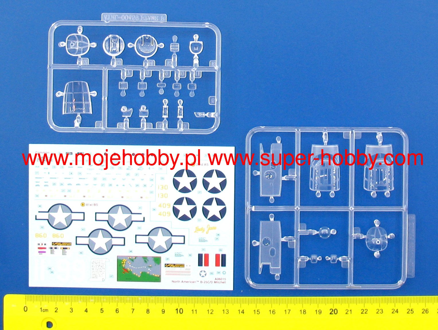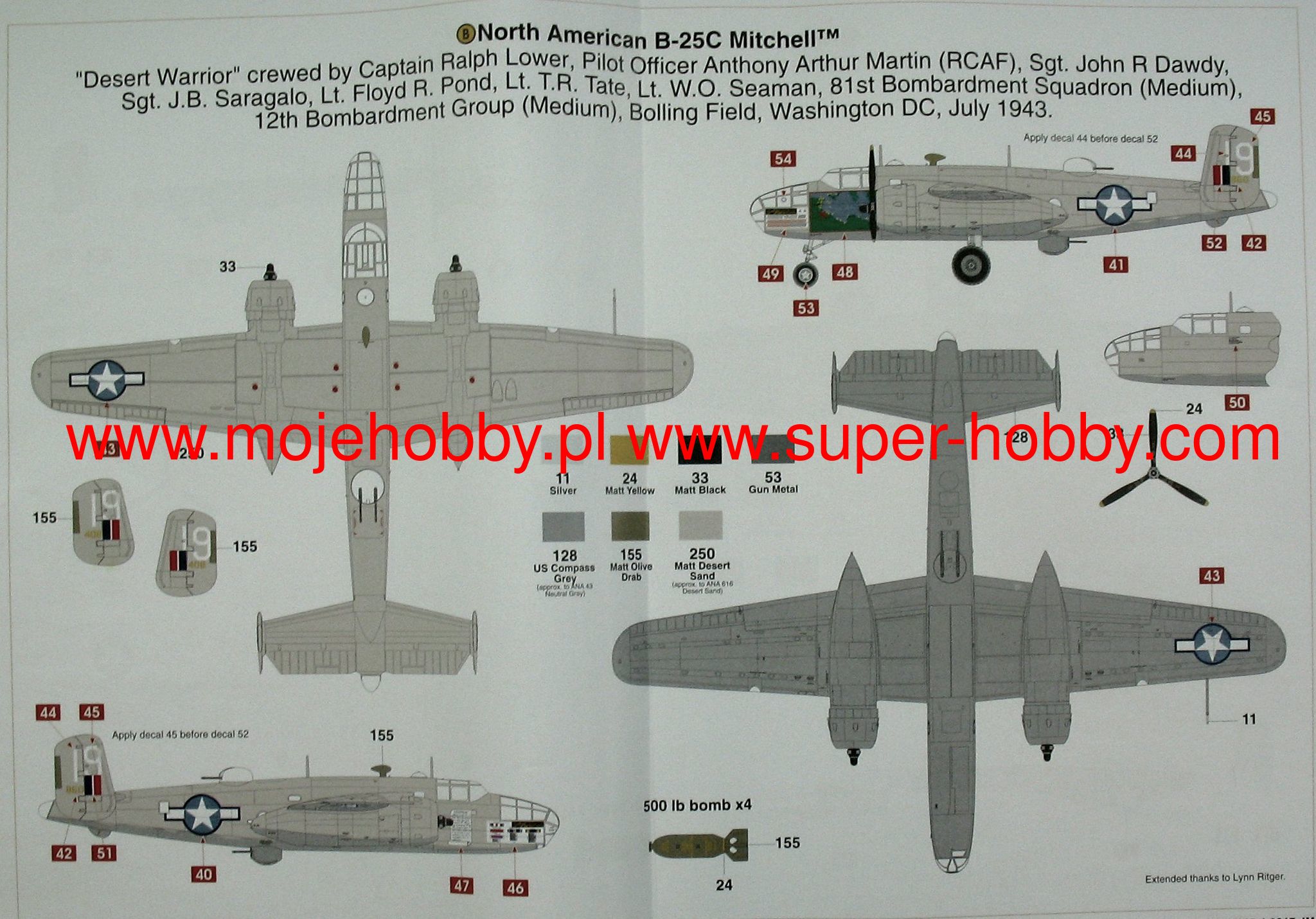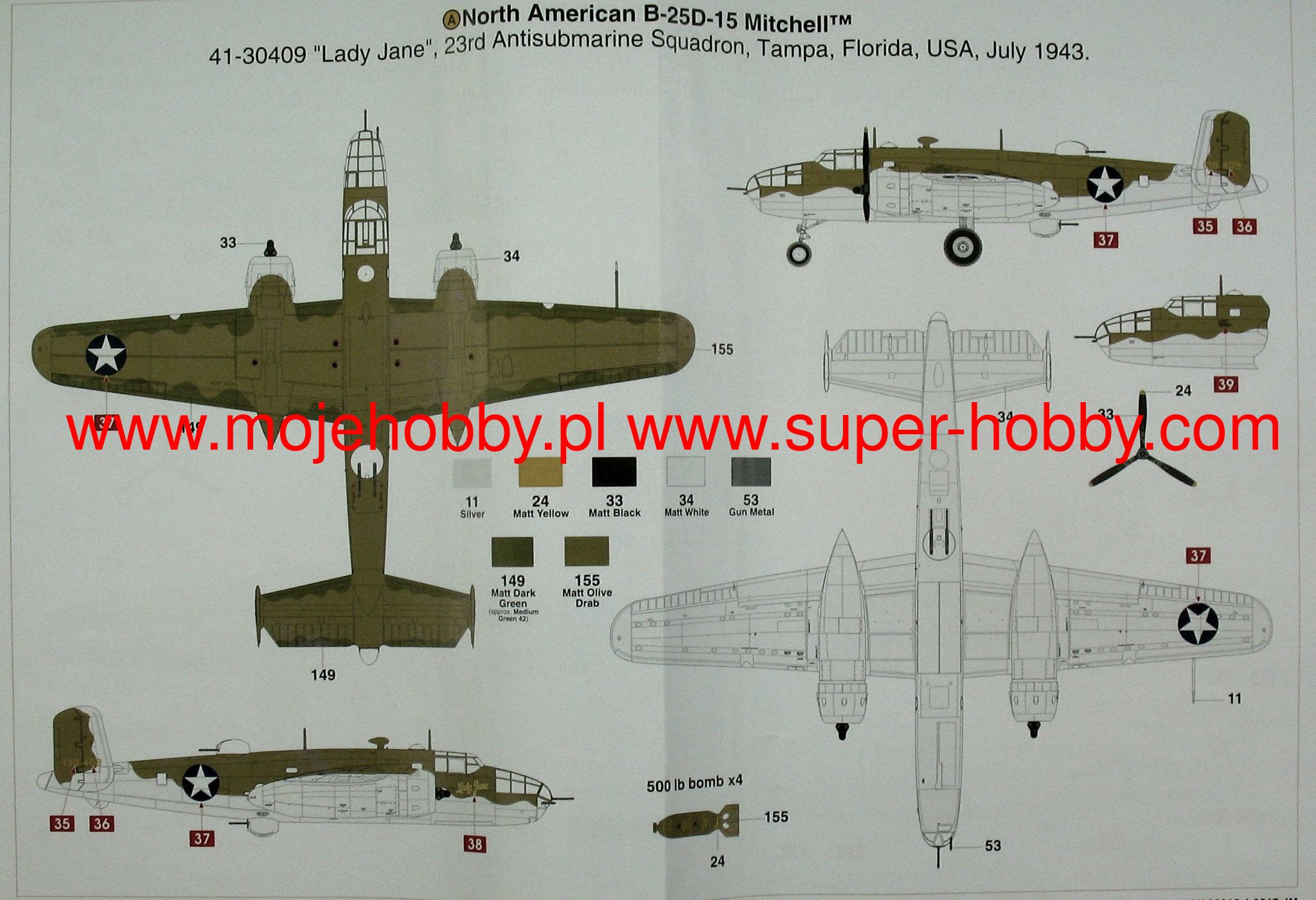 The North American B-25 Mitchell is an American medium bomber from the Second World War. The B-25 is a high-wing, all-metal structure with a retractable three-point landing gear and a double tail tail. The propulsion was two Wright Cyclon engines with the power from 1300KM to 1850KM, depending on the version. The flight of the prototype took place in 1940, and a year later mass production started. During the war, numerous versions of this bomber were produced, including B-25G (with a 75mm gun in the bow of the hull), B-25H (with a 75mm gun and 6 machine guns in the bow of the machine) and the B-25J (with 8 machine guns of 12.7mm in the bow of the fuselage). B-25 planes fought mainly in the Pacific and the Mediterranean basin. A number of them were handed over to Great Britain and the USSR under the lend-and-lease agreement, where they made their combat debut at Stalingrad. From 1943, the Polish 305 squadron flew on the B-25. The B-25 was famous primarily for its daring brave bomb attack on Tokyo in April 1942 (the famous Doolittle raid). Technical data: Maximum speed: 442 km / h, speed of climb: 4 m / s, maximum ceiling 7,600 m, maximum range: 4,300 km, armament: permanent - depending on the version, from 4 to 12 12.7mm Browning machine guns or combination of the 75 mm and km guns. suspended - up to 2700 kg of bombs.