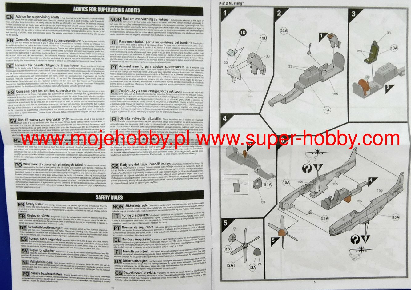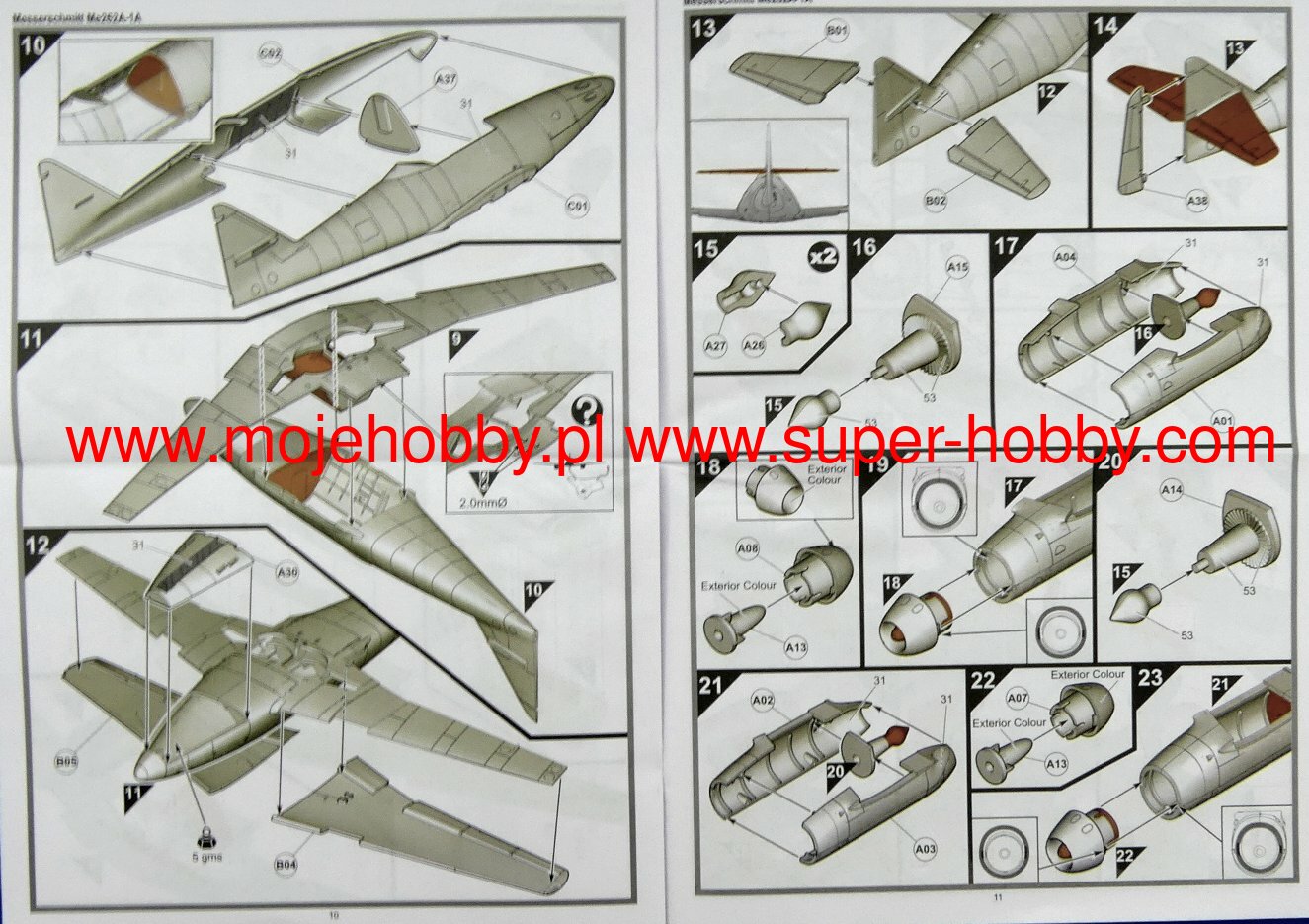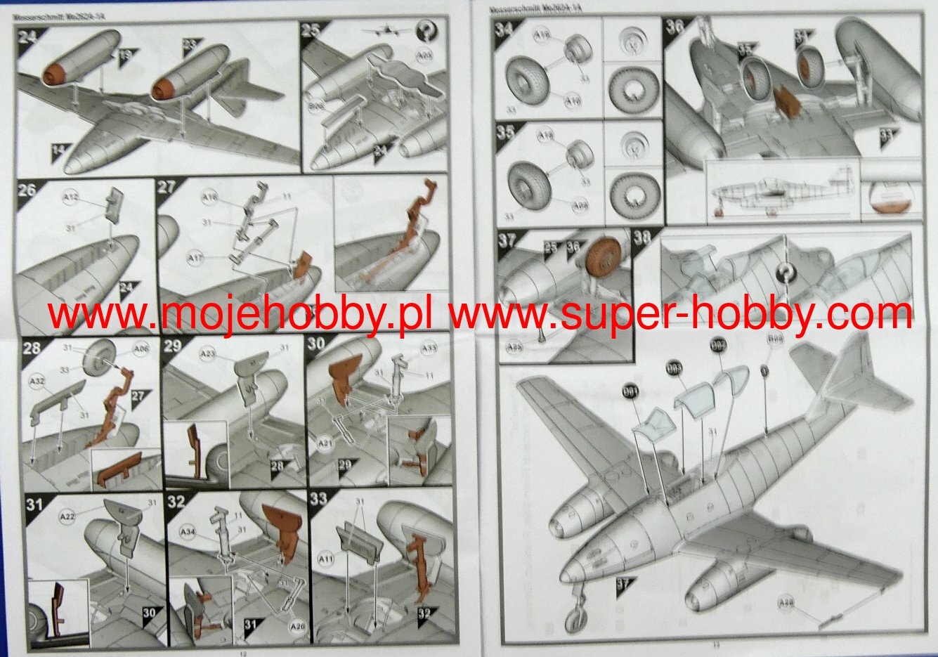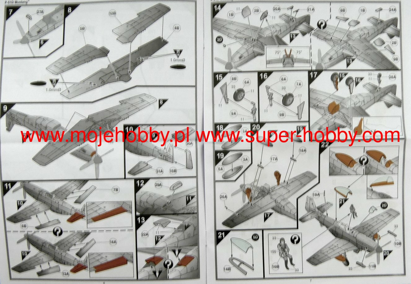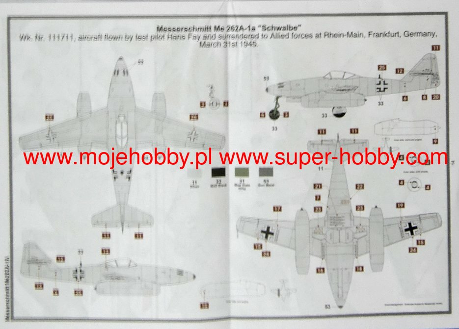 The North American P-51 Mustang is an American, single-engine, long-range fighter and attack aircraft with a classic tail and all-metal construction. The flight of the prototype took place on October 26, 1940. The P-51 Mustang has earned a reputation as one of the best, if not the best, WWII fighter. Replacing the Allison V-1710-39 engine from the first project with a Rolls-Royce Merlin motor (P-51 Mustang Mk.Ia version) made the Mustang, like never before, reached perfection. The single-seat fighter impressed with its maximum speed, range, maneuverability, and powerful weapons. The combination of all the most important parameters for the assessment of the aircraft made the Mustang prove itself in virtually every role entrusted to it: it gained air superiority, escorted, carried out reconnaissance missions, attacked ground targets. The class of design is evidenced by the fact that the Mustang remained in active service until the 70's! One of the most important versions was the P-51D, based on the P-51B. It received a drip cab fairing, ensuring excellent visibility, and a new engine - Packard V-1650-7, which significantly improved performance. Technical data (P-51D version): length: 9.83m, wingspan: 11.28m, height: 4.08m, maximum speed: 703km / h, rate of climb: 16.3m / s, maximum range: 2755km, ceiling practical: 12800m, armament: fixed - 6 12.7mm M2 machine guns, suspended - up to 908 kg of bombs or 10 127mm HVAR rocket launchers.The Messerschmitt Me-262A Schwalbe (German: swallow) is a German twin-engine fighter-bomber with a metal structure in a low wing configuration. The Me-262 was the first combat jet in the history of aviation. The first flight with piston engines took place in 1941, and with turbojet engines on July 18, 1942. The first design of the airframe, designated P.1065, was presented in 1939 and, surprisingly, differed significantly from the final version. It was quickly decided to use oblique wings and test the airframe in flight with piston engines (Jumo210), which was successfully completed in 1941. As a result of problems with the target power unit (BMW003 engine), the first jet flight on the Me-262 took place with Junkers Jumo004 engines. Interestingly, the Me-262 was structurally ready for serial production at the end of 1942. However, his entry into the line was significantly delayed. Firstly, due to material deficiencies (especially tungsten and chrome deficiencies), which forced technological changes, secondly, because of the failure of the BMW003 engines, and third, because of Hitler's resistance to the Me-262 being a fast bomber, not a fighter. As a result of all factors, the plane entered the line only in 1944! Given the already overwhelming advantage of the Allies in the air, the shortage of fuel and trained crews of the Me-262 could not have had a major impact on the course of the war. Undoubtedly, it was technologically superior to enemy aircraft, and the loss ratio was 1: 9 in favor of the Me-262. A total of about 1,400 machines were built, but only about 300 entered service. Several development versions of this revolutionary aircraft were created: a bomber (A-2a), reconnaissance (A-1a / U3 and A-4a), day fighter (A-1a) and night fighter (B-1a / U1). Technical data (version Me-262A-1a): length: 10.6m, wingspan: 12.6m, height: 3.5m, maximum speed: 900km / h, speed of climb: 20m / s, maximum range: 1050km, ceiling maximum 11450m, armament: fixed - 4 30mm MK108 cannons, underslung - 24 R4M rockets, 55mm caliber, up to 1000 kg of bombs.