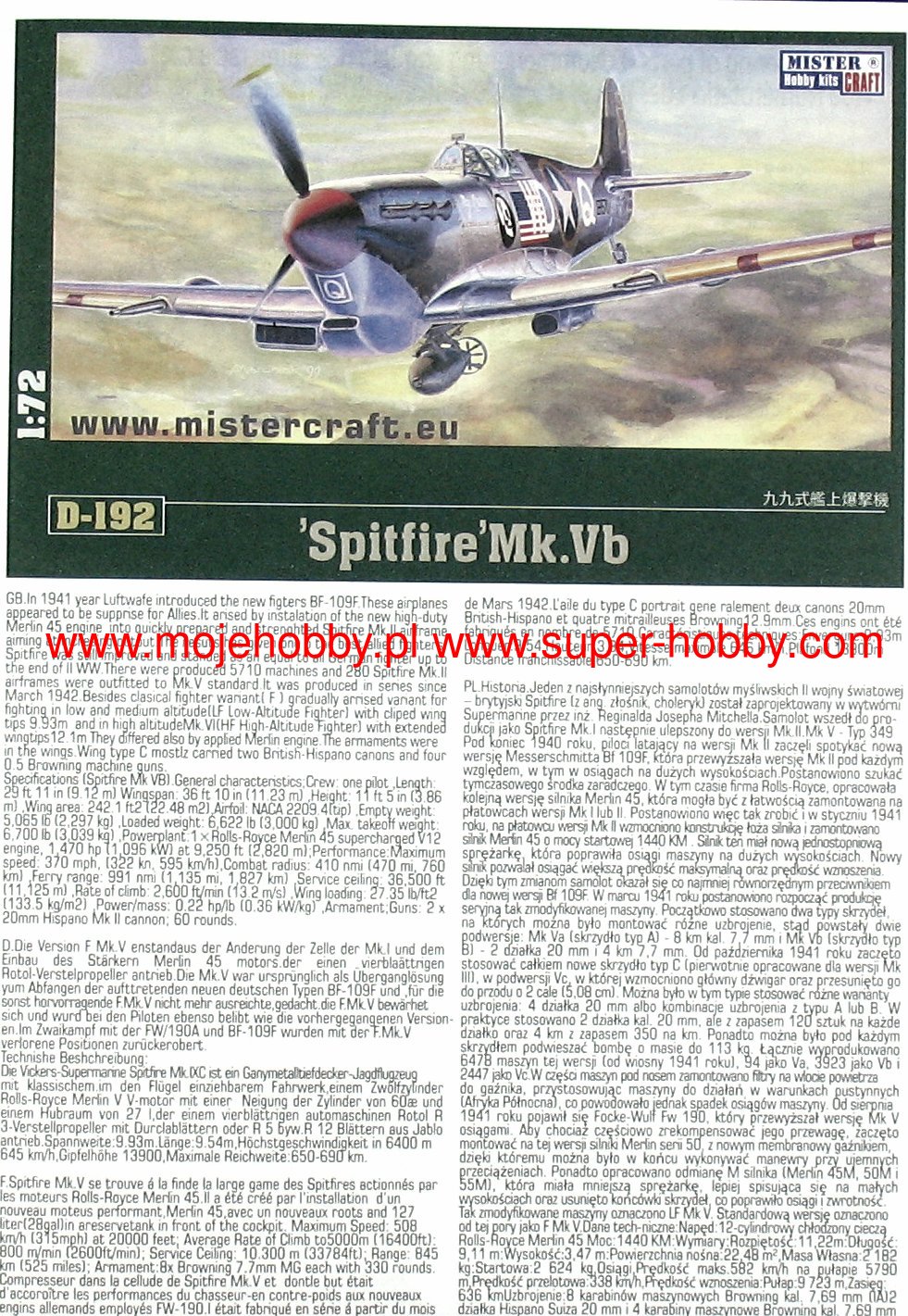 Note: Comany Mistercraft frequently changes, without any notice, the decals that come with the model, so they may differ from the photos and descriptions on our website. If you need a specific version, please let us know about that by entering the appropriate notice in the comments field when placing the order. Supermarine Spitfire is probably the most famous British fighter from the Second World War. It was an all-metal machine with a low wing configuration, characteristic elliptical wings, a classic tail and a retractable landing gear. The prototype flight took place on March 5, 1936. The Spitfire proved to be the RAF's staple of the war, which continued to do well after the war, remaining in production for 10 years. The history of the Spitfire began on the drawing desk of RJ Mitchell, Supermarine's lead designer. The first machines went to RAF units in 1938, but when the Battle of Britain began in the summer of 1940, there were already 19 squadrons of modern fighters at the airfields - together with the slightly older Hurricanes of the Islands, 600 aircraft were defending. With the expansion of hostilities, the Spitfire served wherever the RAF operated in the Far East, North Africa and Italy, during the Normandy landings and fighting in France, and finally during the operation in Germany in 1945. For many Britons, he became a symbol of victory in World War II. This wonderful machine has at least a dozen production versions. The most important of them are, among others the first mass-produced Spitfire Mk.I powered by a 1030hp Rolls-Royce Merlin II engine. It was above all this machine that made such an excellent contribution to the Battle of Britain. Many versions of this model have been developed, including PR Mk IA (reconnaissance version) or PR.IG (armed reconnaissance version). Another interesting version was the Spitfire Mk.V with a Rolls-Royce Merlin 45 engine with 1440HP. Later, Merlin 50 engines were also assembled. Serial production of this version started in 1941 and was the RAF's response to the appearance of the Messerschmitt Bf-109F. Another very successful version is the Spitfire Mk.IX, powered by a Merlin 61 engine with a 4-blade propeller. It was created as an opponent to the Focke-Wulf Fw-190 and was put into production at the end of 1941. This version was modified many times and, for example, in 1944 it got a new gyro sight, an enlarged rudder or a different wing system. Another major version is the Spitfire Mk.XIV with a Rolls-Royce Griffon 61 engine and a five-bladed propeller. Serial production started in October 1943. One of the last series produced was the Mk.21 version. This version had a Griffon 61 engine, a strongly reinforced structure and sheathing, the wings were extended, increasing their flying surface. Mass production started in March 1945. Technical data (Mk.XIV version): length: 9.14m, wingspan: 11.23m, height: 3.05m, maximum speed: 717km / h, rate of climb: 18.5m / s, practical ceiling: 13,200m, range maximum: 1815 km, armament: fixed - 4 7.7mm machine guns and 2 20mm Hispano Mk II cannons, suspended - up to 225 kg of bombs.