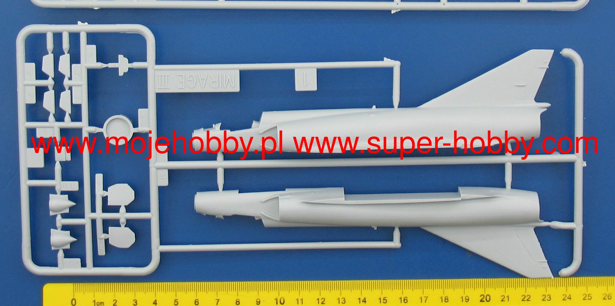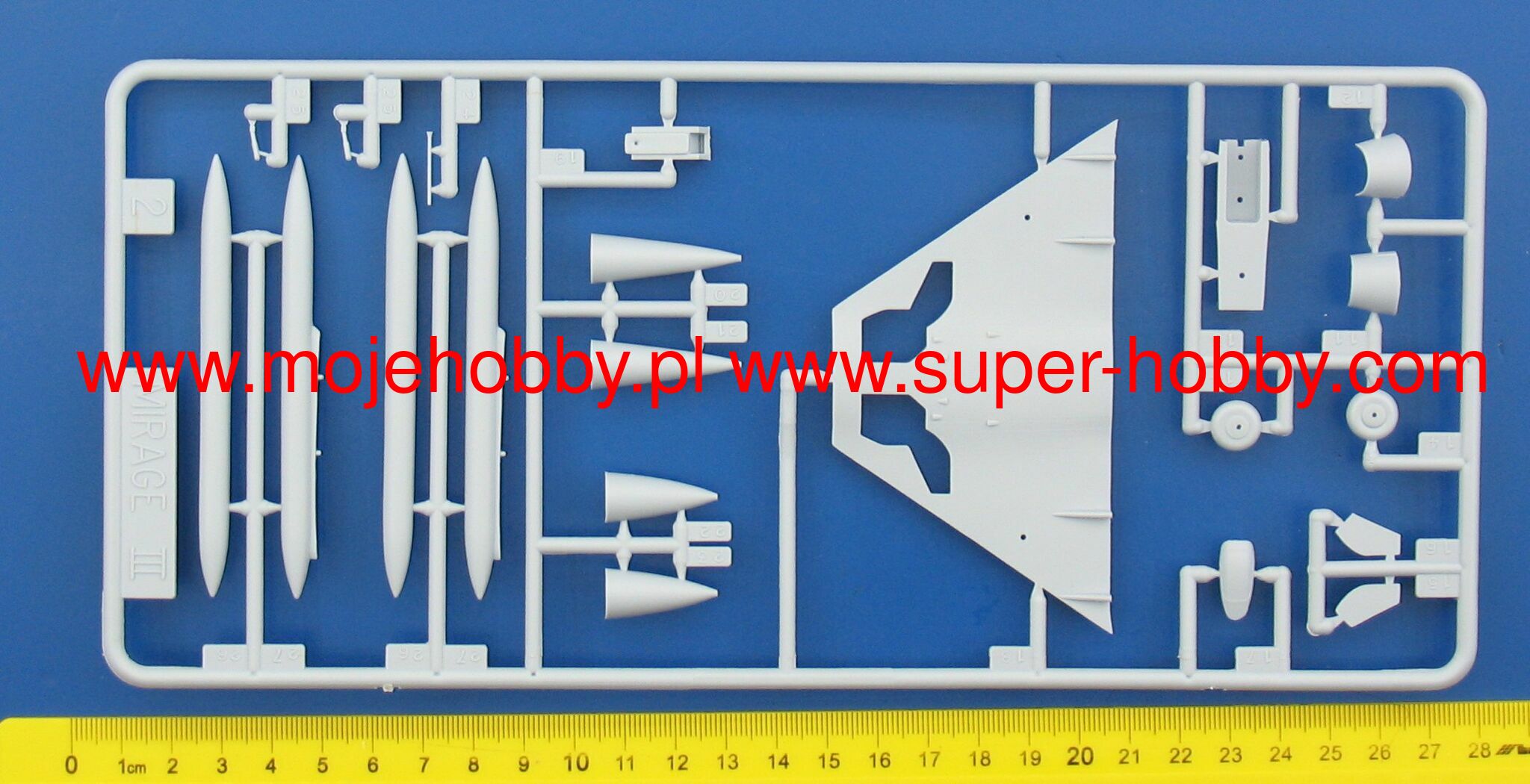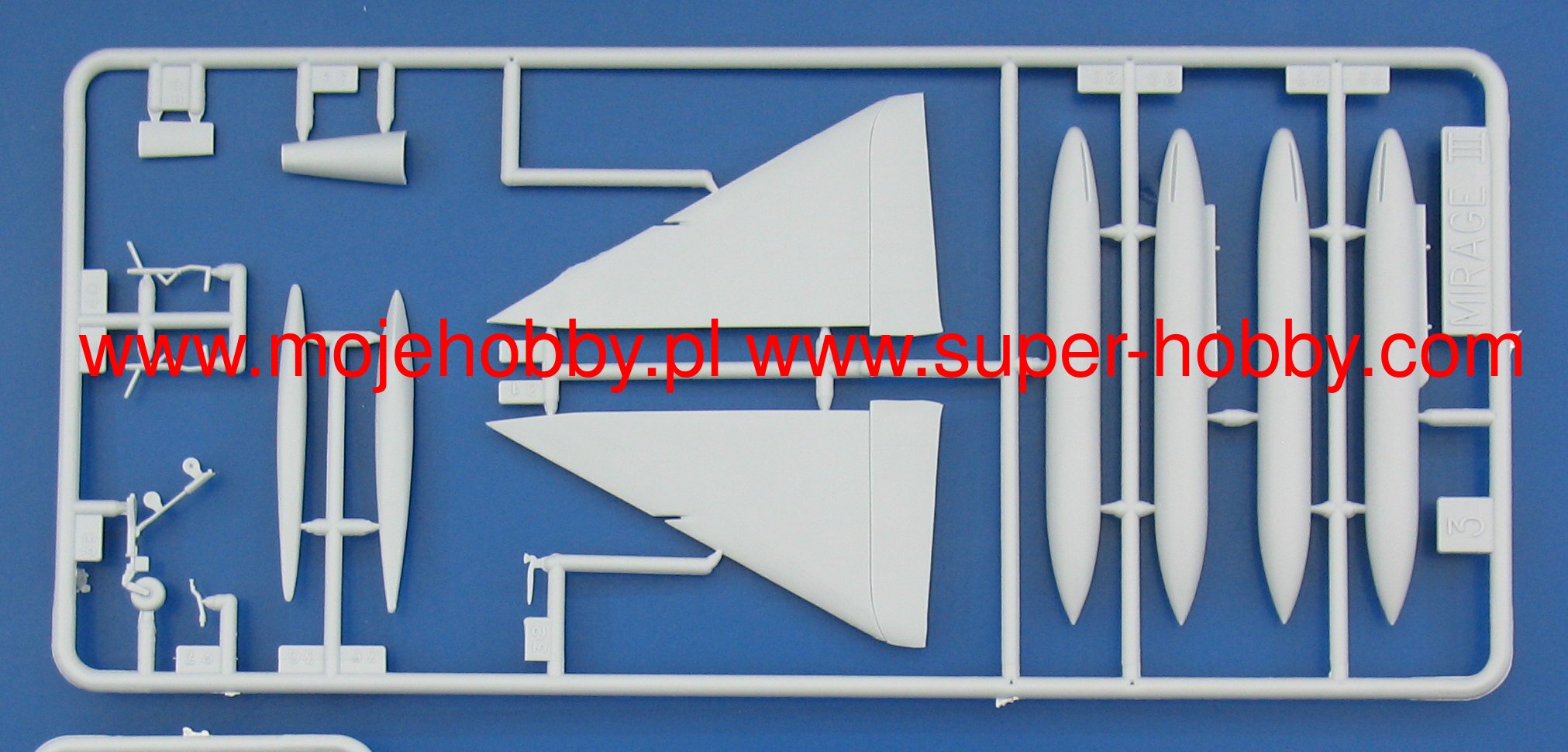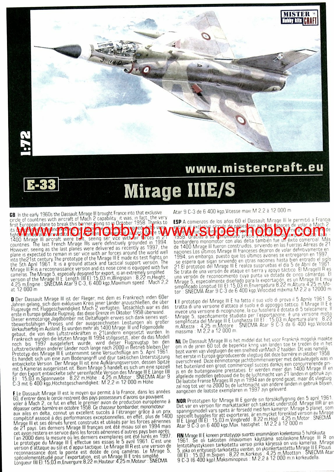 Note: Comany Mistercraft frequently changes, without any notice, the decals that come with the model, so they may differ from the photos and descriptions on our website. If you need a specific version, please let us know about that by entering the appropriate notice in the comments field when placing the order. The Dassault Mirage III / 5/50 is a French single-engine fighter-attack aircraft with a delta-shaped lobe, without horizontal tail. In late 1955, Dassault began building a single prototype that retained the delta wing and an enlarged fuselage that could accommodate one SNECMA Atar 101G1 engine. The resulting Mirage III-001 was flown on November 17, 1956, to reach a flight speed of 1.52Ma after just two months. The use of manually controlled cones in fixed side inlets and the Atar 101G2 engine with thrust increased to 4490 kg, allowed to increase the speed to 1.65Ma, and then by using the SERP rocket accelerator - to 1.8Ma. To achieve the highest speed, Dassault modified the wing and after the first flight on May 12, 1958, Mirage IIIA reached the speed of 2.2Ma with an additional rocket engine. This led to the launch of production of the two-seater training version with tandem seats - the Mirage IIIB and the single-seat interceptor Mirage IIIC. The latter version had a built-in Cyrano AI radar, and two 30mm cannons could be supported by Matra R.530 or AIM-9 Sidewinder air-to-air missiles. The next important version was the long-range Mirage IIIE fighter-bomber, with the Atar 9C engine built into a slightly extended hull. This version was equipped with the Cyrano II radar, which, in combination with the Doppler radar and the TACAN navigation system, made it possible to conduct an attack at low altitude without the target's visibility in all weather conditions. Modification programs Mirage III (and derivatives V and 50) include the installation of modern navigation systems, weapons control and adaptation to modern types of weapons. The second area of modification is the installation of Atar 9K-50 engines with a thrust greater by about 20%, adaptation to centralized refueling under pressure and refueling during the flight, installation of zero-zero class catapult seats, improved visibility from the cabin, installation of front control surfaces increasing maneuverability in air combat, adaptation to carrying containers, e.g. for electronic warfare, laser target marking, recognition or infrared imaging of targets. Technical data (version IIIC): length: 14.77m, wingspan: 8.22m, height: 4.25m, maximum speed: 2.2Ma, climb speed: 83m / s, maximum range (with additional tanks): 4000km, maximum ceiling 17000m, equipment: fixed - two 30mm DEFA 552 cannons, suspended (Mirage 5) - up to 4200 kg of cargo.