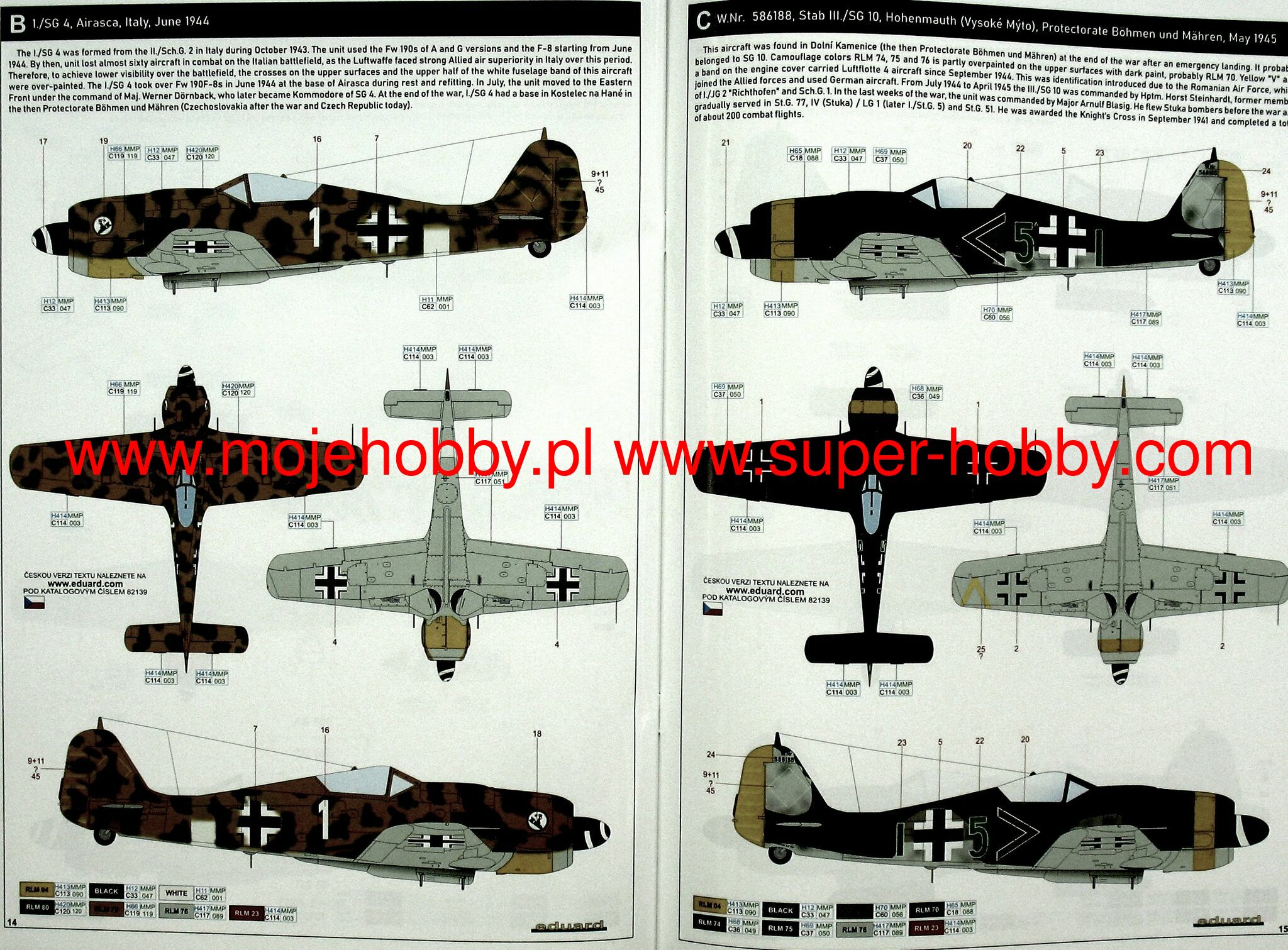 The Focke-Wulf Fw-190 is a German, single-engine, full-metal fighter aircraft with a covered cabin in the low wing design of the Second World War. The pilots considered the Fw-190 to be a better aircraft than the Messerschmitt Bf-109. A self-supporting low wing with a working Fw-190 coating was commissioned by the Luftfahrtministerium, assembled in the fall of 1937. Kurt Tank submitted two propulsion proposals - the first with a liquid-cooled Daimler-Benz DB 601 engine, and the second with the new BMW 139 radial engine. The latter was chosen, and the work started in the spring of 1938 was headed by Obering R. Blaser. The first prototype of the Fw-190V1 was ready in May 1939, and it was flown in Bremen on June 1, 1939 by Captain Hans Sander. The second prototype, the FW-190V2, armed with two MG131 and two MG17 machine guns - all 7.92 mm caliber, was flew in October 1939. To reduce aerodynamic drag, both were equipped with a tunnel air inlet in the propeller cap, but problems with overheating of the engine resulted in a return to the proven NACA shield design. Before the tests of these prototypes began for good, the decision was already made to replace the BMW 139 engine with a stronger, but longer and heavier BMW 801. It required many changes, strengthening the structure and moving the cabin back, which later became a source of problems with the center of gravity. The advantage was the removal of problems with exhaust gas permeation and overheating of the cabin interior due to its direct vicinity to the BMW 139 engine. The third and fourth prototypes were abandoned, and the Fw-190V5 with the new engine was completed at the beginning of 1940. Later, it received wings with a wingspan enlarged by one meter (from the original 9.5 m), which made it 10 km / h slower, but it increased the rate of climb and improved maneuverability. It was marked Fw-190V5g, and the variant with the shorter wing was Fw-190V5k. The first seven machines of the Fw-190A-0 information series had a short wing, the rest - a longer one. The first operational unit equipped with the Fw-190 - 6./JG 26 stationed at Le Bourget, declared its operational readiness in August 1941 and from the first meeting of the new fighter with the British Supermarine Spitfire, its advantage over them became apparent. During the war, a dozen or so versions of this great plane were created. The machines of the "A" version, along with a dozen or so modernizations, served as fighter planes. The versions marked "B" and "C" were only prototypes of high-altitude fighters intended for fighting strategic bombers, but they did not enter into serial production. The "D" variant, as the only one of the Fw-190s, was powered by the new 1750HP Jumo 213A engine and was the German response to the P-51 Mustang. The new engine extended the fuselage by several dozen centimeters. This variant also performed mainly hunting and high-altitude fighter tasks. Numerous variants of the "F" version were used as fighter-bombers as direct support of the battlefield. The "G" version played the same role as the "F" version, but had a greater range. During the entire war, over 20,000 copies of this one of the best fighters of World War II were produced. Technical data (version Fw-190A-8): length: 9m, wingspan: 10.51m, height: 3.95m, maximum speed: 656km / h, rate of climb: 15m / s, maximum range: 800km, maximum ceiling 11410m , armament: fixed-2 MG131 13mm machine guns and 4 MG151 20mm cannons (2 MG 151 / 20E cannons for the D-9 version). 3_edu82139_instruction_sheet.pdf