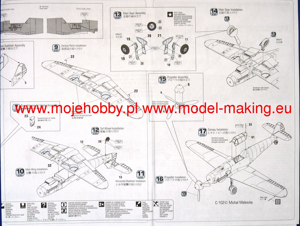 Messerschmitt Bf-109 немецкий одномоторный истребитель металлоконструкции в низкоплане с классическим хвостовым оперением. Он оказался основным и самым массовым истребителем Люфтваффе во время Второй мировой войны. Полет прототипа состоялся 29 мая 1935 года, а серийное производство продолжалось в 1936-1945 годах. Всего было произведено около 35 000 истребителей Messerschmitt Bf-109 всех модификаций, многие из которых после войны оказались в ВВС Чехии и Израиля. Корни Bf-109 восходят к объявленному в 1933 году Люфтваффе конкурсу на новый истребитель. В соревновании с He-112 проект Bf-109 сначала проиграл, но благодаря интригам Вилли Мессершмитта проект смог продолжиться, и в итоге он стал победителем конкурса, став основным истребителем Люфтваффе. В ходе производства было разработано несколько основных вариантов Bf-109. Первой предсерийной серией был Bf-109B (Berta) с различными версиями двигателя Junkers Jumo 210 (A или Da). Они испытывались в Испании с 1937 года во время Гражданской войны. Следующая версия Bf-109C (Цезарь). У них был другой двигатель, чем у версии B, и обширное вооружение, состоящее из двух 20-мм и 2-х 7,92-мм пушек HP. Эти машины также воевали в небе Испании. Третий вариант Bf-109D (Дора) с двигателем Junkers Jumo 210 Da или Daimler-Benz DB 600. Он воевал в сентябрьской кампании, но на рубеже 1939/1940 гг. известной моделью был Bf-109E (Эмиль) с двигателем Daimler-Benz 601A или N. Это был первый самолет с трехлопастным, а не с двухлопастным винтом. Bf-109E воевал во французской кампании, над Англией, в Северной Африке и на Восточном фронте. Асом, начавшим свою карьеру на Bf-109E, был знаменитый Адольф Галланд. Следующая версия Bf-109F (Фридрих), который, по мнению немецких пилотов, был наиболее аэродинамически совершенным. В нем была изменена форма фюзеляжа, крыльев, обтекателей кабины, но новый двигатель не использовался. Принят на вооружение на рубеже 1940/1941 гг. В рамках отработки конструкции в дальнейшем разрабатывались технические характеристики Bf-109, из которых в наибольшем количестве экземпляров была выпущена версия G (Gustav). Наиболее важным изменением, повышающим производительность машины, стала установка нового 12-цилиндрового двигателя Daimler-Benz DB605A мощностью 1475 л.с. Вооружение Bf-109G состояло из пары 13-мм пулеметов, расположенных в фюзеляже перед обтекателем кабины, и 20-мм пушки MG151 или более тяжелой 30-мм пушки MK108. Последней серийной модификацией стал Bf-109K (Kurfirst), производство которого началось в октябре 1944 года. В качестве двигателя использовался агрегат Daimler-Benz DB 605DB или DC. Bf-109K был самой быстрой версией, выпускавшейся во время Второй мировой войны, достигая скорости 730 км/ч. Кроме того, были созданы две версии - H и Z, но они были скорее экспериментальными версиями и их серийное производство не запускалось. Последующие усовершенствования силовой установки и вооружения сделали Мессершмитт Bf-109 одним из самых опасных истребителей Второй мировой войны и в то же время показали огромный потенциал слегка угловатого планера, созданного Вилли Мессершмиттом. Технические данные (вариант Bf-109 G-6): длина: 8,95 м, размах крыла: 9,92 м, высота: 2,6 м, максимальная скорость: 640 км/ч, скороподъемность: 17 м/с, максимальная дальность: 850 км, максимальный потолок 12000 м, вооружение: стационарное - 2 13-мм пулемета MG131 и 1 20-мм пушка MG151, подвесное - 250 кг бомб или 2 пусковые установки ракет Wfr. гр 21.Примечание: Mistercraft часто меняет наклейки, поставляемые с моделями, без п