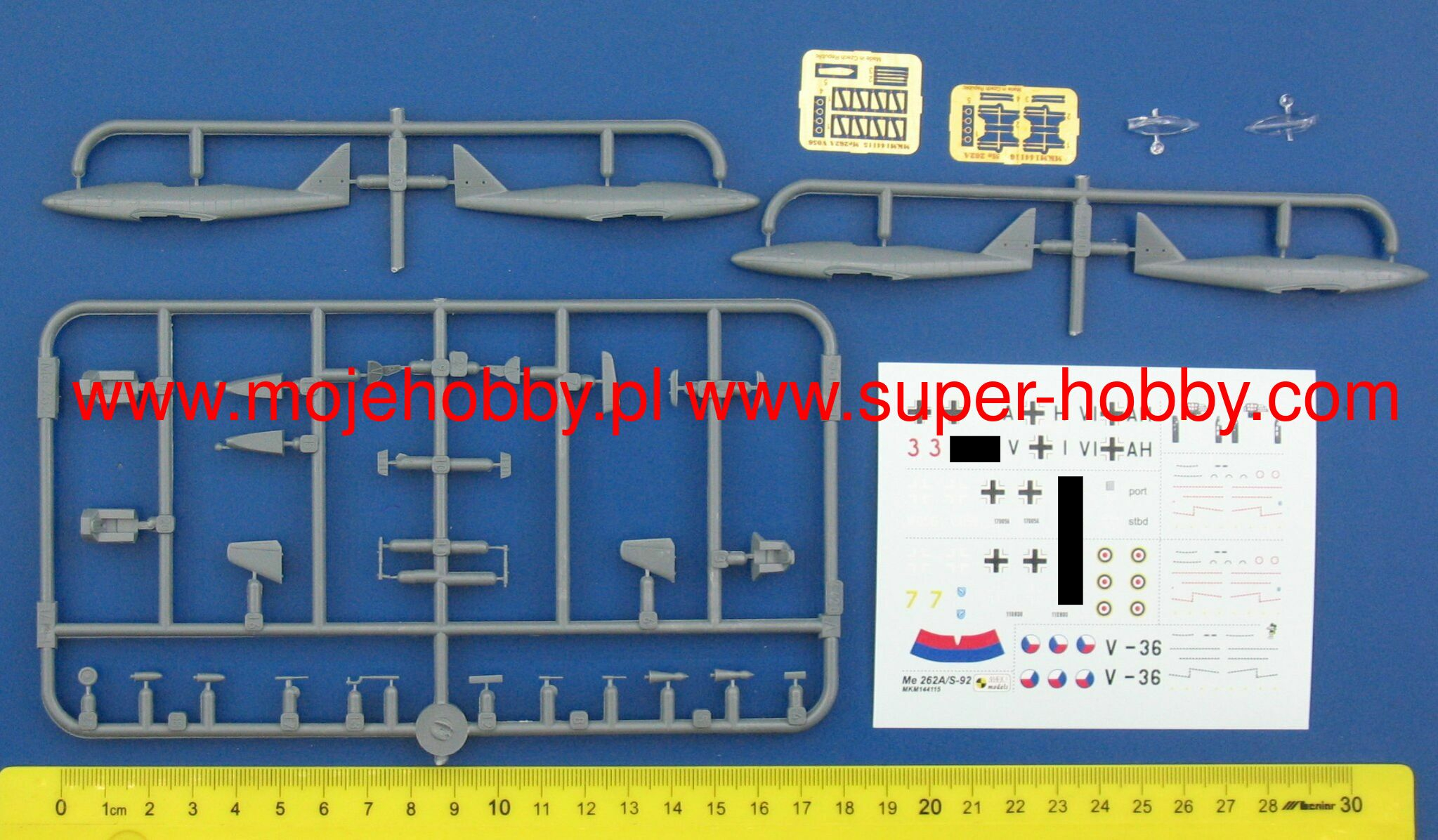 Messerschmitt Me-262A Schwalbe (нем. ласточка) немецкий двухмоторный истребитель-бомбардировщик металлической конструкции с низкорасположенным крылом. Ме-262 стал первым боевым реактивным самолетом в истории авиации. Первый полет с поршневыми двигателями состоялся в 1941 г., а с ТРД - 18 июля 1942 г. Первый проект планера, получивший обозначение Р.1065, был представлен в 1939 г. и, на удивление, существенно отличался от окончательного варианта. Быстро было решено использовать косые крылья и испытать планер в полете с поршневыми двигателями (Jumo210), что было успешно завершено в 1941 году. В результате проблем с целевой силовой установкой (двигатель BMW003) первый реактивный полет на Ме-262 состоялся с двигателями Junkers Jumo004. Интересно, что конструктивно Ме-262 был готов к серийному производству уже в конце 1942 года. Однако его вхождение в строй значительно затянулось. Во-первых, из-за недостатков материалов (особенно вольфрама и хрома), вынудивших к технологическим изменениям, во-вторых, из-за выхода из строя двигателей BMW003, и в-третьих, из-за сопротивления Гитлера тому, чтобы Ме-262 был быстрым бомбардировщиком, а не истребителем . В результате всех факторов самолет вышел на линию только в 1944 году! Учитывая и без того подавляющее преимущество союзников в воздухе, нехватка топлива и обученных экипажей Ме-262 не могла оказать серьезного влияния на ход войны. Несомненно, однако, что он технически превосходил самолеты противника, а соотношение потерь составляло 1:9 в пользу Ме-262. Всего было построено около 1400 машин, но на вооружение поступило лишь около 300. Было создано несколько вариантов развития этого революционного самолета: бомбардировщик (А-2а), разведчик (А-1а/У3 и А-4а), дневной истребитель (А-1а) и ночной истребитель (В-1а/У1). Технические данные (вариант Ме-262А-1а): длина: 10,6 м, размах крыла: 12,6 м, высота: 3,5 м, максимальная скорость: 900 км/ч, скорость набора высоты: 20 м/с, максимальная дальность: 1050 км, потолок максимальная 11450м, вооружение: стационарное 4 30-мм пушки МК108, подвесное 24 ракеты Р4М калибра 55 мм, до 1000 кг бомб.