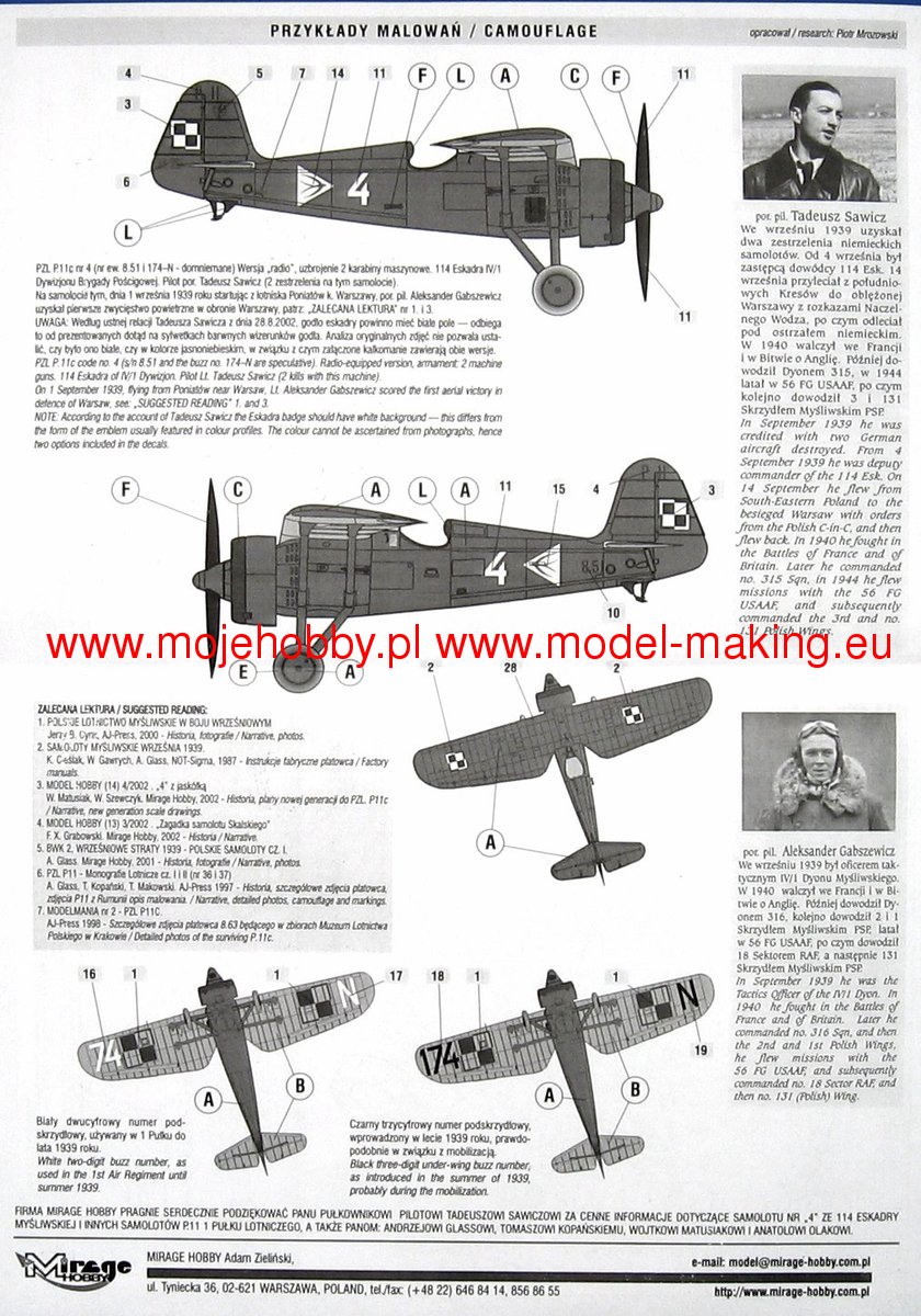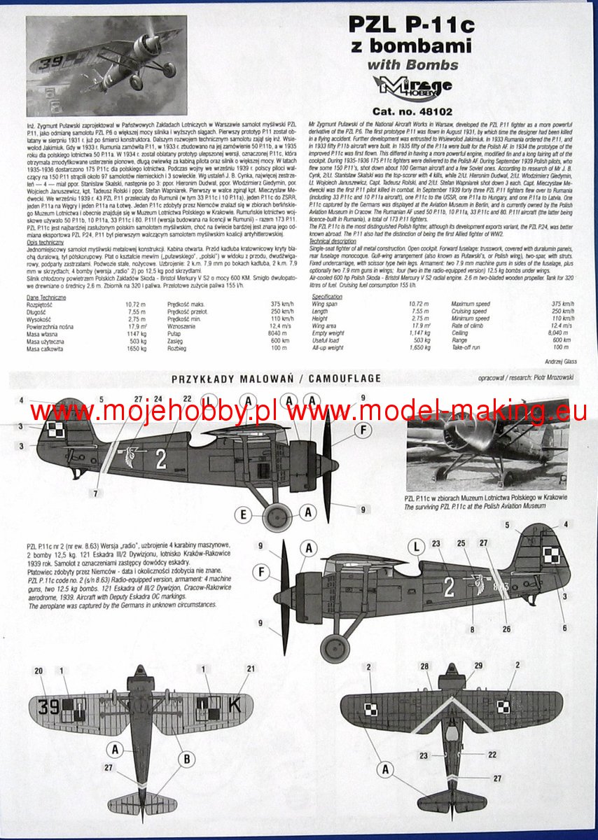 Download Mirage Hobby PDF catalogueThe PZL P.11a (the so-called eleven) is a Polish, single-engine fighter plane with a metal structure with Puławski wings, a classic tail and a fixed landing gear. The flight of the prototype took place in 1931, but serial production continued in 1937-1939. The first serial version is the PZL P.11a powered by the Bristol Mercury IV S2 engine with a power of 550 HP. However, it was treated as a transitional version and only 50 were ordered. The most famous version of the "eleven" - PZL P.11c - appeared in the summer. It had an improved fuselage, wings and a vertical stabilizer. It all improved the aerodynamics of the plane. The drive unit has not changed. The interest in the construction was expressed by, among others, Romania, where 95 units of the licensed PZL P.11 were manufactured at the IAR plants. At the outbreak of the war, all versions of the P.11 were much slower than their German opponents, but at the same time had greater maneuverability, high rate of climb and a less emergency engine than German planes. They had many victories over the enemy during the September campaign, mainly as part of the Pursuit Brigade. Technical data (version P.11c): length: 7.55m, wingspan: 10.72m, height: 2.85m, maximum speed: 367km / h, rate of climb: 14.5m / s, maximum ceiling: 8000m, range maximum: 550 km, armament: fixed - 2 machine guns wz.33 cal.7.92 mm.