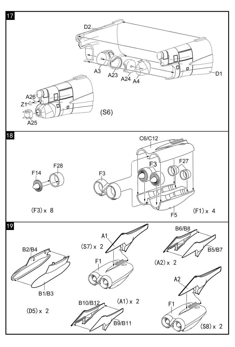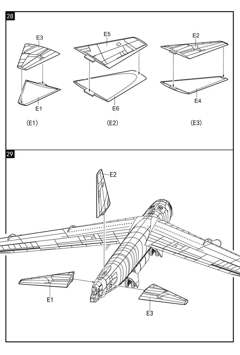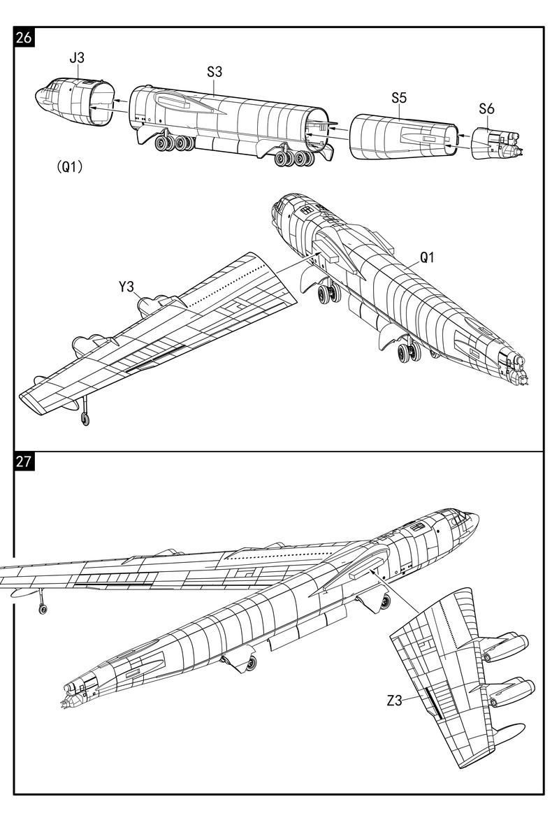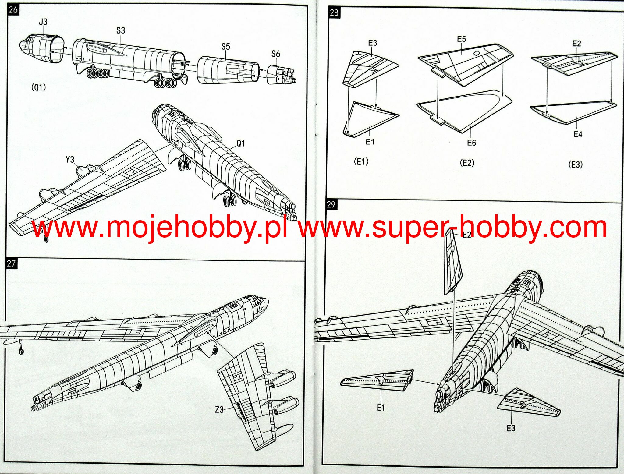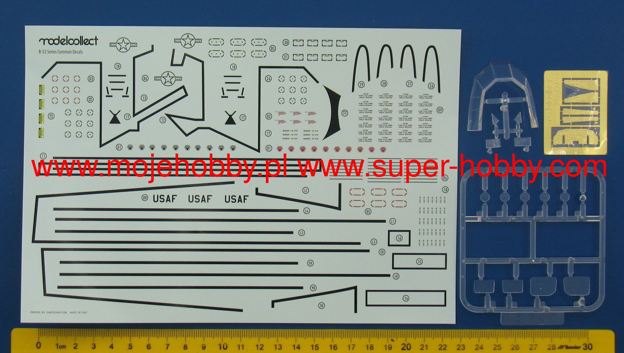 W roku 1948 Departament Obrony USA złożył w koncernie Boeing zamówienie na opracowanie nowego bombowca strategicznego o udwigu i zasięgu przewyższajšcym wszystkie dotychczasowe, zdolnego do ataków na cele położone w dowolnym punkcie kuli ziemskiej. Efektem tego zamówienia był projekt samolotu XB-52 ze skrzydłami o skosie 20°, wyposażonego w 6 silników turbomigłowych. Został on po uzyskaniu silników odrzutowych (a cile po zakupie ich licencji w Wielkiej Brytanii) znacznie zmodyfikowany; zwiększono skos skrzydeł do 35°, a liczbę silników podwyższono do omiu, umieszczajšc je parami na podskrzydłowych wspornikach-pylonach; w niekonwencjonalny sposób rozwišzano podwozie samolotu. W roku 1949, po przedstawieniu odbiorcy makiety i uzyskaniu jej akceptacji, przystšpiono do budowy prototypów, wykorzystujšc przy tym dowiadczenia nabyte przy konstruowaniu i budowie wczeniejszego bombowca B-47 Stratojet. Prototyp samolotu B-52 oblatano 1952-04-15. Zaledwie w trzy dni póniej wzbił się w niebo najgroniejszy konkurent B-52; samolot bombowy firmy Convair, oznaczony YB-60. Drugim poważnym konkurentem był samolot turbomigłowy Douglas 1211-I. Ostatecznie jednak do produkcji skierowano projekt Boeinga. Pod koniec lat szećdziesištych samoloty wersji B-52G i B-52H zmodyfikowano, instalujšc nowš awionikę i przystosowujšc je do przenoszenia nowego uzbrojenia w postaci pocisków rakietowych AGM-69A, wymieniono także silniki na nowsze TF-33-P-3 (8x7563 daN). Kolejnš modyfikację przeszły istniejšce jeszcze egzemplarze bombowców B-52 na poczštku lat osiemdziesištych. Polegała ona na zainstalowaniu nowej awioniki i przystosowaniu ich do przenoszenia pocisków manewrujšcych AGM-86A/B ALCM przez zamontowanie w komorze bombowej rewolweowych wyrzutników tych pocisków. Między 1991-92 niewielka liczba B-52H została uzbrojona w pociski AGM-129 ACM. Jako obrona działko M61 "Vulcan" (kal. 20 mm) lub 4 sprzężone k.m. (kal. 12,7 mm) sterowane radarem; w komorze bombowej bomby klasyczne, atomowe; pod skrzydłem pociski rakietowe o dużej sile rażenia lub pociski manewrujšce. Dane techniczne: Prędkoć maksymalna: 1030 km/h, prędkoć wznoszenia: 31,85 m/s, pułap maksymalny 15000m, zasięg maksymalny: 16232 km, maksymalny udwig: 31500kg bomb. Co oprócz modelu będę potrzebować do jego sklejenia?