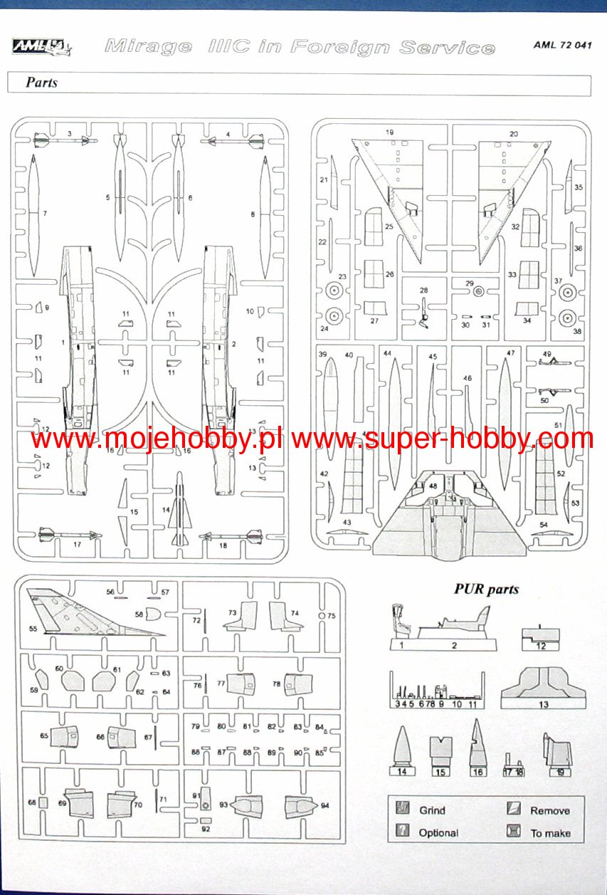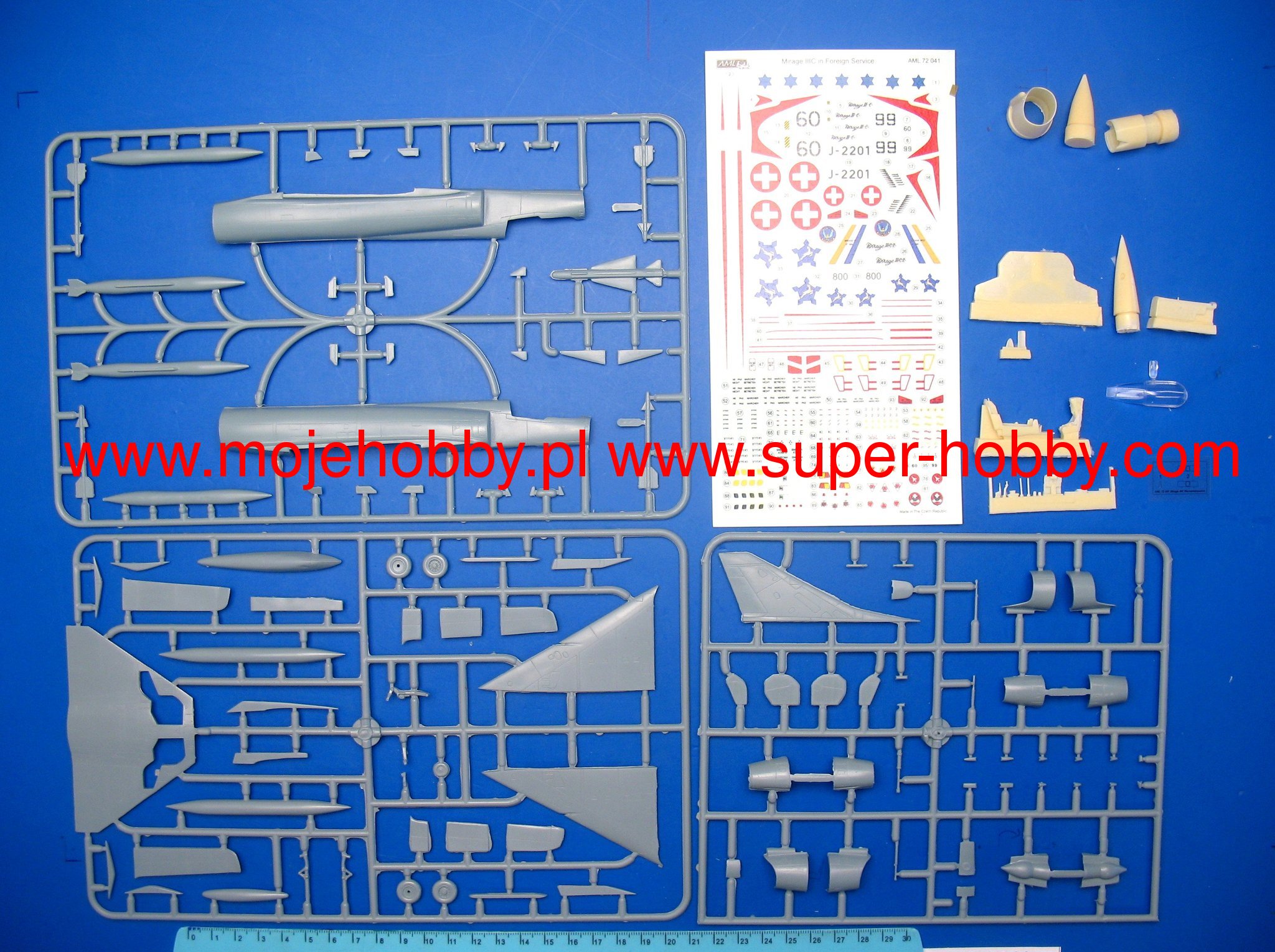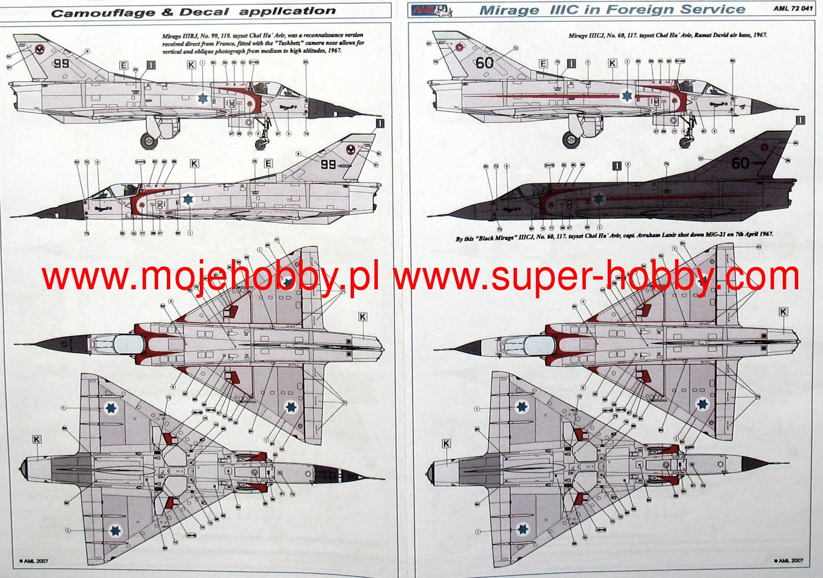 Dassault Mirage III/5/50 to francuski, jednosilnikowy samolot myliwsko-szturmowy z płatem w układzie delta, bez usterzenia poziomego. Pod koniec 1955 roku firma Dassault przystšpiła do budowy pojedynczego prototypu, w którym zachowano skrzydło delta połšczone z powiększonym kadłubem mogšcym pomiecić jeden silnik SNECMA Atar 101G1. Powstały w ten sposób Mirage III-001 został oblatany 17 listopada 1956 roku, by już po dwóch miesišcach osišgać w locie prędkoć 1,52Ma. Zastosowanie ręcznie sterowanych stożków w stałych wlotach bocznych oraz silnika Atar 101G2 o cišgu zwiększonym do 4490kg, pozwoliło zwiększyć prędkoć do 1,65Ma, a póniej przez użycie rakietowego przypieszacza SERP - do 1,8Ma. By uzyskać jak największš prędkoć Dassault zmodyfikował skrzydło i po pierwszym oblocie 12 maja 1958 roku Mirage IIIA osišgnšł z dodatkowym silnikiem rakietowym prędkoć 2,2Ma. Doprowadziło to do uruchomienia produkcji dwumiejscowej wersji treningowej z miejscami w tandem Mirage IIIB i jednomiejscowego myliwca przechwytujšcego Mirage IIIC. Ta ostatnia wersja miała zabudowany radar Cyrano AI, a dwa działka kalibru 30mm mogły być wspierane przez pociski rakietowe klasy powietrze-powietrze Matra R.530 lub AIM-9 Sidewinder. Następnš ważnš wersjš był myliwsko-bombowy Mirage IIIE dalekiego zasięgu, z silnikiem Atar 9C zabudowanym w nieco przedłużonym kadłubie. Wersja ta miała zabudowany radar Cyrano II, który w połšczeniu z radarem Dopplera i układem nawigacyjnym TACAN pozwalał przeprowadzić atak na małej wysokoci bez widzialnoci celu w każdych warunkach atmosferycznych. Programy modyfikacyjne Mirage III ( oraz pochodnych V i 50 ) zawierajš zabudowę nowoczesnych układów nawigacyjnych, sterowania uzbrojeniem i przystosowania do nowoczesnych typów uzbrojenia. Drugim obszarem modyfikacji jest zabudowa silników Atar 9K-50 o cišgu większym o około 20%, przystosowanie do scentralizowanego tankowania pod cinieniem i uzupełniania paliwa w czasie lotu, zabudowa foteli katapultowych klasy zero-zero, polepszenie widzialnoci z kabiny, instalacja przednich powierzchni sterowych podnoszšcych manewrowoć w walce powietrznej, przystosowanie do przenoszenia zasobników np. do walki elektronicznej, laserowego oznaczania celów, rozpoznania czy zobrazowania celów w podczerwieni. Dane techniczne (wersja IIIC): długoć: 14,77m, rozpiętoć skrzydeł: 8,22m, wysokoć: 4,25m, prędkoć maksymalna: 2,2Ma, prędkoć wznoszenia: 83m/s, zasięg maksymalny (ze zbiornikami dodatkowymi): 4000km, pułap maksymalny 17000m, uzbrojenie: stałe-dwa działka DEFA 552 kal.30mm, podwieszane (Mirage 5)-do 4200 kg ładunku. Co oprócz modelu będę potrzebować do jego sklejenia?
