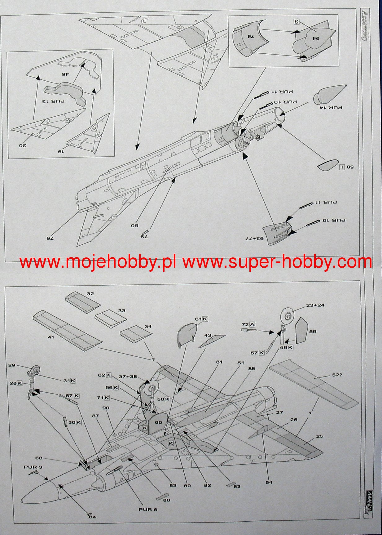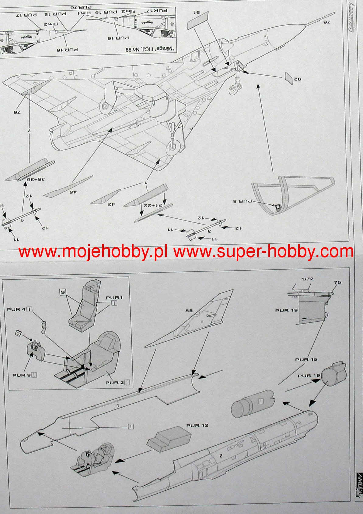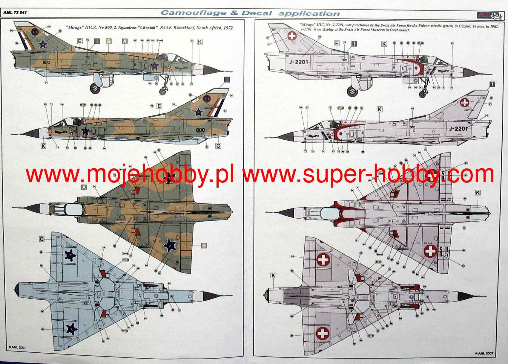 Dassault Mirage III/5/50 to francuski, jednosilnikowy samolot myliwsko-szturmowy z płatem w układzie delta, bez usterzenia poziomego. Pod koniec 1955 roku firma Dassault przystšpiła do budowy pojedynczego prototypu, w którym zachowano skrzydło delta połšczone z powiększonym kadłubem mogšcym pomiecić jeden silnik SNECMA Atar 101G1. Powstały w ten sposób Mirage III-001 został oblatany 17 listopada 1956 roku, by już po dwóch miesišcach osišgać w locie prędkoć 1,52Ma. Zastosowanie ręcznie sterowanych stożków w stałych wlotach bocznych oraz silnika Atar 101G2 o cišgu zwiększonym do 4490kg, pozwoliło zwiększyć prędkoć do 1,65Ma, a póniej przez użycie rakietowego przypieszacza SERP - do 1,8Ma. By uzyskać jak największš prędkoć Dassault zmodyfikował skrzydło i po pierwszym oblocie 12 maja 1958 roku Mirage IIIA osišgnšł z dodatkowym silnikiem rakietowym prędkoć 2,2Ma. Doprowadziło to do uruchomienia produkcji dwumiejscowej wersji treningowej z miejscami w tandem Mirage IIIB i jednomiejscowego myliwca przechwytujšcego Mirage IIIC. Ta ostatnia wersja miała zabudowany radar Cyrano AI, a dwa działka kalibru 30mm mogły być wspierane przez pociski rakietowe klasy powietrze-powietrze Matra R.530 lub AIM-9 Sidewinder. Następnš ważnš wersjš był myliwsko-bombowy Mirage IIIE dalekiego zasięgu, z silnikiem Atar 9C zabudowanym w nieco przedłużonym kadłubie. Wersja ta miała zabudowany radar Cyrano II, który w połšczeniu z radarem Dopplera i układem nawigacyjnym TACAN pozwalał przeprowadzić atak na małej wysokoci bez widzialnoci celu w każdych warunkach atmosferycznych. Programy modyfikacyjne Mirage III ( oraz pochodnych V i 50 ) zawierajš zabudowę nowoczesnych układów nawigacyjnych, sterowania uzbrojeniem i przystosowania do nowoczesnych typów uzbrojenia. Drugim obszarem modyfikacji jest zabudowa silników Atar 9K-50 o cišgu większym o około 20%, przystosowanie do scentralizowanego tankowania pod cinieniem i uzupełniania paliwa w czasie lotu, zabudowa foteli katapultowych klasy zero-zero, polepszenie widzialnoci z kabiny, instalacja przednich powierzchni sterowych podnoszšcych manewrowoć w walce powietrznej, przystosowanie do przenoszenia zasobników np. do walki elektronicznej, laserowego oznaczania celów, rozpoznania czy zobrazowania celów w podczerwieni. Dane techniczne (wersja IIIC): długoć: 14,77m, rozpiętoć skrzydeł: 8,22m, wysokoć: 4,25m, prędkoć maksymalna: 2,2Ma, prędkoć wznoszenia: 83m/s, zasięg maksymalny (ze zbiornikami dodatkowymi): 4000km, pułap maksymalny 17000m, uzbrojenie: stałe-dwa działka DEFA 552 kal.30mm, podwieszane (Mirage 5)-do 4200 kg ładunku. Co oprócz modelu będę potrzebować do jego sklejenia?