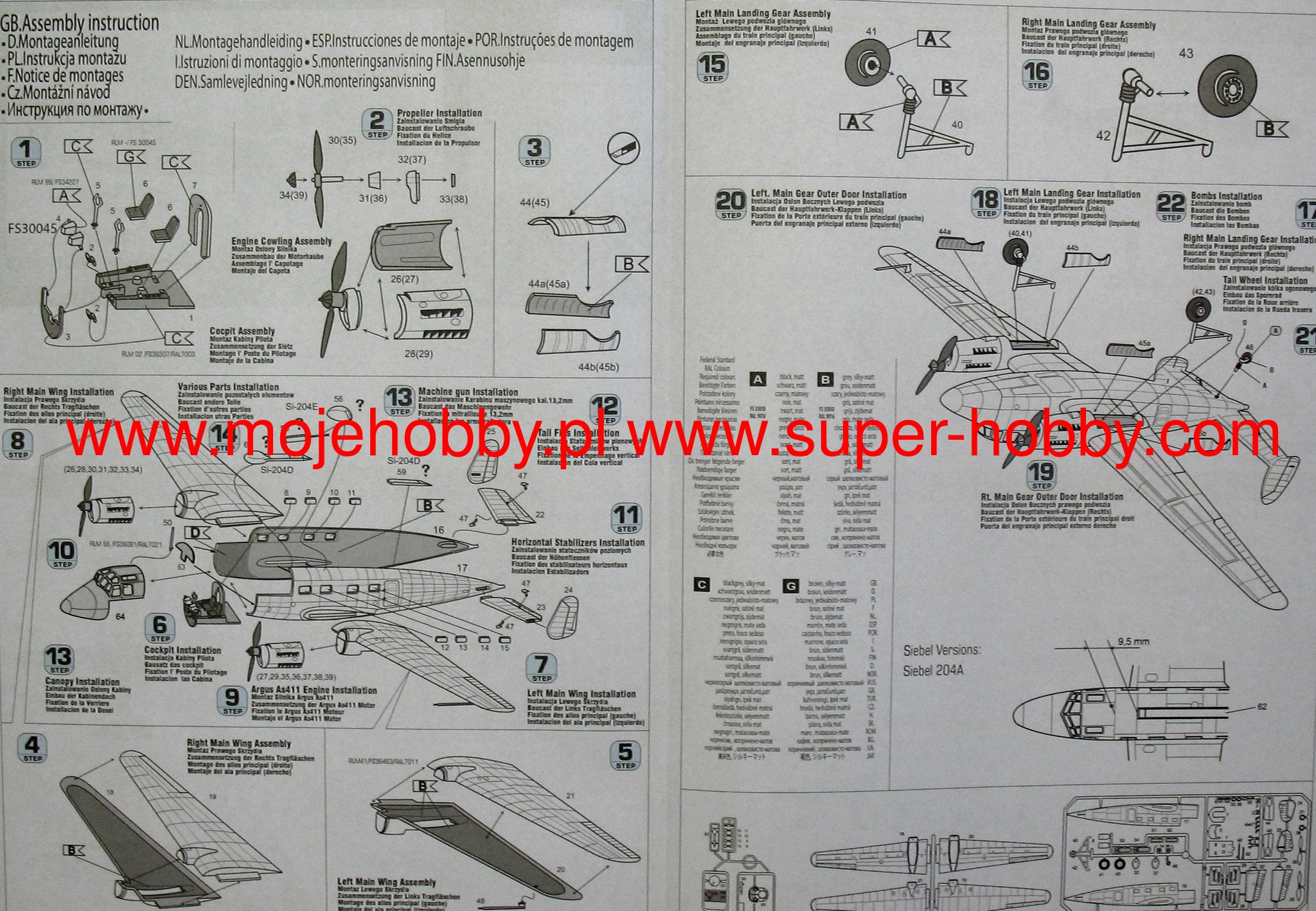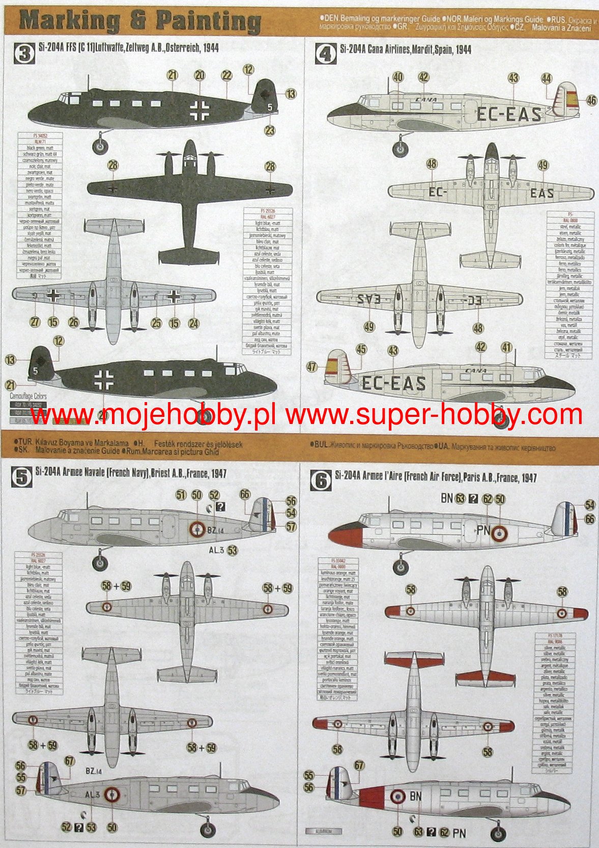Note: Comany Mistercraft frequently changes, without any notice, the decals that come with the model, so they may differ from the photos and descriptions on our website. If you need a specific version, please let us know about that by entering the appropriate notice in the comments field when placing the order. The Siebel Si 204 is a German, twin-engine, multi-role, semi-shell aircraft, all-metal, low-wing design. The drive was made of two Argus As 410 engines with a maximum power of 360 HP. The single-spar wing was equipped with crocodile flaps powered by an electro-hydraulic mechanism. The shuttlecocks were covered with linen. The hull had a cross-section similar to a rectangle rounded at the top. The crew cabin with two seats was located at the front of the fuselage. A passenger cabin with eight seats was placed in the fuselage. The cabin entrance door was on the left side of the fuselage. The vertical tail was doubled, the rudder had horn compensation. The ballasts were covered with sheet metal, while the moving parts were covered with linen. The electro-hydraulic retractable landing gear was retracted to the rear in the engine nacelles. Siebel Si-204V1 was flown on May 23, 1941. The aircraft entered serial production with the designation Si-204A-1. A year later, the Si-204D version was tested, which received a new, fully glazed front with the crew cabin inscribed in the longitudinal contour of the fuselage. The aircraft was powered by two Argus As 411 engines with a take-off power of 580 KM, equipped with biplane propellers. These planes were used extensively in aviation schools. The machine took two members, five apprentices as well as special navigational or radar equipment and, if necessary, a small bomb load. These airplanes were mainly used for groundless pilot training, navigation, and also as a flying lecture hall for candidates for radio operators. The Si-204 V22, V23 prototypes and the Si-204E-O aircraft were equipped with a 01 131 dorsal shooting turret with a single 13mm MG 131 machine gun. These planes could carry a bomb load of up to 1000 kg on external hooks. It was also planned to start production of the Si-204D-3 variant with wings, vertical and horizontal tail of an all-wooden structure. The production of Si-204 aircraft was carried out by the SNCAC factory in France (168 in total, of which the Luftwaffe took over 147) and the Aero (515) and MBB (491) plants in the Protectorate of Bohemia and Moravia. Numerous Si-204 planes fell into the hands of the victorious Allies. Apart from the Soviet Union, Great Britain has acquired the greatest number of aircraft of this type. About twenty Si-204 aircraft were on the territory of Switzerland. In the Netherlands, the Si-204D aircraft served as a flying laboratory after the war. After the war, the production of Si-204D was continued by the Aero plant in Prague, which produced a total of 172 copies of these machines under the designation C-3 and C-103. SNCAC plants in France also continued production of the Si-204, the Si-204 aircraft were designated Nord NC-701, and the Si-2O4A Nord NC-702. Both types were called Martinet. French aircraft were equipped with Renault12S engines, which are the equivalent of Argus As 411 A1 engines with a three-blade, metal, self-adjusting Ratier propeller with a diameter of 2.65 m. In total, 350 copies of these aircraft were produced in France after the war. Air France used 31 Martinets, six NC702s were used to transport mail from late 1946, and six more machines in the air-photogrammetric version were used by the National Geographic Institute. Most of the Martinets, however, were taken over by the French military aviation, which used them as transport aircraft, among others in the fighting in Vietnam. Specifications: length: 13m, wingspan: 21.33m, height: 4.25m, maximum speed: 364km / h, climb speed: 6m / s, practical ceiling: 6400m, maximum range: 1400km.