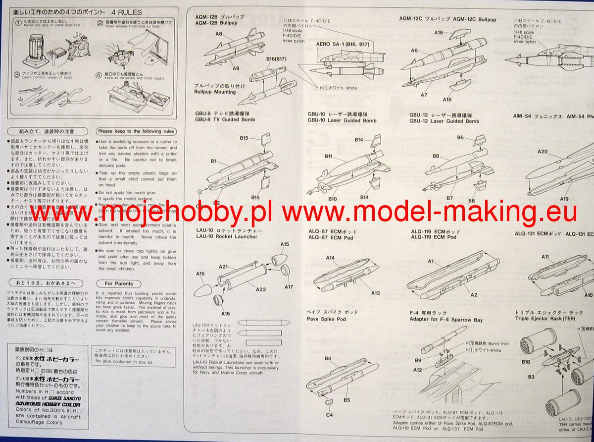 The AGM-12 Bullpup was an American air-to-ground and air-to-water missile from the Cold War period. Its first prototypes appeared in the mid 1950s, and mass production began in 1959 and continued until 1970. The AGM-12 was a missile with a range of 5,000 to 12,000 meters, capable of carrying a warhead weighing from 113 to 453 kg, and its total mass - depending on the version - ranging from 259 to 810 kg. The AGM-12 Bullpup was created in response to the US Navy's post-Korean demand (1950-1953) for a missile capable of destroying surface targets from a distance safe for the carrier aircraft. The AGM-12 was originally based on a 113 kg bomb body, but a rocket engine and a guidance system were added to it. The latter was the line of sight guidance system and required constant eye contact of the operator with the target (the so-called MCLOS guidance). Several versions of the AGM-12 missile were developed in the course of serial production. The first to be produced on a large scale was the AGM-12A. The next version is AGM-12B, which had a liquid fuel drive, which allowed to increase the range and the transferred head. A version of the AGM-12D was also developed, which was planned to be equipped with a nuclear warhead W-45 with a capacity of up to 15 kT. Based on this version, the AGM-12C model was created, which had a conventional warhead. The last version of the AGM-12 missile was the E model with an anti-tank warhead. AGM-12 Bullpups were used by many American aircraft, including: A-4 Skyhawk, A-6 Intruder, A-7 Corsair II, F-8 Crusader and F-4 Phantom II. Missiles of this type were also used in Australia, Greece, Denmark, Norway, Turkey and Great Britain. They were used on a relatively large scale during the Vietnam War in 1964 / 1965-1975.GBU-10 Paveway is a modern American laser guided aerial bomb. Its first prototypes appeared in the first half of the 1970s, and it was used by the US armed forces in 1976 and remains there to this day. GBU-10 Paveway is capable of carrying a warhead weighing up to 428 kg with a total curb weight of 1,162 kg. The GBU-10 Paveway was developed and manufactured by Raytheon and Lockheed Martin, based on the traditional Mk. 84. Modernization of the Mk. 84 consisted in adding a special head guiding the laser beam and ailerons correcting the fall of the bomb. GBU-10 requires highlighting with a laser target pointer. Two generations of these bombs appeared in the course of production. He represents the first GBU-10A / B Paveway I , the second is the GBU-10E / B and F / B Paveway II. The difference - apart from the design of the fins - is primarily that the Paveway II has a homing head that is cheaper to produce and more sensitive, which increases its accuracy and effectiveness. The main carriers of these bombs are the F-111 and F-15 E Strike Eagle planes. In addition, it can be carried by, among others: F-16 Fighting Falcon or F / A-18 Hornet. In the course of Operation Desert Storm in 1990-1991 bombs GBU-10 Paveway showed 76% effectiveness in hitting targets.GBU-12 Paveway is a modern American laser guided aerial bomb. Its first prototypes appeared in the first half of the 1970s, and it was used by the US armed forces in 1976 and remains there to this day. GBU-12 is capable of carrying explosives (Tritonal and PBNX) weighing up to 87 kg with a total empty weight of 230 kg. The GBU-12 Paveway was developed and manufactured by Raytheon and Lockheed Martin, based on the traditional Mk. 82 with a weight of 227 kilograms. Modernization of the Mk. 82 consisted in adding a special head guiding the laser beam and ailerons correcting the fall of the bomb. The first element was originally developed by Texas Instruments, which later became part of Raytheon. GBU-12 requires highlighting with a laser target pointer. Two generations of these bombs appeared in the course of production. He represents the first GBU-12 Paveway I , the second is the GBU-12 Paveway II. The difference - apart from the design of the fins - is primarily that the Paveway II has a homing head that is cheaper to produce and more sensitive, which increases its accuracy and effectiveness. The main carrier of these bombs is the F-111 plane. In addition, it can be carried by, among others: F-15 Strike Eagle, A-10 Thunderbolt II, F-16 Fighting Falcon or F / A-18 Hornet. In the course of Operation Desert Storm in 1990-1991 bombs GBU-12 Paveway showed 88% effectiveness in hitting targets.
