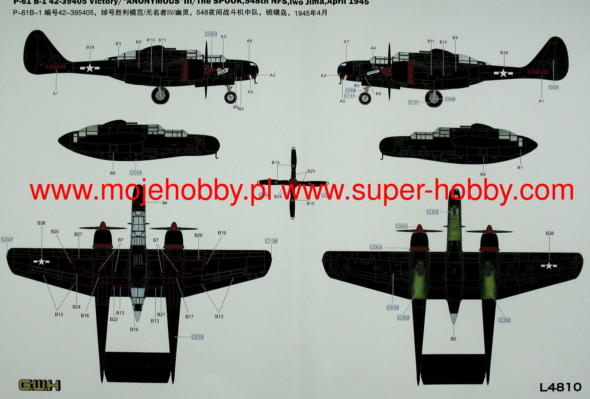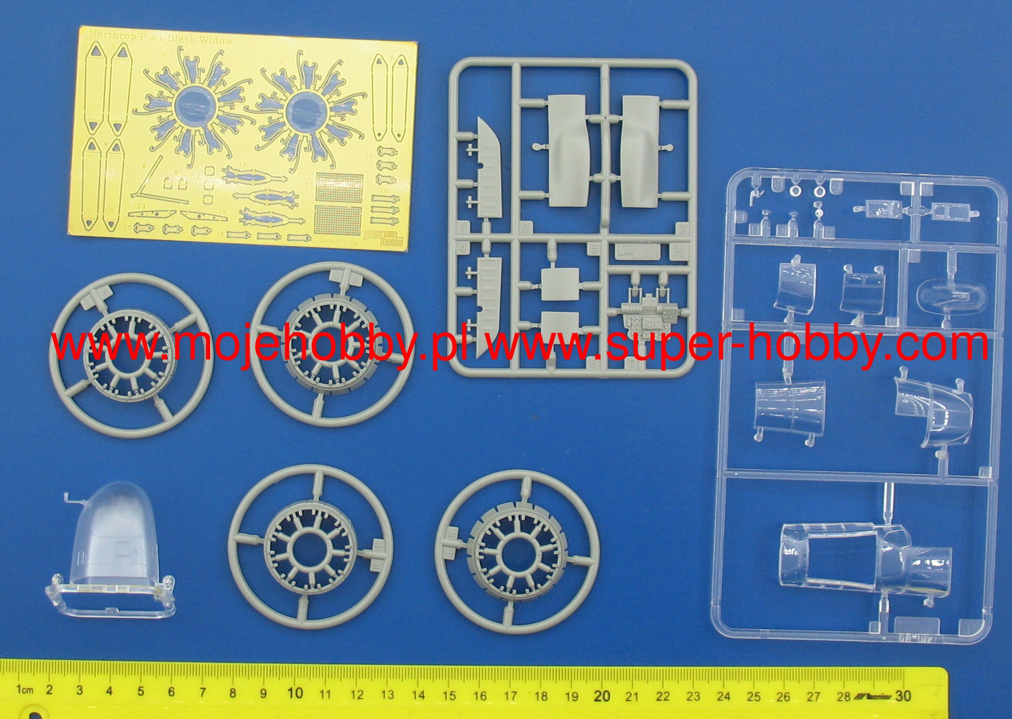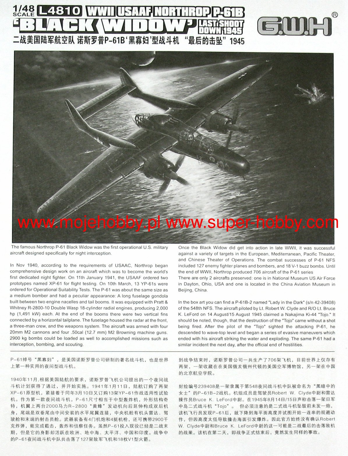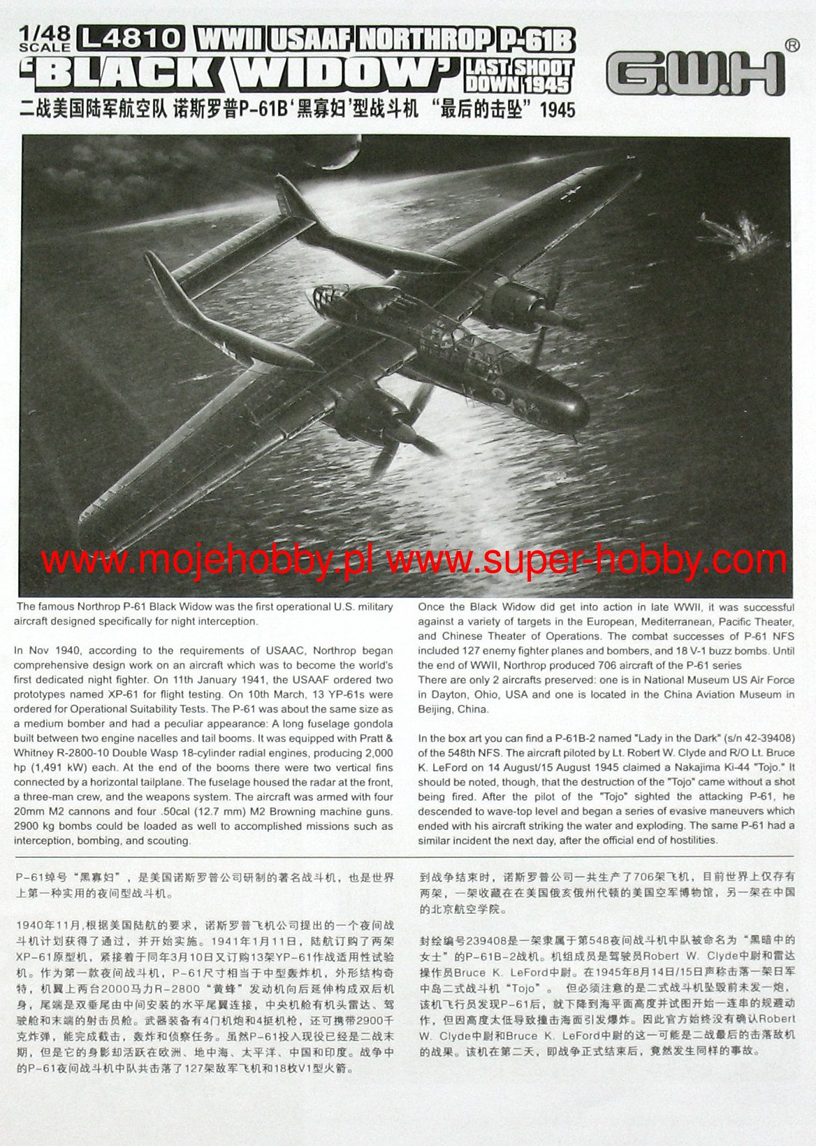 The Northrop P-61 was a three-seat, twin-engine night fighter, two-bar medium wing aircraft with retractable landing gear, adapted to operate from land bases. The prototype's flight took place in May 1942. The plane was made entirely of metal, initially of magnesium alloys, later of duralumin. The half-shell beam hulls were stiffened with metal frames. The crew cabin, located in the middle fuselage, housed a crew of three. The pilot sat in the front section, followed by the deck gunner, and finally the radar operator. In the turretless versions, the radar operator was moved to the gunner's cockpit, and there was an extra seat at the rear. The entire cabin was armored. The P-61 received an SCR-720 airborne radar with a range of 10 km, was located in the nose part of the fuselage, and was coupled to an IFF device for self-alien identification. The radar indications were received in the cockpit of the radar operator who sat at the rear of the fuselage. The armament consisted of four 12.7 mm machine guns mounted in a remotely controlled turret, which was not available on all versions of the aircraft, and four 20 mm cannons mounted in the fuselage. Each crew member had a sight, the pilot used it in typical fighter attacks, when the enemy's flight direction coincided with the flight of his own plane. In other cases, the fire was fired by a deck gunner, who was also a shooting tower operator. If it was necessary to defend against an attack from the rear, the duties of the shooter and the operation of the shooting turret were taken over by the radar operator. In addition, some machines, mainly operating in Europe, performed assault actions using bombs, unguided rockets or napalm tanks. Technical data: length: 15.11m, wingspan: 20.12m, height: 4.47m, maximum speed: 589km / h, climb speed: 112.9m / s, maximum range: 3060km, practical ceiling: 10600m, armament: Fixed - 4 12.7mm M2 machine guns and 4 20mm Hispano cannons, sling - for 2880 kg bombs or 6 127mm HVAR missile launchers.
