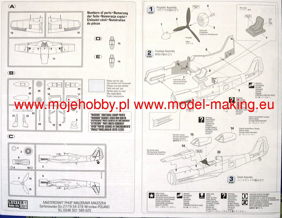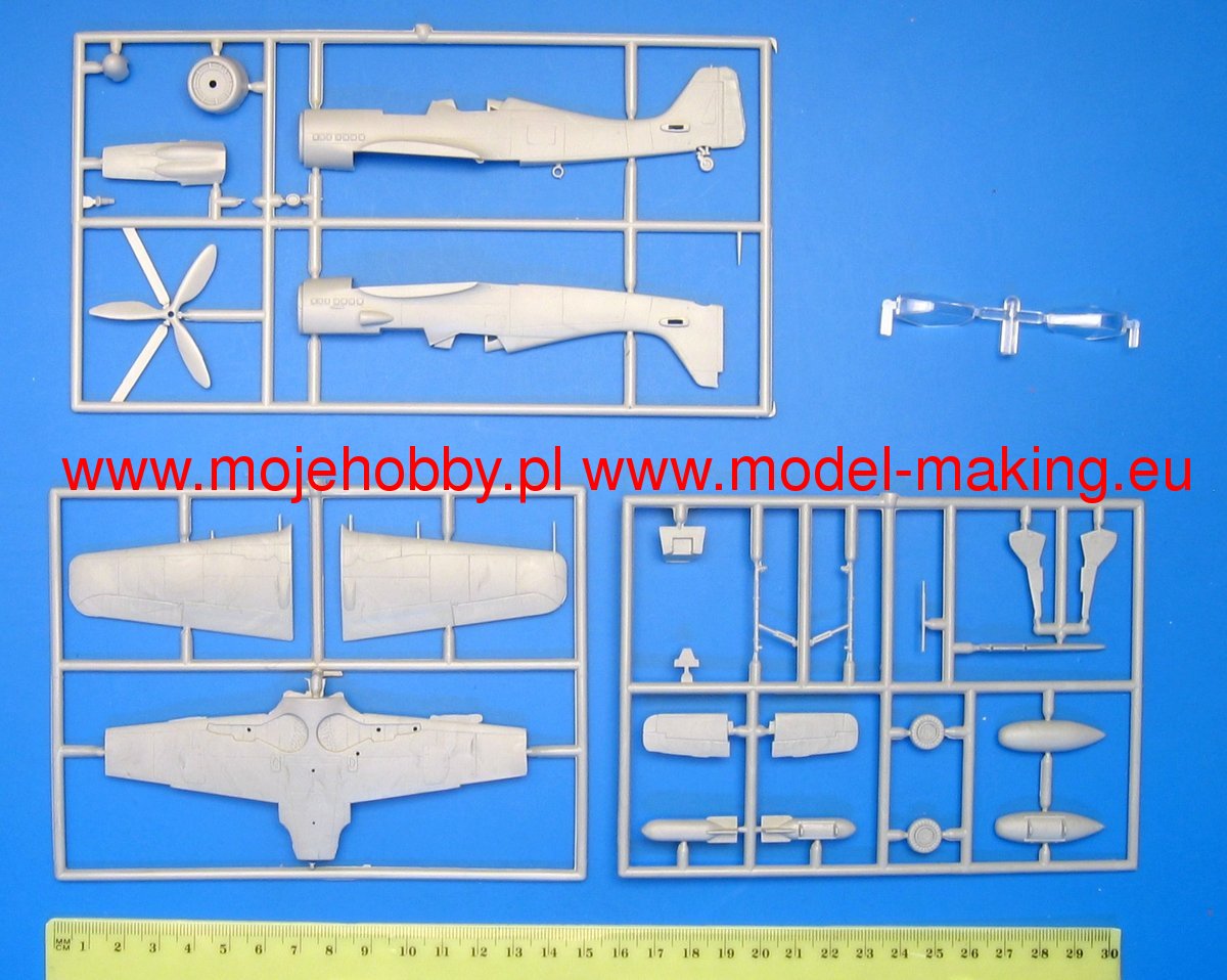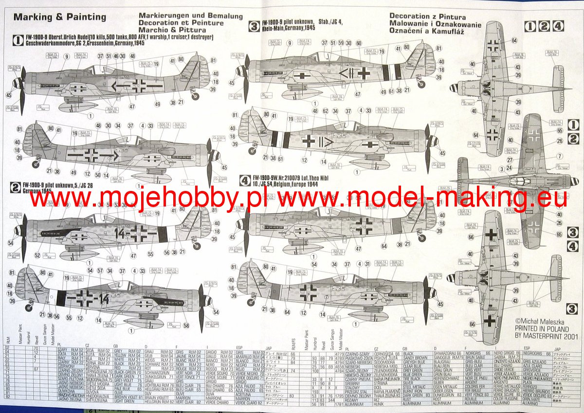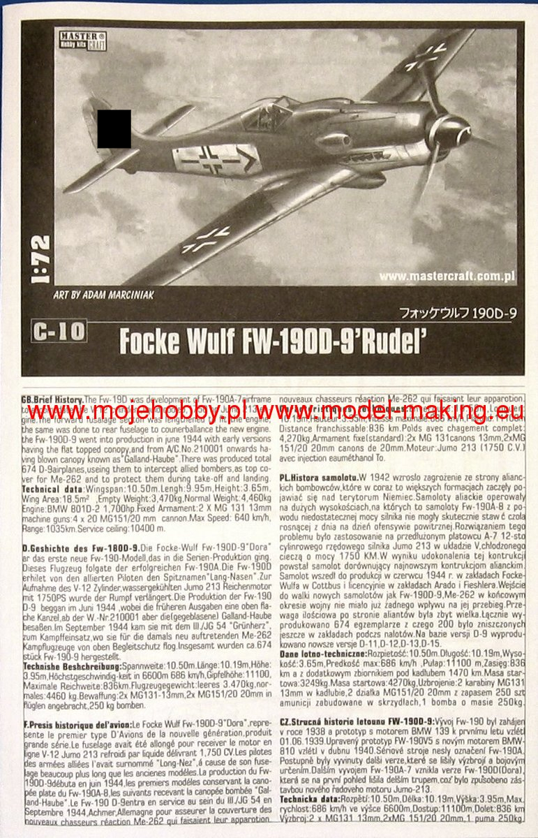 Focke-Wulf Fw-190 немецкий одномоторный цельнометаллический истребитель с крытой кабиной в конструкции низкоплана времен Второй мировой войны. Пилоты считали Fw-190 лучшим самолетом, чем Messerschmitt Bf-109. Отдельно стоящее низкоплан с работающим покрытием Fw-190 было заказано Luftfahrtministerium, собрано осенью 1937 года. Курт Танк представил два предложения по силовым установкам первое с двигателем Daimler-Benz DB 601 жидкостного охлаждения, а второе с новым звездообразным двигателем BMW 139. Был выбран последний, и начатые весной 1938 года работы возглавил Оберинг. Р. Блазер. Первый прототип Fw-190V1 был готов в мае 1939 года, а 1 июня 1939 года капитан Ганс Сандер поднял его в воздух в Бремене. Второй прототип, FW-190V2, вооруженный двумя пулеметами MG131 и двумя пулеметами MG17 калибра 7,92 мм, поднялся в воздух в октябре 1939 года. Чтобы уменьшить аэродинамическое сопротивление, оба были оснащены туннельным воздухозаборником в крышке воздушного винта, но проблемы с перегревом двигателя привели к возврату к проверенной конструкции щитка NACA. Прежде чем окончательно начались испытания этих прототипов, уже было принято решение о замене двигателя BMW 139 на более мощный, но более длинный и тяжелый BMW 810. Это потребовало множества изменений, усиления конструкции и перемещения кабины назад, что впоследствии стало источник проблем с центром тяжести. Преимуществом было снятие проблем с проницаемостью выхлопных газов и перегревом салона из-за его непосредственной близости к двигателю BMW 139. От третьего и четвертого прототипов отказались, а в начале достроили Fw-190V5 с новым двигателем 1940 года. Позже он получил крылья с увеличенным на один метр размахом (с исходных 9,5 м), что сделало его медленнее на 10 км/ч, но зато повысило скороподъемность и улучшило маневренность. Он получил обозначение Fw-190V5g, а вариант с более коротким крылом Fw-190V5k. Первые семь машин информационной серии Fw-190A-0 имели короткое крыло, остальные более длинное. Первая оперативная часть, оснащенная Fw-190 6./JG 26, дислоцированная в Ле-Бурже, заявила о своей оперативной готовности в августе 1941 г., и с первой же встречи нового истребителя с британскими Supermarine Spitfire стало очевидным его преимущество перед ними. Во время войны было создано около дюжины модификаций этого великого самолета. Машины версии А вместе с десятком-другим модернизаций служили истребителями. Версии с маркировкой В и С были лишь прототипами высотных истребителей, предназначенных для борьбы со стратегическими бомбардировщиками, но в серийное производство не поступали. Вариант D, как единственный из Fw-190, был оснащен новым двигателем Jumo 213A мощностью 1750 л.с. и был немецким ответом на P-51 Mustang. Новый двигатель удлинил фюзеляж на несколько десятков сантиметров. Этот вариант также выполнял в основном охотничьи и высотные истребительные задачи. Многочисленные варианты версии F использовались как истребители-бомбардировщики для непосредственной поддержки на поле боя. Версия G играла ту же роль, что и версия F, но имела больший радиус действия. За всю войну было выпущено более 20 000 экземпляров этого одного из лучших истребителей Второй мировой войны. Технические данные (вариант Fw-190A-8): длина: 9м, размах крыла: 10,51м, высота: 3,95м, максимальная скорость: 656км/ч, скороподъемность: 15м/с, максимальная дальность: 800км, максимальный потолок 11410м, вооружение : исправлено - 2 13-мм пулемета MG131 и 4 20-мм пу