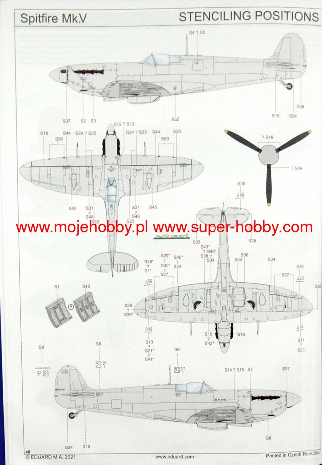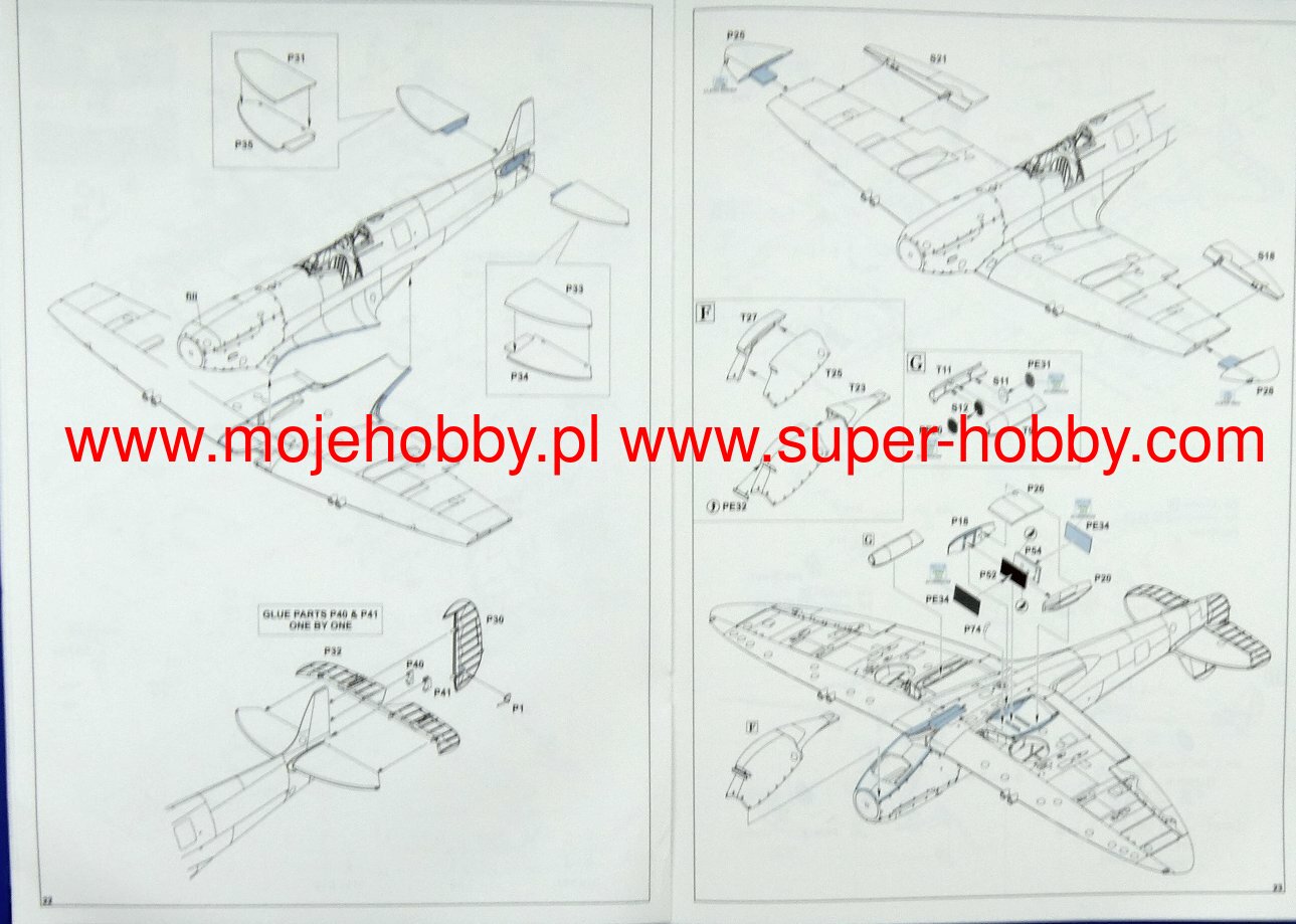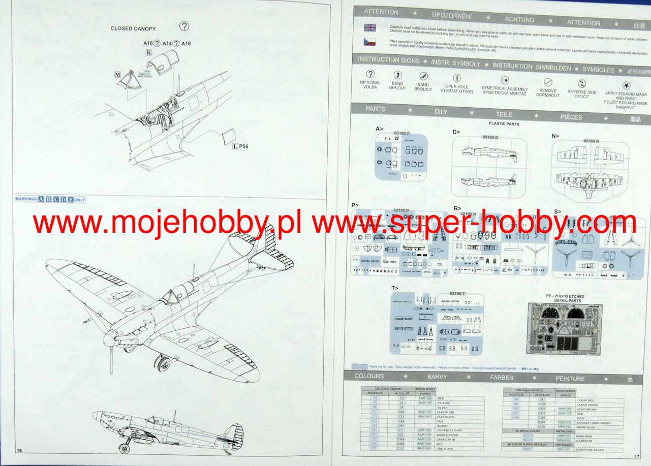Supermarine Spitfire is probably the most famous British fighter from the Second World War. It was an all-metal machine with a low wing configuration, characteristic elliptical wings, a classic tail and a retractable landing gear. The prototype flight took place on March 5, 1936. The Spitfire proved to be the RAF's staple of the war, which continued to do well after the war, remaining in production for 10 years. The history of the Spitfire began on the drawing desk of RJ Mitchell, Supermarine's lead designer. The first machines went to RAF units in 1938, but when the Battle of Britain began in the summer of 1940, there were already 19 squadrons of modern fighters at the airfields - together with the slightly older Hurricanes of the Islands, 600 aircraft were defending. With the expansion of hostilities, the Spitfire served wherever the RAF operated in the Far East, North Africa and Italy, during the Normandy landings and fighting in France, and finally during the operation in Germany in 1945. For many Britons, he became a symbol of victory in World War II. This wonderful machine has at least a dozen production versions. The most important of them are, among others the first mass-produced Spitfire Mk.I powered by a 1030hp Rolls-Royce Merlin II engine. It was above all this machine that made such an excellent contribution to the Battle of Britain. Many versions of this model have been developed, including PR Mk IA (reconnaissance version) or PR.IG (armed reconnaissance version). Another interesting version was the Spitfire Mk.V with a Rolls-Royce Merlin 45 engine with 1440HP. Later, Merlin 50 engines were also assembled. Serial production of this version started in 1941 and was the RAF's response to the appearance of the Messerschmitt Bf-109F. Another very successful version is the Spitfire Mk.IX, powered by a Merlin 61 engine with a 4-blade propeller. It was created as an opponent to the Focke-Wulf Fw-190 and was put into production at the end of 1941. This version was modified many times and, for example, in 1944 it got a new gyro sight, an enlarged rudder or a different wing system. Another major version is the Spitfire Mk.XIV with a Rolls-Royce Griffon 61 engine and a five-bladed propeller. Serial production started in October 1943. One of the last series produced was the Mk.21 version. This version had a Griffon 61 engine, a strongly reinforced structure and sheathing, the wings were extended, increasing their flying surface. Mass production started in March 1945. Technical data (Mk.XIV version): length: 9.14m, wingspan: 11.23m, height: 3.05m, maximum speed: 717km / h, rate of climb: 18.5m / s, practical ceiling: 13,200m, range maximum: 1815 km, armament: fixed - 4 7.7mm machine guns and 2 20mm Hispano Mk II cannons, suspended - up to 225 kg of bombs. 3_edu11149_instruction_sheet.pdf