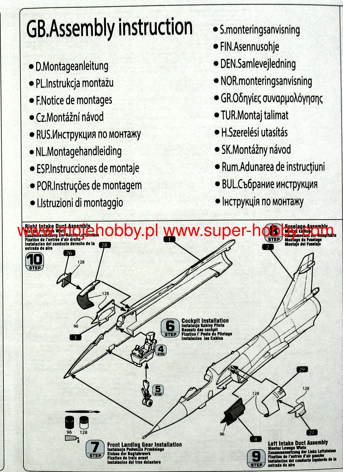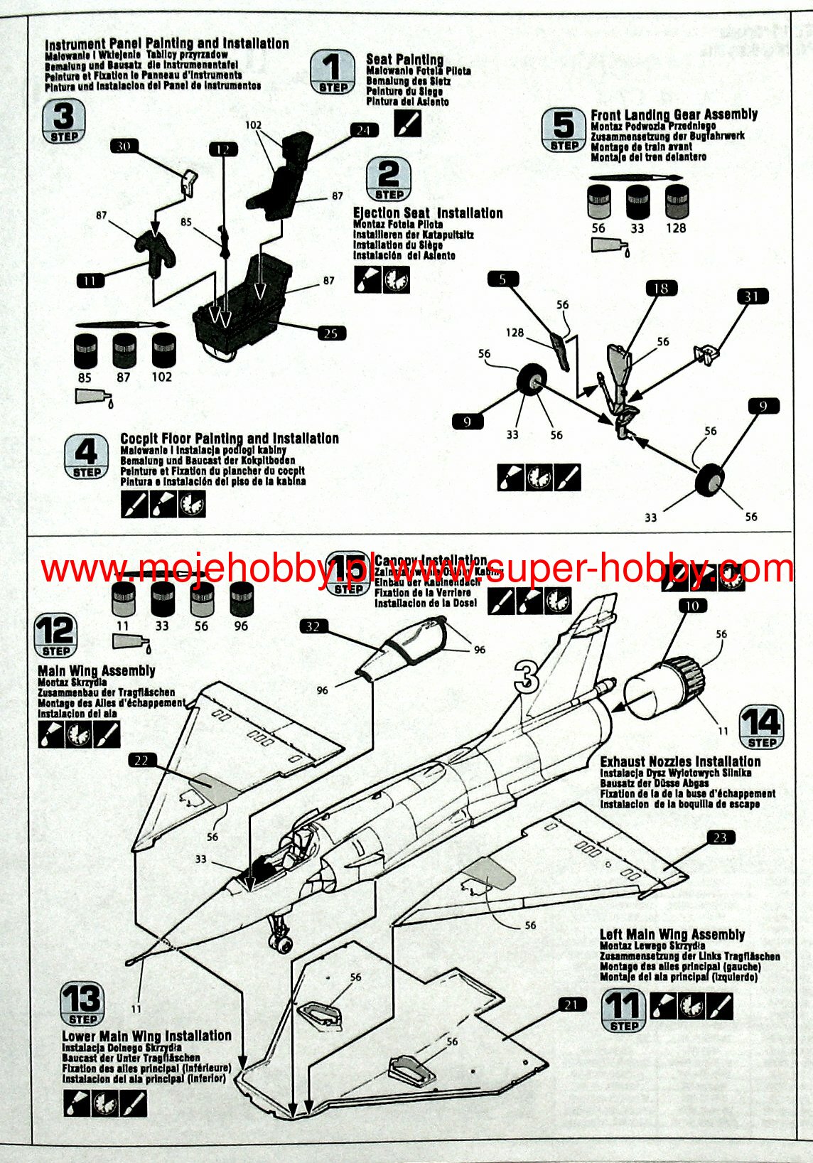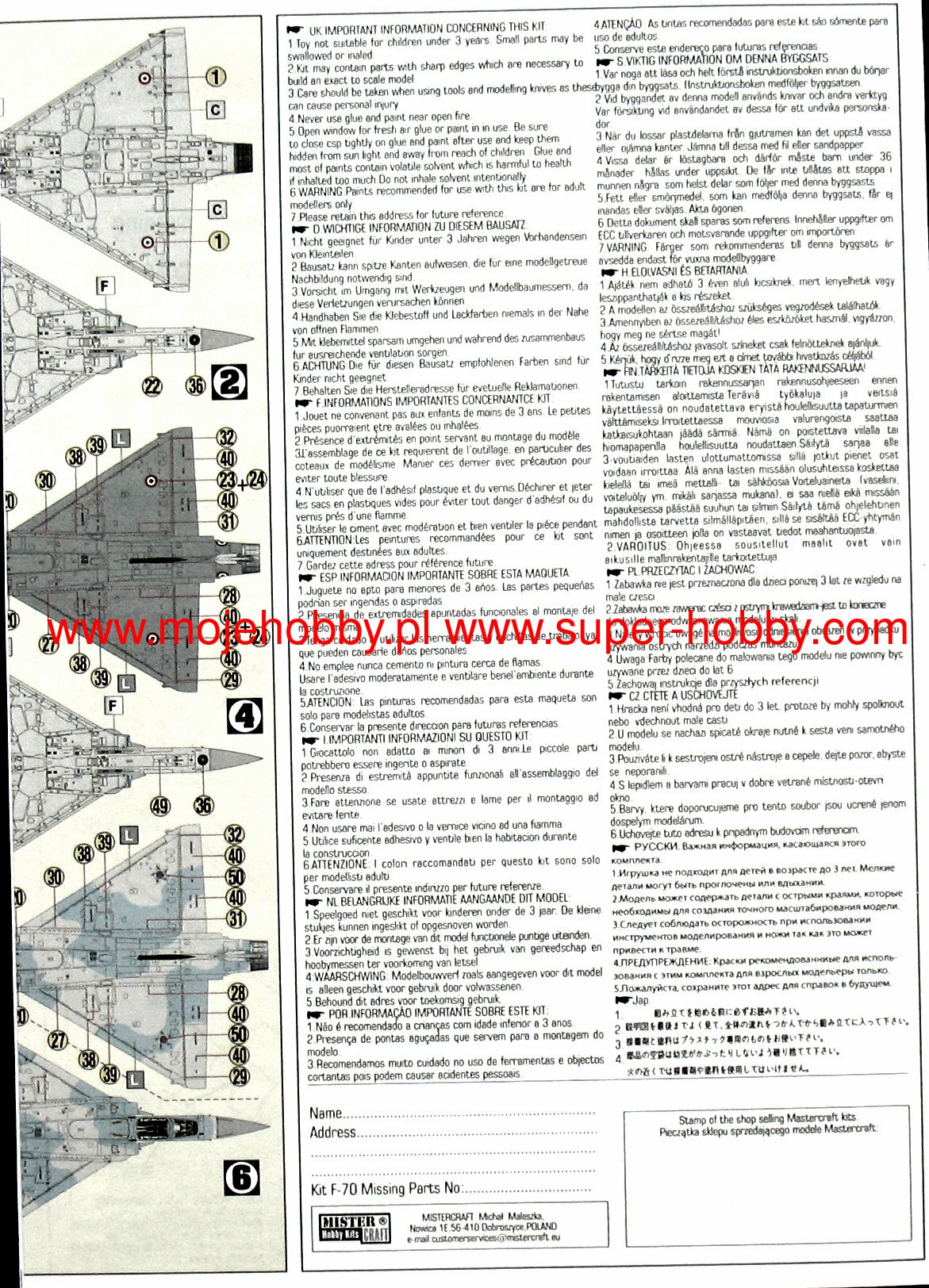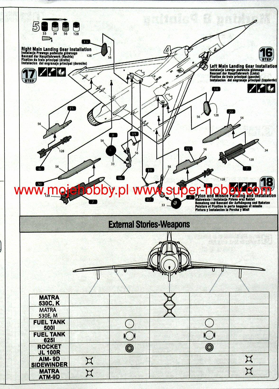 Note: Comany Mistercraft frequently changes, without any notice, the decals that come with the model, so they may differ from the photos and descriptions on our website. If you need a specific version, please let us know about that by entering the appropriate notice in the comments field when placing the order. The Dassault Mirage 2000 is a French, single-engine fighter-attack aircraft with delta wings in a low wing configuration. On December 18, 1975, the French government supported the launch of the new Dassault Mirage 2000 program, an aircraft as small as possible and with a 1: 1 weight-to-thrust ratio, using the SNECMA M53-3 engine. Mirage 2000 reverts to the triangular wing concept. Thanks to the fly-by-wire control and the location of the center of gravity far back, the plane was very maneuverable. The experience gained with the Mirage III resulted in an increase in the wing area, which resulted in a lower surface load and guaranteed better flight performance at low speeds. The use of an automatically lowered leading edge associated with the movement of ailerons resulted in a change of profile, which further increased performance and controllability at low speeds. Five prototypes were built. The first flew on March 10, 1978, and the fifth - Mirage 2000B (two-seater training version) in October 1980. The first serial Mirage 2000C flew on November 20, 1982. An interesting version is also the Mirage2000N, capable of carrying nuclear weapons. According to Dessault Mirage 2000, it is capable of intercepting a target flying at an altitude of 25,000 meters at 3Ma within four minutes after take-off from the airport. Mirage 2000 is equipped with military aviation, among others. in France, Greece, India, Brazil. Technical data (Mirage 2000C version): length: 14.36m, wingspan: 9.13m, height: 5.2m, maximum speed: 2.35Ma, climb speed: 284m / s, maximum range (with overhead tanks): 3335km , maximum ceiling 18000m, equipment: fixed - two 30mm DEFA 554 cannons, suspended - up to 6000 kg of cargo.