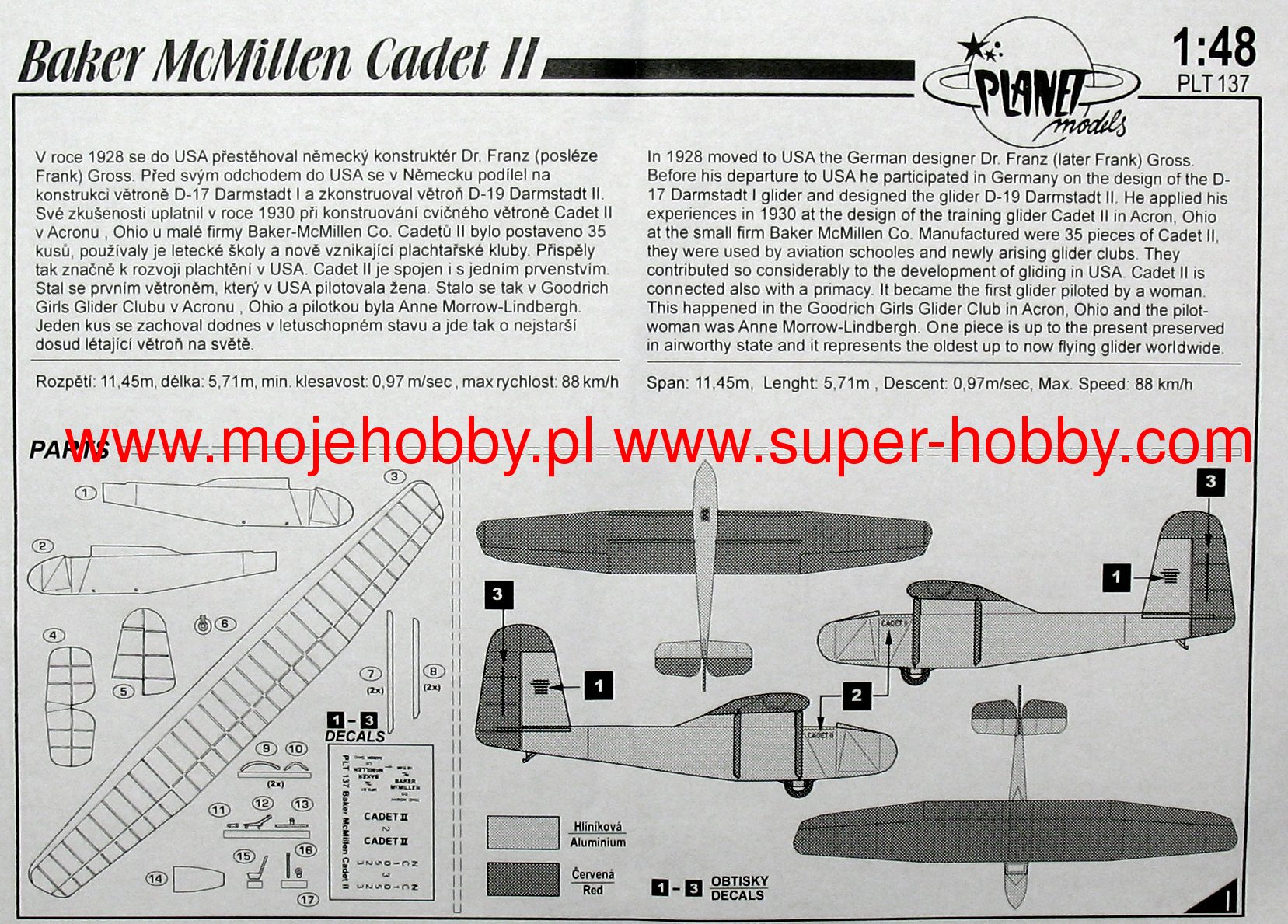 The Baker-McMillan Cadet II was an American sports glider from the interwar period. The aircraft was constructed in the high wing configuration and had an open cockpit. It was 5.71 meters long with a wingspan of 11.45 meters. The empty weight of the sailplane did not exceed 104 kilograms. The Cadet II model was developed by a German immigrant who came to the USA in 1928 - Franz Gross, and shortly after he started working with the Baker-McMillan Company. The flight of the new sailplane took place in 1929, and its short production probably lasted in the years 1929-1930 or 1931. The aircraft was sold almost exclusively on the American market and it is often assumed that it will greatly contribute to the development of gliding in the United States. Production was discontinued as a result of the Great Depression of 1929, which very clearly limited the sales market.