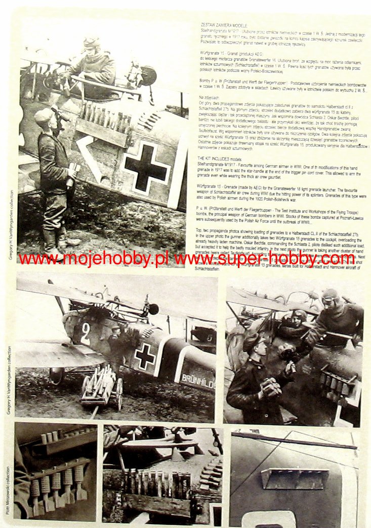 Download Mirage Hobby PDF cataloguePolish military aviation in the period 1919-1939 used quite a large number of types of aerial bombs, two of which are worth mentioning, weighing 50 and 100 kilograms. The first one, the destroying air bomb wz.29, weighing 50 kg. was developed in Starachowickie Zakłady Górniczo-Hutnicze in Starachowice, shortly before the outbreak of the Great Depression in 1929. It was characterized by a drop-shaped cross-section with a fin at the end. The explosives used were mainly TNT or picric acid. It was suspended in a horizontal position. It is worth adding that the improved version of this bomb was called wz.32. The second bomb in turn was also a 100-kilogram high-explosive air bomb, also constructed at Starachowice Zakłady Górniczo-Hutnicze in Starachowice by lieutenant colonel-engineer Apolinary Żebrowski - later a veteran of the September 1939 campaign. The wz.31 bomb had a drop-shaped body and was made of steel sheet. The explosive - as in the wz.29 bombs - was TNT or picric acid. It is worth adding that the wz.31 bomb was often painted gray.