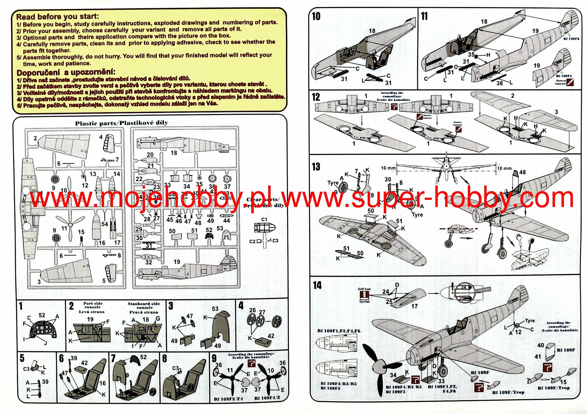 The Messerschmitt Bf-109 is a German metal-structure single-engine fighter in a low wing configuration with a classic tail. It turned out to be the basic and most produced Luftwaffe fighter during World War II. The flight of the prototype took place on May 29, 1935, and serial production continued in the years 1936-1945. In total, it is estimated that a total of about 35,000 Messerschmitt Bf-109 fighters of all varieties were produced, many of which ended up in the Czech and Israeli air forces after the war. The roots of the Bf-109 go back to the competition announced in 1933 by the Luftwaffe for a new fighter plane. In competition with the He-112, the Bf-109 project initially lost, but thanks to Willie Messerschmitt's intrigues, the project could continue and eventually he was the winner of the competition, becoming the Luftwaffe's primary fighter. Several main variants of the Bf-109 were developed in the course of production. The first pre-production series was the Bf-109B (Berta) with different versions of the Junkers Jumo 210 (A or Da) engine. They were tested in Spain from 1937 during the Civil War. The next version is the Bf-109C (Caesar). They had a different engine than the B version, and extensive armament consisting of two 20mm and 2 HP 7.92mm cannons. These machines also fought in the skies of Spain. The third version is the Bf-109D (Dora) with the Junkers Jumo 210 Da or Daimler-Benz DB 600 engine. It fought in the September campaign, but at the turn of 1939/1940 it was replaced by the E version. The most famous model was the Bf-109E (Emil) with a Daimler-Benz 601A or N engine. It was the first to use a three-blade, not a two-blade propeller. Bf-109E fought in the French campaign, over England, and in North Africa and on the Eastern Front. The ace who started his career on the Bf-109E was the famous Adolf Galland. The next version is the Bf-109F (Friedrich), which, according to the German pilots, was the most aerodynamically perfect. It sowed the changed shape of the fuselage, wings, cabin fairings, but no new engine was used. It was put into service at the turn of 1940/1941. As part of the development of the design, further Bf-109 specifications were developed, of which the G (Gustav) version was produced in the largest number of copies. The most important change increasing the machine's performance was the installation of a new 12-cylinder Daimler-Benz DB605A engine with 1475HP. The armament of the Bf-109G was a pair of 13mm machine guns located in the fuselage in front of the cockpit fairing, and the MG151 20mm or heavier MK108 30mm cannon. The last mass-produced version was the Bf-109K (Kurfirst), which production started in October 1944. A Daimler-Benz DB 605DB or DC unit was used as the engine. The Bf-109K was the fastest version produced during World War II, reaching up to 730 km / h. Apart from that, two versions were created - H and Z, but they were rather experimental versions and their mass production did not start. Subsequent improvements in propulsion and armament made the Messerschmitt Bf-109 one of the most dangerous fighters of World War II, and at the same time showed the great potential of the slightly angular airframe created by Willi Messerschmitt. Technical data (version Bf-109 G-6): length: 8.95 m, wingspan: 9.92 m, height: 2.6 m, maximum speed: 640 km / h, rate of climb: 17 m / s, maximum range: 850 km, maximum ceiling 12000m, armament: fixed - 2 MG131 13mm machine guns and 1 MG151 20mm cannon, suspended - 250 kg bombs, or 2 Wfr missile launchers. Gr. 21.