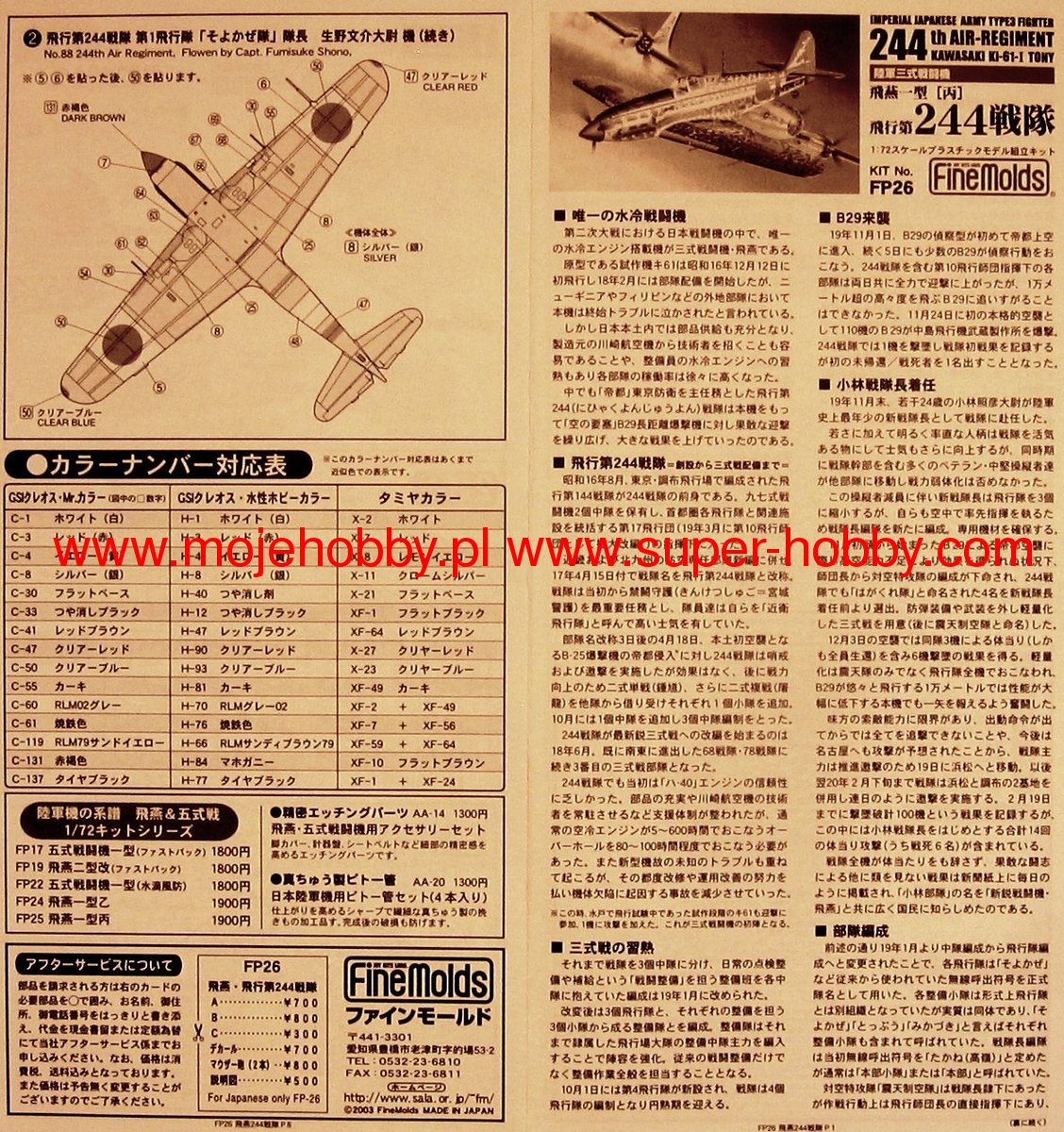 Kawasaki Ki-61 Hien (Japanese flying swallow) is a Japanese, single-engine, metal low wing fighter with a classic tail from the Second World War. The prototype's flight was nice in December 1941, and the first planes reached the line units in February 1943. The heart of the aircraft was the Kawasaki Ha-40 or Ha-140 engine, that is, a liquid-cooled German Daimler-Benz DB 601A built under license. The Ki-61 surprised the Allied forces during the fighting in New Guinea in June 1943, where it was taken as a copy of the German Messerschmitt Me-109, later suspected to be a copy of the Italian Macchi C202 or other Italian fighter. For this reason, he was given the nickname "Antonio" or "Tony". During the fights in 1943, Ki-61 fighters demonstrated their considerable advantage over American machines, such as the F-4 Wildcat. The Ki-61 later fought over the skies of New Britain and New Ireland, and in 1944 they were used in combat in the Philippines. Later they were used to defend the Japanese islands. Some of them have become kamikaze planes. The Ki-61 was undoubtedly a very good fighter, but its Achilles' heel was limited in series production due to problems with the engines. Technical data (version Ki-61-I): length: 8.94m, wingspan: 12m, height: 3.7m, maximum speed: 580km / h, rate of climb: 15.2m / s, maximum range: 580km, ceiling maximum 11,600m, armament: fixed - 2 12.7mm Ho-103 machine guns and 2 20mm Ho-5 cannons, suspended - up to 500 kg of bombs.