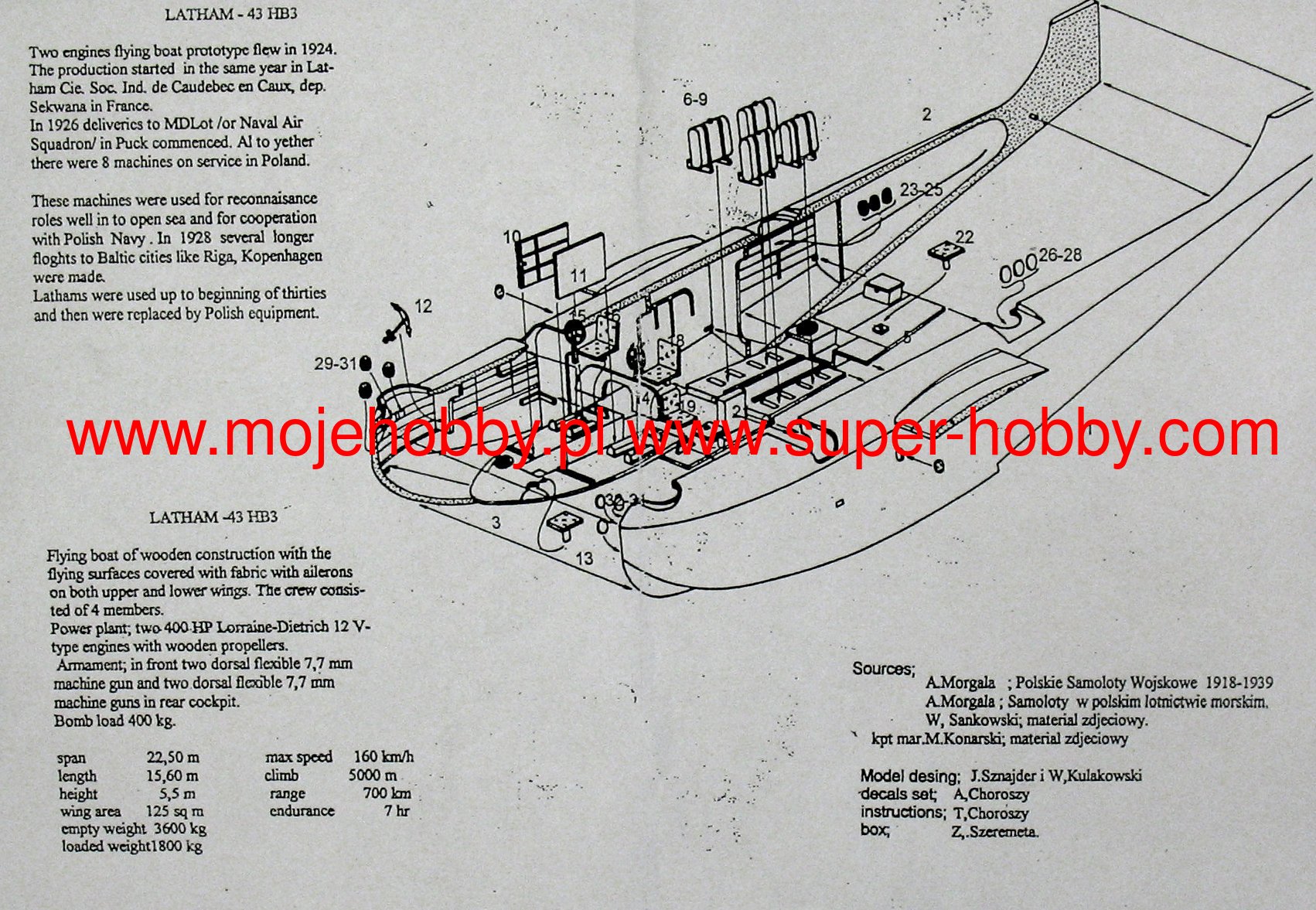 The Latham 43 is a French four-seater reconnaissance bomber flying boat in a mixed structure, in a biplane configuration. The drive was provided by two Lorraine-Dietrch 14 in-line engines with 400 HP each. The flight of the prototype took place in 1924, and mass production began in the same year. The firing armament consisted of 2 to 4 7.69 mm machine guns, and the load capacity was up to 400 kg. bombs. The Latham 43 machine was created as a result of a grassroots initiative by French plants with this name, which intended to attract the interest of the French armed forces with its construction. The effort paid off and in 1924 the Latham 43 entered the aviation equipment of the French Navy. However, it was quickly found that the machine is not very modern, it is not very susceptible to modernization, as a result of which the machines were transferred to school and training units. In 1926, eight Latham 43 planes also entered the service of the Polish Navy in which they served as part of the Naval Aviation Squadron based in Puck. They were used intensively in this squadron for training and reconnaissance purposes. Due to the considerable wear and tear of the structure, all machines of this type were withdrawn from service by 1934.