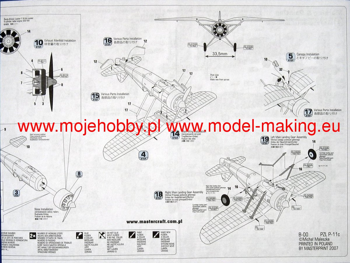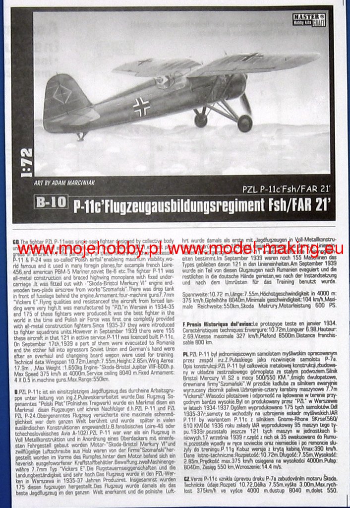 Note: Comany Mistercraft frequently changes, without any notice, the decals that come with the model, so they may differ from the photos and descriptions on our website. If you need a specific version, please let us know about that by entering the appropriate notice in the comments field when placing the order. The PZL P.11a (the so-called eleven) is a Polish, single-engine fighter plane with a metal structure with Puławski wings, a classic tail and a fixed landing gear. The flight of the prototype took place in 1931, but serial production continued in 1937-1939. The first serial version is the PZL P.11a powered by the Bristol Mercury IV S2 engine with a power of 550 HP. However, it was treated as a transitional version and only 50 were ordered. The most famous version of the "eleven" - PZL P.11c - appeared in the summer. It had an improved fuselage, wings and a vertical stabilizer. It all improved the aerodynamics of the plane. The drive unit has not changed. The interest in the construction was expressed by, among others, Romania, where 95 units of the licensed PZL P.11 were manufactured at the IAR plants. At the outbreak of the war, all versions of the P.11 were much slower than their German opponents, but at the same time had greater maneuverability, high rate of climb and a less emergency engine than German planes. They had many victories over the enemy during the September campaign, mainly as part of the Pursuit Brigade. Technical data (version P.11c): length: 7.55m, wingspan: 10.72m, height: 2.85m, maximum speed: 367km / h, rate of climb: 14.5m / s, maximum ceiling: 8000m, range maximum: 550 km, armament: fixed - 2 machine guns wz.33 cal.7.92 mm.