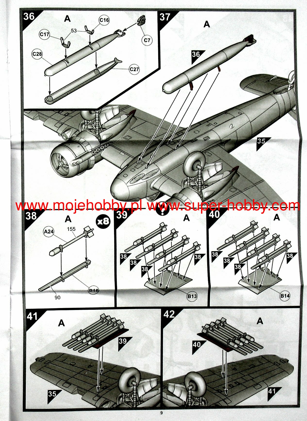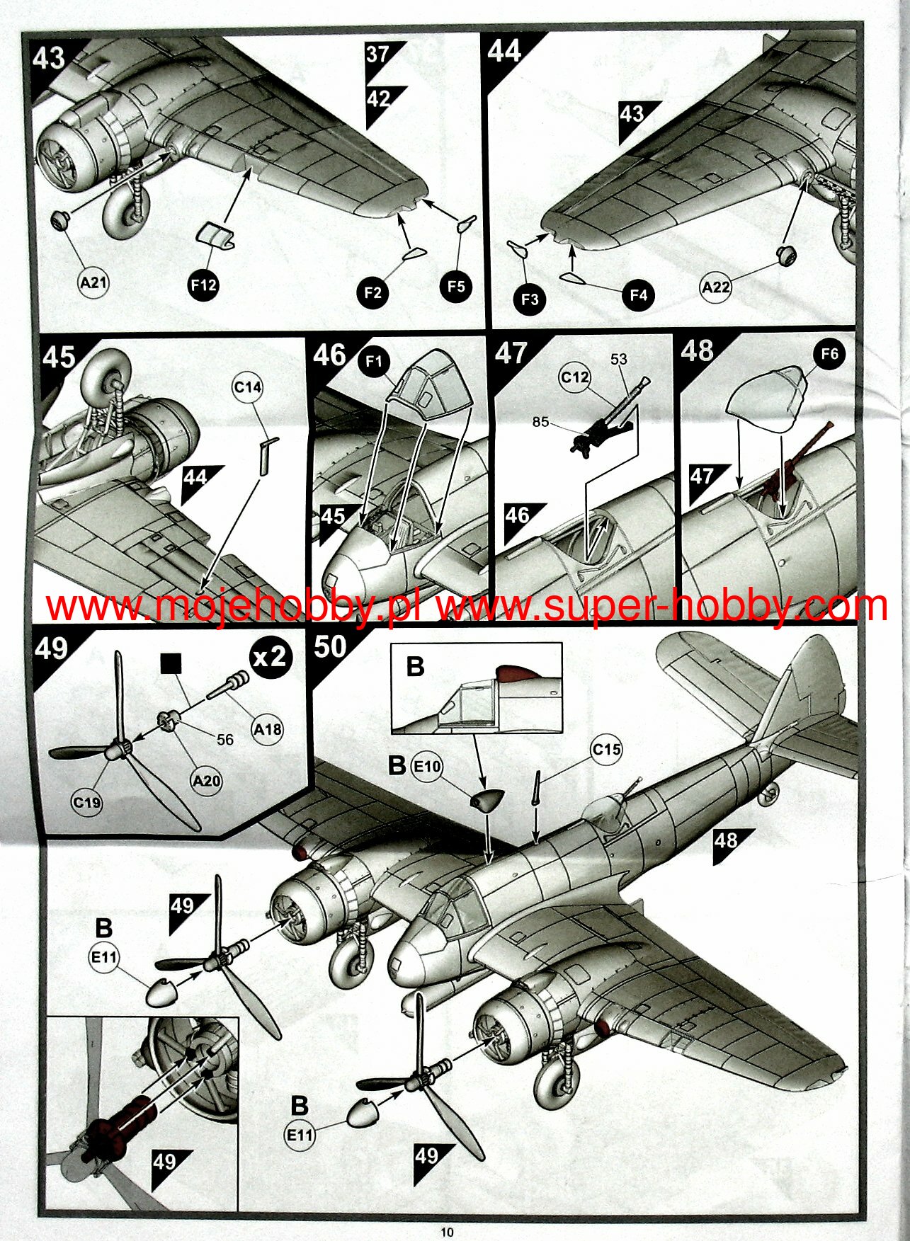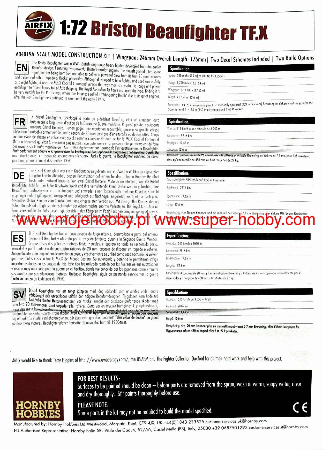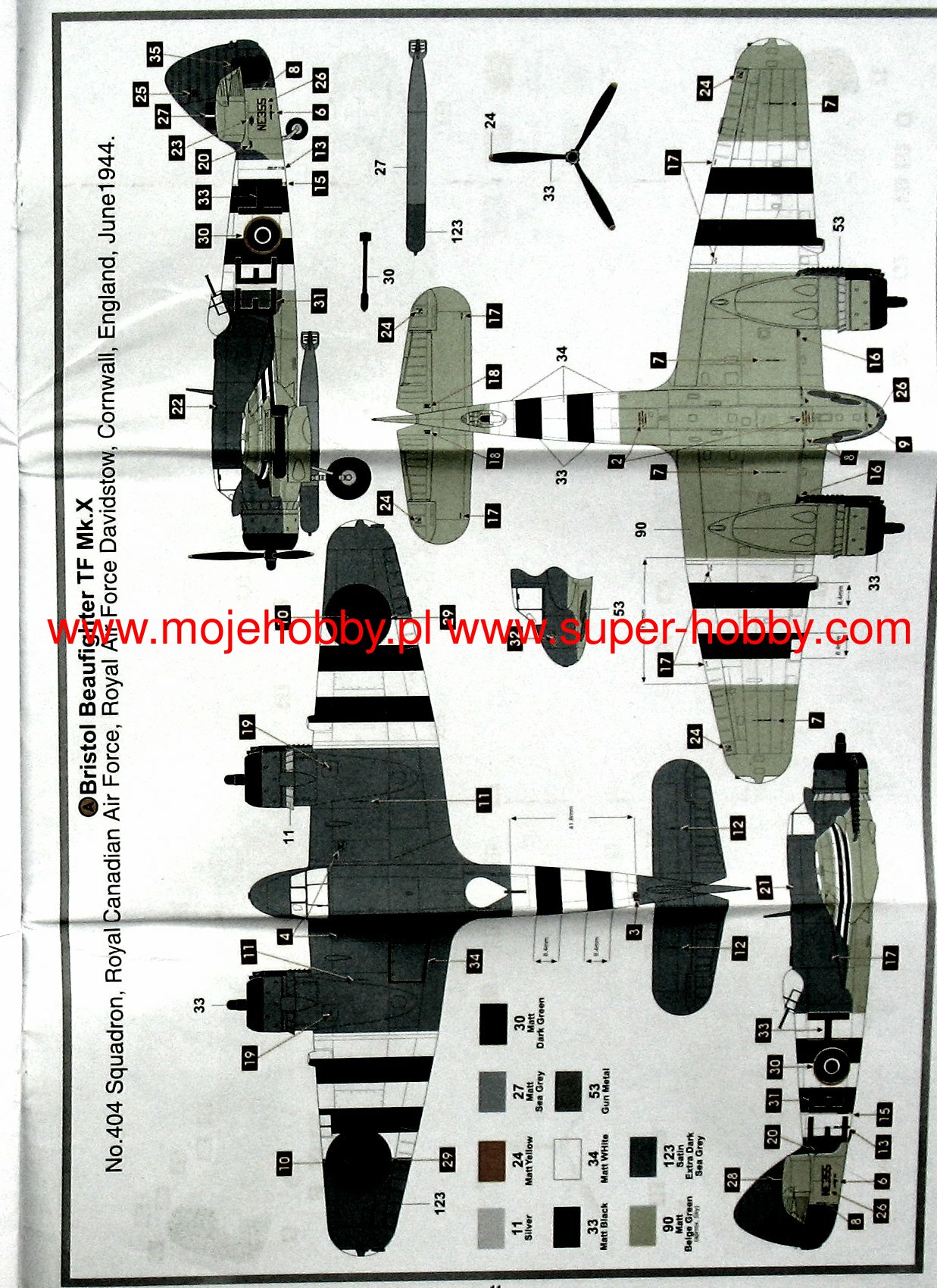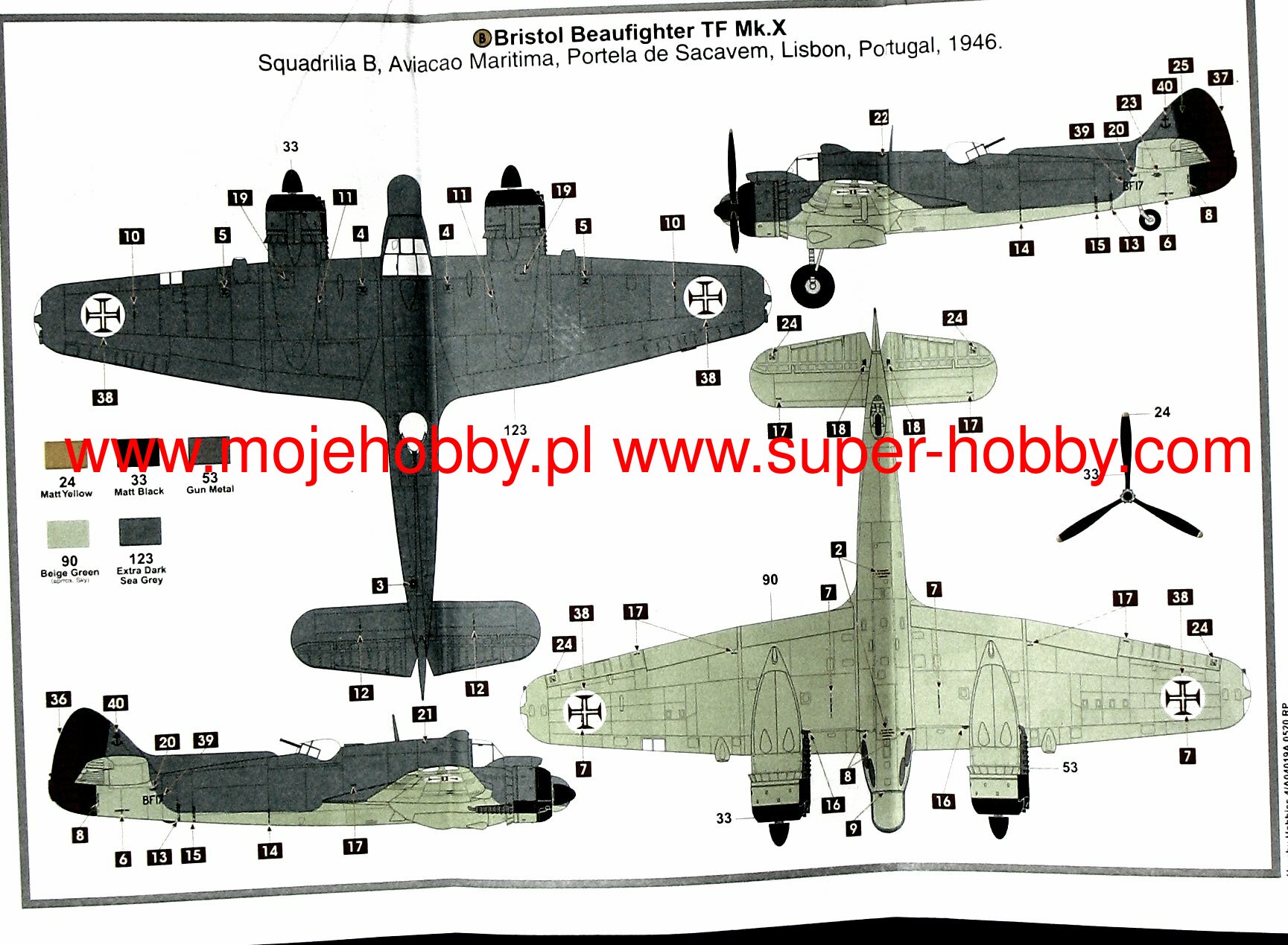 The Bristol Beaufighter is a British heavy, twin-engined night fighter, attack aircraft and torpedo plane, with a full metal, half-shell structure. It flew for the first time on June 17, 1939, and its serial production started in the same year. During the war, many versions of the Beaufighter were created, including Mk.I, Mk.II, TF Mk.X or TF Mk.XI. The Mk.I version was the first to function as a night fighter and was equipped with the AI Mk. IV. It also had strong armament: 4 20mm cannons and 6 7.7mm MGs. Mk..X version. was the last to be produced in large numbers and combined the advantages of a fighter plane with the strike force of a torpedo bomber. This version was powered by Bristol Hercules XVII engines with a capacity of 1770HP. Bristol Beaufighter planes served a total of 53 squadrons of the RAF, 15 squadrons of the Royal Navy and the Polish 307 Squadron of Lwowskie Puchacze. All versions and models of this plane were not easy to pilot and suffered badly from spinning and problems caused by the failure of one engine. In addition, the Bristol Beaufighter had a very weak rudder which resulted in poor directional stability. Mainly for these reasons, from 1943 they were successively replaced on the front lines by the DeHavilland Mosquito. Technical data: Maximum speed: 512 km / h, speed of climb: 8.17 m / s, maximum ceiling 5800 m, maximum range: 2816 km, armament (hunting version): fixed - 4 20mm Hispano cannons and 6 rifles machine gun caliber 7.7 mm, suspended-up to 906 kg of bombs.