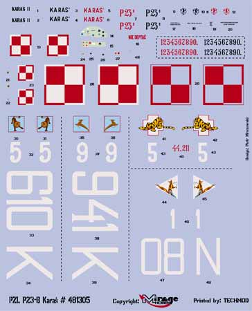 Download Mirage Hobby PDF catalogueFrom the fall of 1932, three prototypes were built, marked with symbols: PZL - 23 / I, PZL - 23 / II and PZL - 23 / III. Strength and static tests of the PZL - 23 / I were completed in the second half of 1933. The prototype took off at the end of 1934. In subsequent experimental versions, many improvements were made, such as: elimination of vibration of the rear part of the fuselage and height tail, strengthening of the airframe structure, improvement visibility from the pilot's seat by increasing the cabin glazing, lowering the engine mounting place by 10 cm, the use of a new ring with a lower Cx coefficient, the bomb chamber in the fuselage was removed, ejectors were moved under the wings and under the fuselage, and many others. In total, over 100 changes have been made and several hundred bugs have been fixed. The model version under the name PZL - 23 Karaś A was introduced into production (from mid-1935) in the number of 40 pieces in the new PZL WP-1 plant (Podlaskie Zakłady Lotnicze - Wytwórnia Płatowców No. 1) and successively entered the armament of the 1st Aviation Regiment and were exported to Bulgaria. During the operation of this aircraft, new defects appeared (including too weak engine, reaching a low altitude with full weapons, low efficiency of the gills, etc.). As a result of the elimination of these defects, the second version of the PZL - 23 Karaś B aircraft was created. It had a more powerful engine (Bristol Pegasus VIII with 680 HP, gills were removed, improved profiling of the transition between the fuselage and the wing was introduced). The contract with PZL was for the production of 210 aircraft in version B. In the fall of 1936, they began to be delivered to aviation regiments. In the second half of the 1930s, the PZL - 23 B Karaś aircraft became the basic line aircraft, while the A version of the Karasie was withdrawn for schooling. While serving in the Polish Military Aviation, Karas was used in several larger actions. In 1937, the Karasi B squadron from 1 PL carried out a demonstration sharp bombing of a small railway station on the Chełm - Brest n / B line. Several line squadrons were concentrated at the Vilnius - Porubanek airport as part of a demonstration of strength against neighboring Lithuania, while in October 1938 a dozen or so Karas from various regiments were stationed at the airport in Aleksandrów, securing the capture of Zaolzie. According to the rules, the use of Karasi was intended for the performance of intervention tasks. In the September campaign, they performed some combat tasks and aerial reconnaissance. Airplanes included in the army squadrons bombed armored columns, carried out long reconnaissance raids on the territories of Germany, Slovakia and East Prussia. The first facility to be bombed on the enemy's territory was a factory near Oława. Strategic objects in East Prussia were bombed. A large number of tasks performed resulted in approx. 90% losses in airplanes. In total, 112 Karasi were shot down in the September campaign, and only 11 machines were evacuated to Romania (three from the 31 squadron and eight from the 24 reconnaissance squadron). In addition, there were 30 Karasi in version A with CWL - 1 in Romania (they crossed the border on September 16, 1939). After Romania was included in the Pact of Three, the interned Karas was exchanged for German weapons and a reconnaissance and training squadron was formed. The Romanians used Karasi on the Eastern Front. The last Karas was used in Romania until 1946 as an air target tugboat. Technical data (version B): length: 9.68 m, wingspan: 13.95 m, height: 3.3 m, maximum speed: 319 km / h, climb speed: 6.7 m / s, practical ceiling: 7300 m, maximum range: 1260 km, armament: fixed - 2 Vickers F machine guns cal. 7.7 mm, 1 machine gun wz.33 cal. 7.92 mm, suspended - up to 700 kg of bombs.