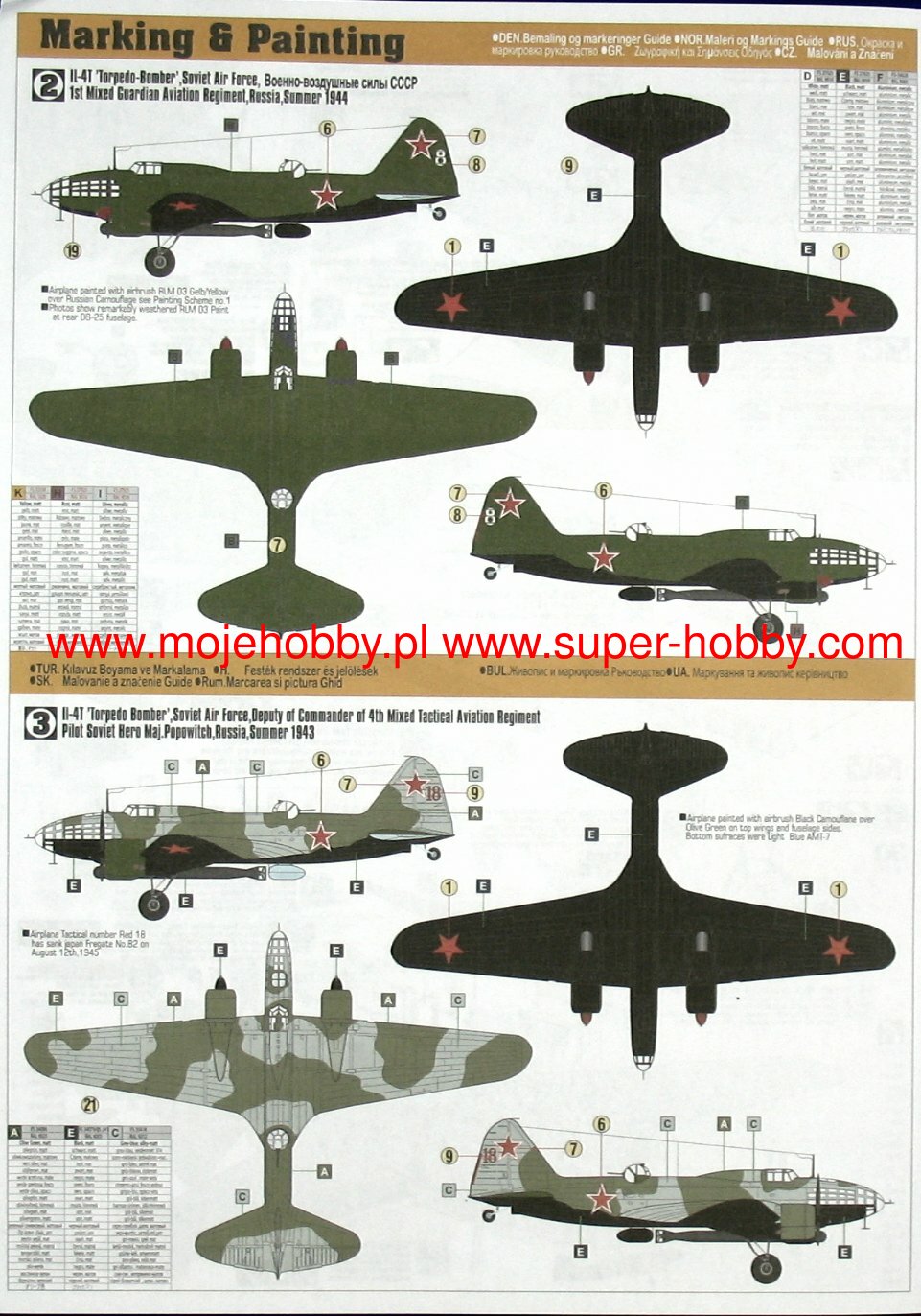 Note: Comany Mistercraft frequently changes, without any notice, the decals that come with the model, so they may differ from the photos and descriptions on our website. If you need a specific version, please let us know about that by entering the appropriate notice in the comments field when placing the order. Ilyushin Ił-4 (DB-3F) is a Soviet, twin-engine, low-wing medium bomber from the Second World War. The Il-4 was a far-reaching modernization of the DB-3 aircraft. The changes concerned, inter alia, the structure of the airframe and wing and, above all, the use of duralumin instead of steel on a much larger scale. The flight of the Il-4 machine took place in 1940, and it entered service a year later. Serial production continued until 1944. In its course, there were also further improvements - self-sealing fuel tanks, the use of protective weapons with a larger caliber, and above all the use of Tumanski M-88B 14-cylinder engines with a capacity of 1100 HP, in place of the Tumanski M-88 engines with a capacity of 1000 HP. Ilyushin Il-4 was the primary medium bomber of the Soviet Air Force throughout the war. It was used in many operations on the Eastern Front, especially in the period 1942-1943, as well as in several propaganda bombing raids over Berlin. The Il-4T aircraft was also used as a long-range torpedo bomber. About 5256 copies of this machine were produced globally. Technical data: length: 14.76m, wingspan: 21.44m, height: 4.1m, maximum speed: 410km / h, rate of climb: 6.9m / s, maximum range: 3800km, maximum ceiling 8700m, armament (early production series): fixed - three 7.62 mm SzKAS machine guns, suspended - up to 2700 kg of bombs.