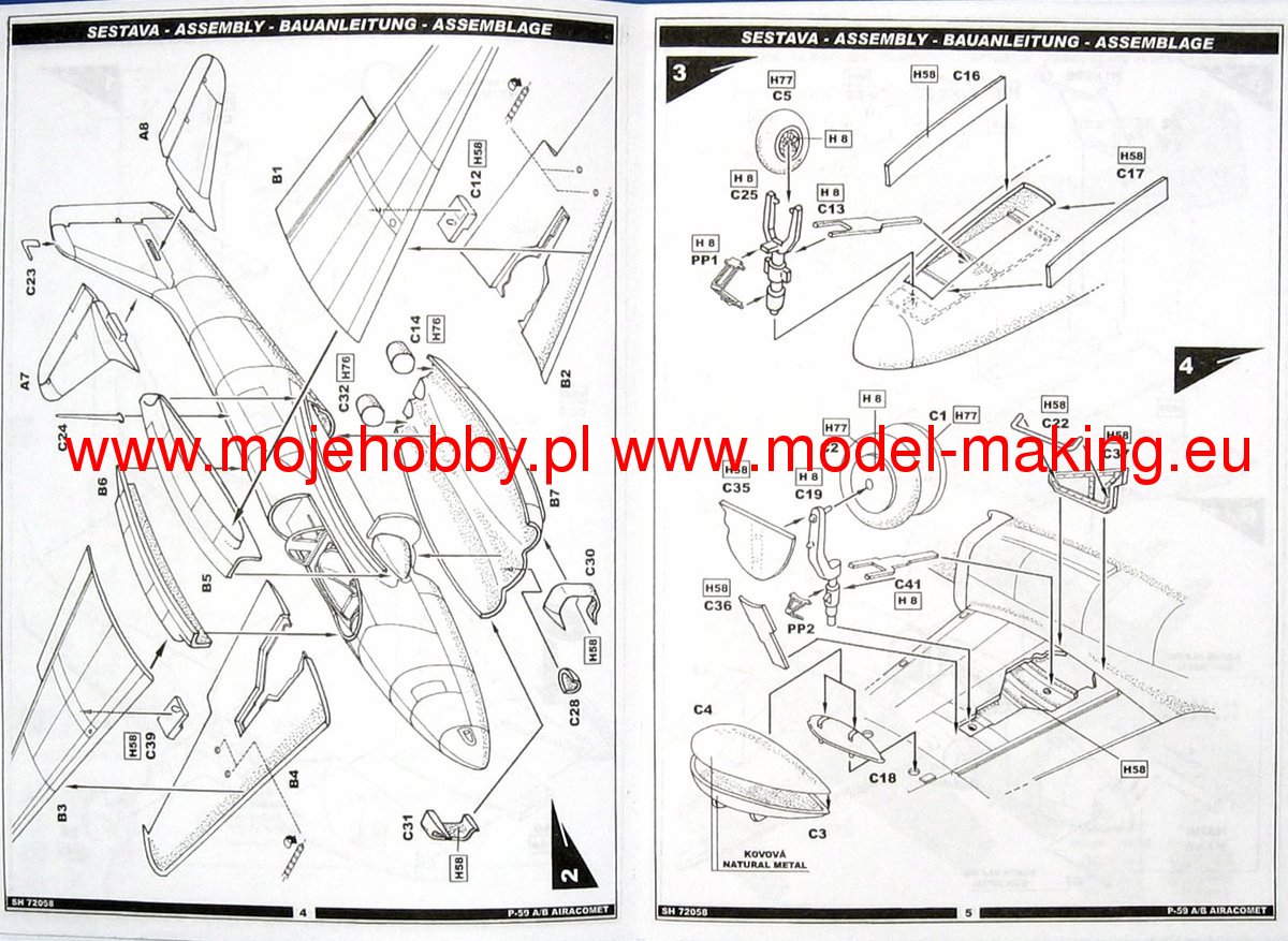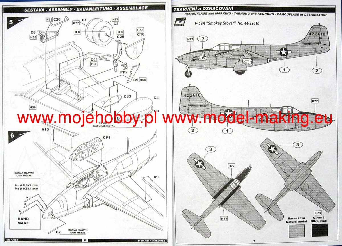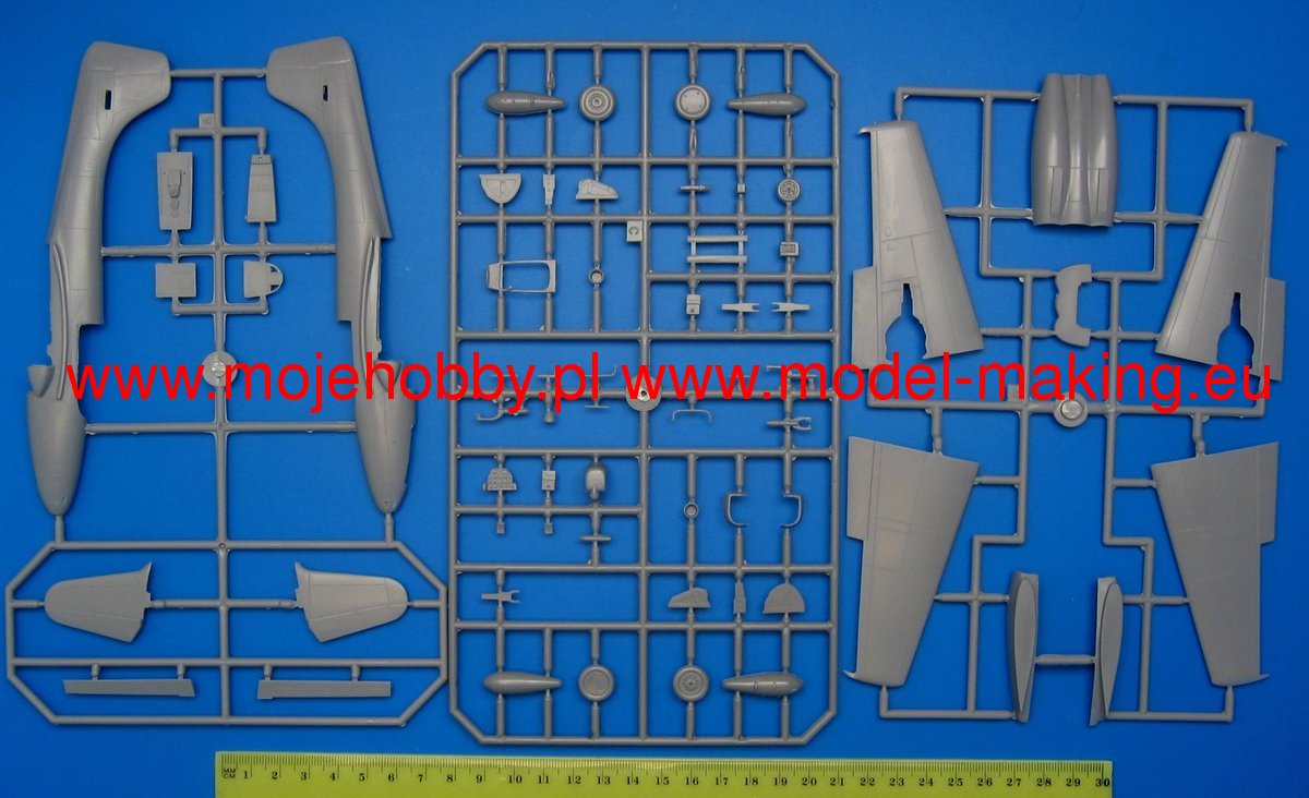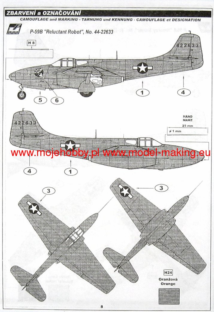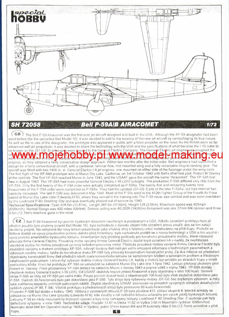 We wrzeœniu 1941 roku, zakłady lotnicze Bell Aircraft otrzymały zlecenie opracowania projektu myœliwca o napędzie turbinowo-odrzutowym. Prace prowadzone były w bardzo szybkim tempie i już miesišc póŸniej pierwszy prototyp samolotu był gotowy. Maszyna, oznaczona została "XP-59", a swój pierwszy lot wykonała 5 paŸdziernika 1942 roku. Samolot ten, nazwany póŸniej Airacomet był pierwszym amerykańskim samolotem o napędzie odrzutowym. Napęd stanowiły dwa silniki General Electric I-A. Airacomet miał metalowš konstrukcję, klasyczne usterzenie oraz chowane w locie podwozie z kółkiem przednim. Pierwsze próby w locie nastręczały wiele kłopotów, gdyż silniki zachowywały się bardzo niestabilnie. Potrafiły, na przykład, zgasnšć w trakcie lotu i nie dawały się ponownie uruchomić. Drugi prototyp, wyposażony w mocniejsze silniki typu General Electric J31, oblatany został 15 lutego 1943 roku, a pierwsze maszyny serii próbnej pojawiły się w sierpniu 1943 roku. Dwa samoloty z tej serii przekazano do US Navy w celu sprawdzenia przydatnoœci Airacomet jako maszyny pokładowej. Przeprowadzone zostały także testy porównawcze "P-59" z samolotami myœliwskimi "P-47 Thunderbolt" oraz "P-38 Lightning". Okazało się, że "Airacomet" był szybszy od swoich konkurentów, lecz mniej zwrotny. Oba samoloty przewyższały go także walorami myœliwskimi. W zwišzku z tym podjęto decyzję o zredukowaniu zamówienia na "P-59" z planowanych poczštkowo 100 sztuk do zaledwie 20. Wyprodukowane maszyny przeznaczone zostały do szkolenia. Dane techniczne: długoœć: 11,84m, rozpiętoœć skrzydeł: 13,87m, wysokoœć: 3,76m, prędkoœć maksymalna: 665km/h, zasięg maksymalny: 604km, pułap praktyczny: 14000m, uzbrojenie: stałe- 3 karabiny maszynowe kal.12,7mm oraz 1 działko kal.37mm, podwieszane-do 908 kg bomb. Co oprócz modelu będę potrzebować do jego sklejenia?