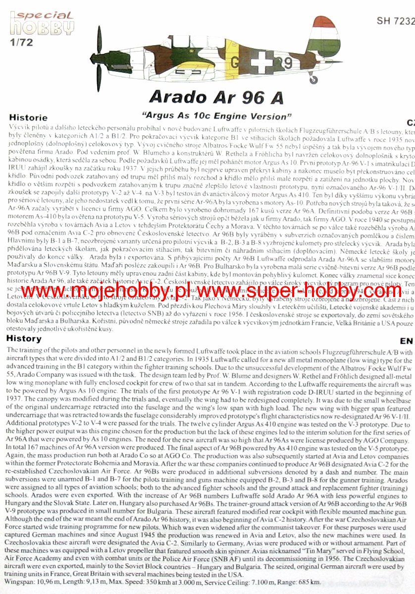 The Arado Ar 96 aircraft was a training machine used mainly for learning advanced piloting and air combat during World War II. Conceptual and design works began in 1935, and serial production lasted from 1939 to 1945. Apart from the Luftwaffe, Ar 96 was also used by Hungarians. The plane was powered by an Argus AS 410 engine with 465 HP and armed with a MG17 machine gun. Production was about 2,800 pcs. After the war, Czechoslovakia used the Ar 96 in its aviation schools under the changed name Avia / Letov C-2. Technical data: Top speed: 330 km / h; altitude: 7100 m, range: 990 km, weapons: 1 MG17 7.92 mm machine gun.
