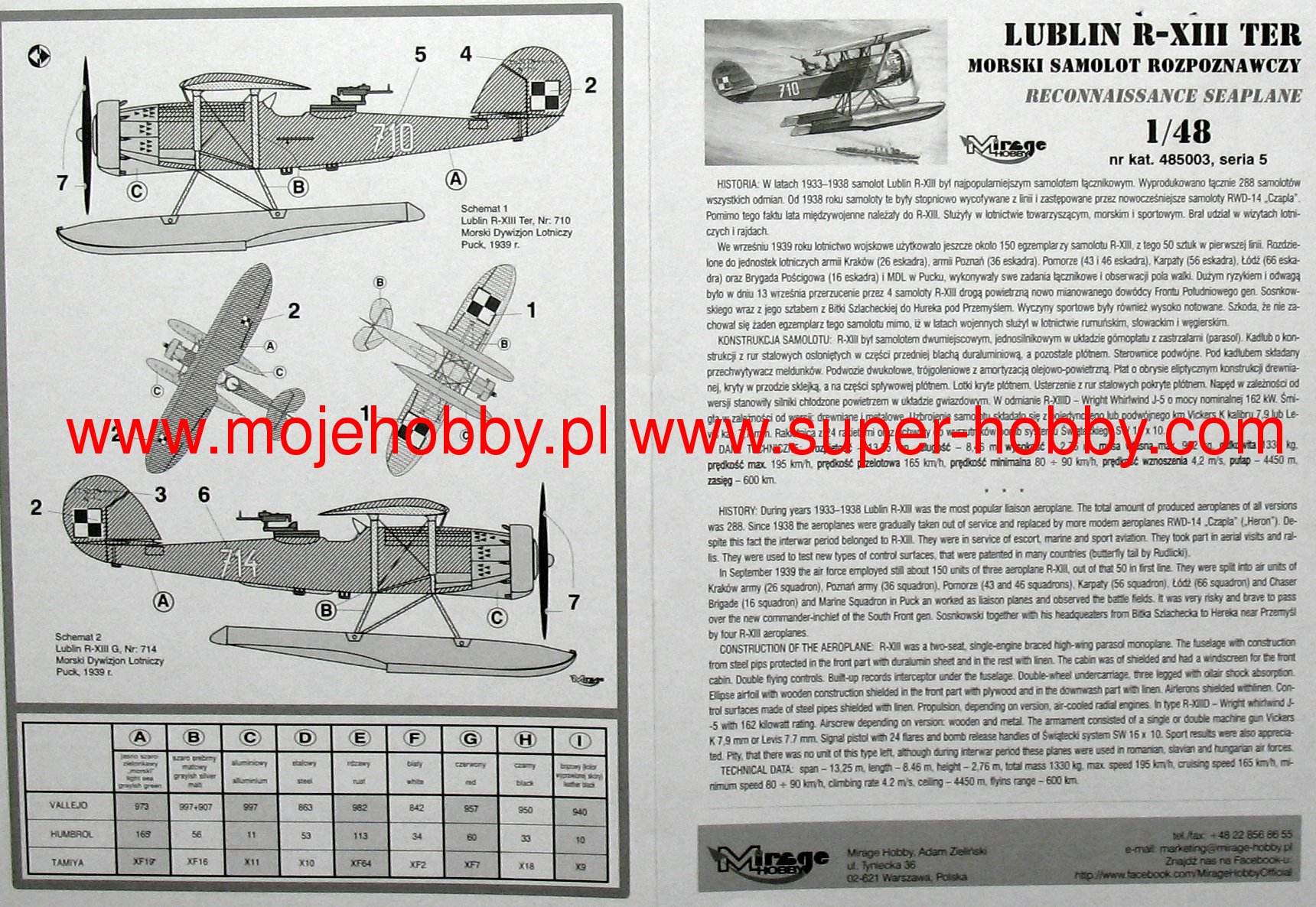 Lublin R. XIII was a Polish liaison and accompanying aircraft (in cooperation with the army) of mixed construction, in the high wing configuration, with a fixed undercarriage. The drive was provided by a single engine Skoda-Whirlwind J5B with a power of 220 hp. The flight of the prototype took place in 1931 - in the same year serial production began, which led to the creation of 273 machines of this type. The armament was 1 Vickers K machine gun cal. 7.7 mm. Lublin R.XIII was created as a development of the R.XIV aircraft at Zakłady Mechaniczne Plage i Laśkiewicz (LWS). Compared to the original, it had a different shape of the vertical stabilizer, a slightly changed shape of the wing and a radio station. Lublin R.XIII was a successful structure, with a low failure rate, easy to operate and pilot, as well as to be operated from field airports. The first production series was called R.XIIIA, which was later upgraded to R.XIIIB. Shortly thereafter, aerodynamically improved C and D versions were developed. In 1932, a version with floats was also created - Lublin R.XIII bis / hydro. Aircraft of this type (around 150) took part in the September campaign in 1939.Download Mirage Hobby PDF catalogue