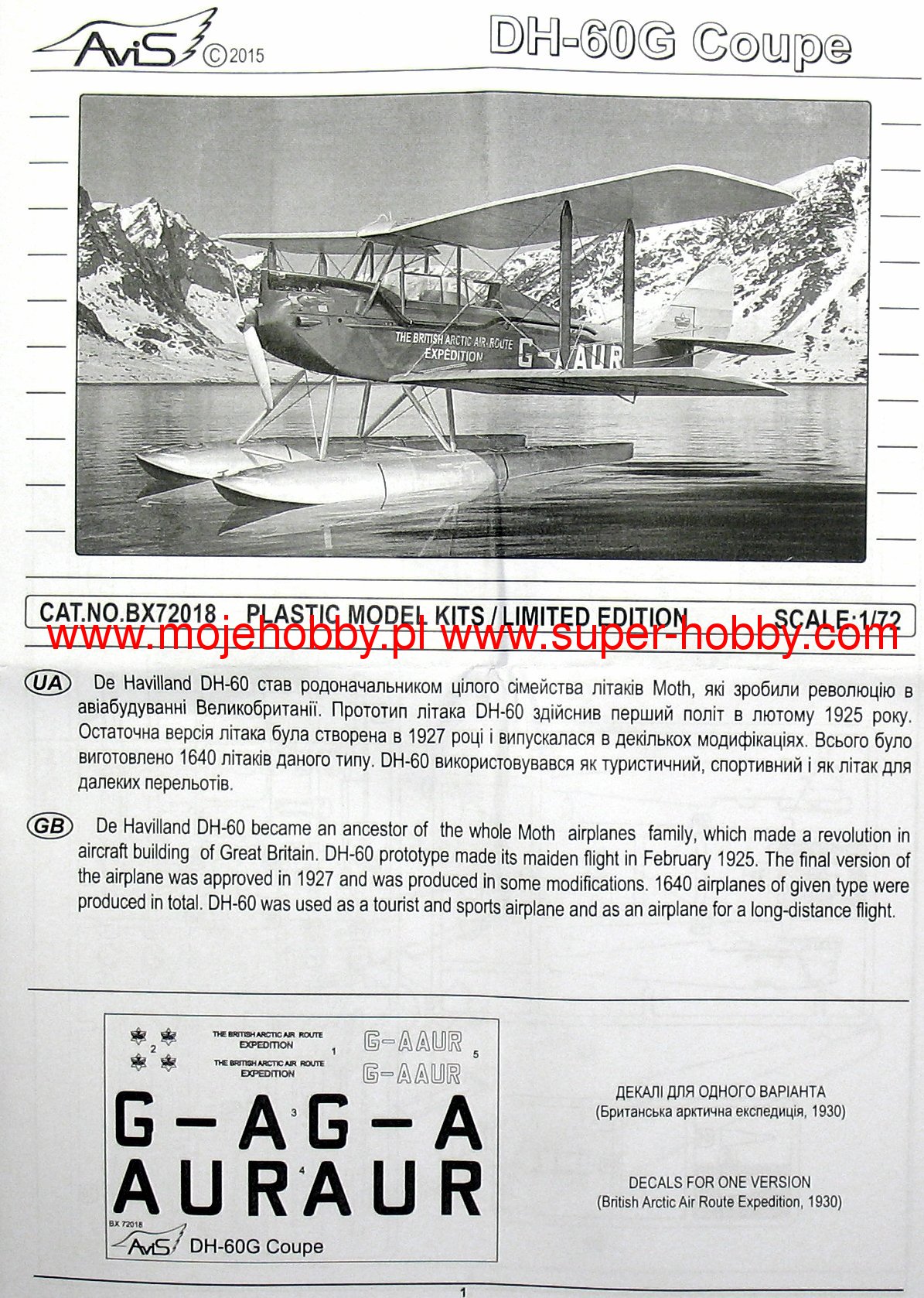 The De Havilland DH.60 Moth (moth) was a British training and sports plane with a fixed landing gear biplane from the interwar period and World War II. The drive was usually provided by a single motor ADC Cirrus or de Havilland Gipsy with the power of 60 and 120 HP, respectively. The prototype flew in 1925. The plane did not have permanent weapons. The DH.60 Moth was created as a private initiative of De Havilland Aircraft Company Ltd., which wanted to conquer the British market for light training and sports aircraft. Many proven solutions were used for its construction, but an air-cooled in-line engine was also used, which was quite a novelty at that time. The DH.60 Moth aircraft turned out to be successful - it had great handling qualities, was not very malfunctioning and was very maneuverable. During its serial production, many development versions were created for the needs of domestic and foreign customers. In 1927, the machine designated as DH.60X (later DH.60 Cirrus II Moth) was launched into production, powered by the ADC Cirrus II engine with a capacity of 85 HP. The most popular version was the DH.60 Gipsy Moth, powered by a motor de Havilland Gipsy II or III with 100 to 120 HP. There were also DH.60 seaplanes. The last development version was DH.60T, a military training plane dedicated primarily to foreign customers. DH.60 planes have been delivered to many foreign recipients, including Australia, Austria, Belgium, Brazil, China, Finland, Poland and Sweden.