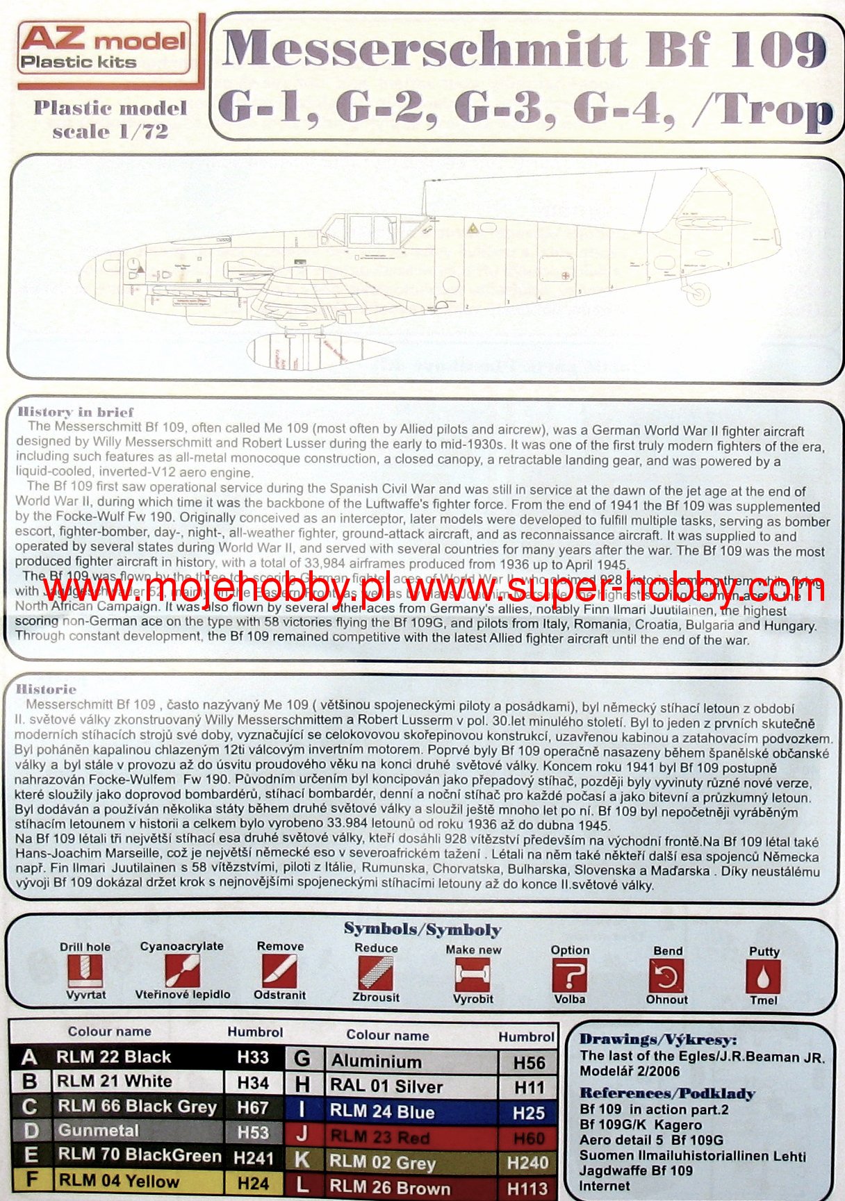 The Messerschmitt Bf-109 is a German metal-structure single-engine fighter in a low wing configuration with a classic tail. It turned out to be the basic and most produced Luftwaffe fighter during World War II. The flight of the prototype took place on May 29, 1935, and serial production continued in the years 1936-1945. In total, it is estimated that a total of about 35,000 Messerschmitt Bf-109 fighters of all varieties were produced, many of which ended up in the Czech and Israeli air forces after the war. The roots of the Bf-109 go back to the competition announced in 1933 by the Luftwaffe for a new fighter plane. In competition with the He-112, the Bf-109 project initially lost, but thanks to Willie Messerschmitt's intrigues, the project could continue and eventually he was the winner of the competition, becoming the Luftwaffe's primary fighter. Several main variants of the Bf-109 were developed in the course of production. The first pre-production series was the Bf-109B (Berta) with different versions of the Junkers Jumo 210 (A or Da) engine. They were tested in Spain from 1937 during the Civil War. The next version is the Bf-109C (Caesar). They had a different engine than the B version, and extensive armament consisting of two 20mm and 2 HP 7.92mm cannons. These machines also fought in the skies of Spain. The third version is the Bf-109D (Dora) with the Junkers Jumo 210 Da or Daimler-Benz DB 600 engine. It fought in the September campaign, but at the turn of 1939/1940 it was replaced by the E version. The most famous model was the Bf-109E (Emil) with a Daimler-Benz 601A or N engine. It was the first to use a three-blade, not a two-blade propeller. Bf-109E fought in the French campaign, over England, and in North Africa and on the Eastern Front. The ace who started his career on the Bf-109E was the famous Adolf Galland. The next version is the Bf-109F (Friedrich), which, according to the German pilots, was the most aerodynamically perfect. It sowed the changed shape of the fuselage, wings, cabin fairings, but no new engine was used. It was put into service at the turn of 1940/1941. As part of the development of the design, further Bf-109 specifications were developed, of which the G (Gustav) version was produced in the largest number of copies. The most important change increasing the machine's performance was the installation of a new 12-cylinder Daimler-Benz DB605A engine with 1475HP. The armament of the Bf-109G was a pair of 13mm machine guns located in the fuselage in front of the cockpit fairing, and the MG151 20mm or heavier MK108 30mm cannon. The last mass-produced version was the Bf-109K (Kurfirst), which production started in October 1944. A Daimler-Benz DB 605DB or DC unit was used as the engine. The Bf-109K was the fastest version produced during World War II, reaching up to 730 km / h. Apart from that, two versions were created - H and Z, but they were rather experimental versions and their mass production did not start. Subsequent improvements in propulsion and armament made the Messerschmitt Bf-109 one of the most dangerous fighters of World War II, and at the same time showed the great potential of the slightly angular airframe created by Willi Messerschmitt. Technical data (version Bf-109 G-6): length: 8.95 m, wingspan: 9.92 m, height: 2.6 m, maximum speed: 640 km / h, rate of climb: 17 m / s, maximum range: 850 km, maximum ceiling 12000m, armament: fixed - 2 MG131 13mm machine guns and 1 MG151 20mm cannon, suspended - 250 kg bombs, or 2 Wfr missile launchers. Gr. 21.