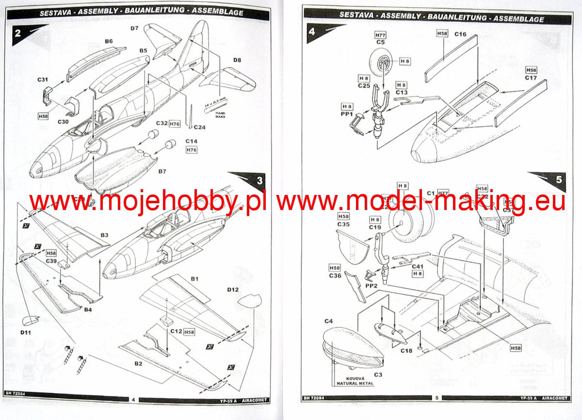 We wrzeniu 1941 roku, zakłady lotnicze Bell Aircraft otrzymały zlecenie opracowania projektu myliwca o napędzie turbinowo-odrzutowym. Prace prowadzone były w bardzo szybkim tempie i już miesišc póniej pierwszy prototyp samolotu był gotowy. Maszyna, oznaczona została "XP-59", a swój pierwszy lot wykonała 5 padziernika 1942 roku. Samolot ten, nazwany póniej Airacomet był pierwszym amerykańskim samolotem o napędzie odrzutowym. Napęd stanowiły dwa silniki General Electric I-A. Airacomet miał metalowš konstrukcję, klasyczne usterzenie oraz chowane w locie podwozie z kółkiem przednim. Pierwsze próby w locie nastręczały wiele kłopotów, gdyż silniki zachowywały się bardzo niestabilnie. Potrafiły, na przykład, zgasnšć w trakcie lotu i nie dawały się ponownie uruchomić. Drugi prototyp, wyposażony w mocniejsze silniki typu General Electric J31, oblatany został 15 lutego 1943 roku, a pierwsze maszyny serii próbnej pojawiły się w sierpniu 1943 roku. Dwa samoloty z tej serii przekazano do US Navy w celu sprawdzenia przydatnoci Airacomet jako maszyny pokładowej. Przeprowadzone zostały także testy porównawcze "P-59" z samolotami myliwskimi "P-47 Thunderbolt" oraz "P-38 Lightning". Okazało się, że "Airacomet" był szybszy od swoich konkurentów, lecz mniej zwrotny. Oba samoloty przewyższały go także walorami myliwskimi. W zwišzku z tym podjęto decyzję o zredukowaniu zamówienia na "P-59" z planowanych poczštkowo 100 sztuk do zaledwie 20. Wyprodukowane maszyny przeznaczone zostały do szkolenia. Dane techniczne: długoć: 11,84m, rozpiętoć skrzydeł: 13,87m, wysokoć: 3,76m, prędkoć maksymalna: 665km/h, zasięg maksymalny: 604km, pułap praktyczny: 14000m, uzbrojenie: stałe- 3 karabiny maszynowe kal.12,7mm oraz 1 działko kal.37mm, podwieszane-do 908 kg bomb. Co oprócz modelu będę potrzebować do jego sklejenia?