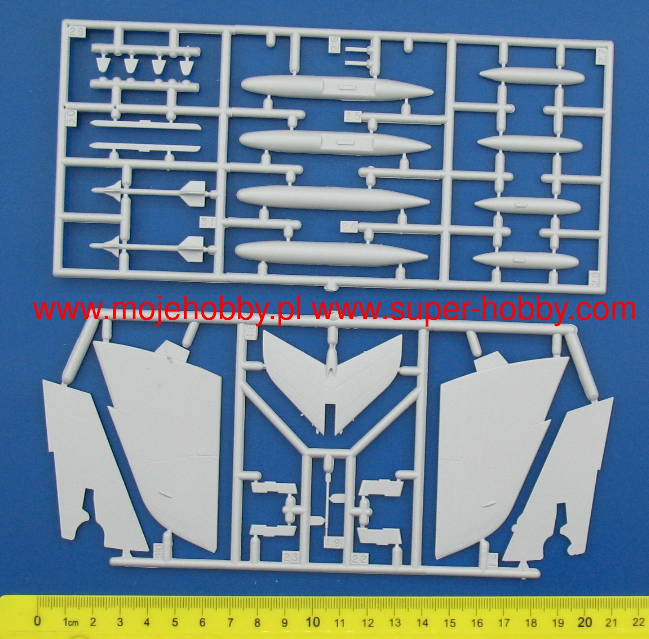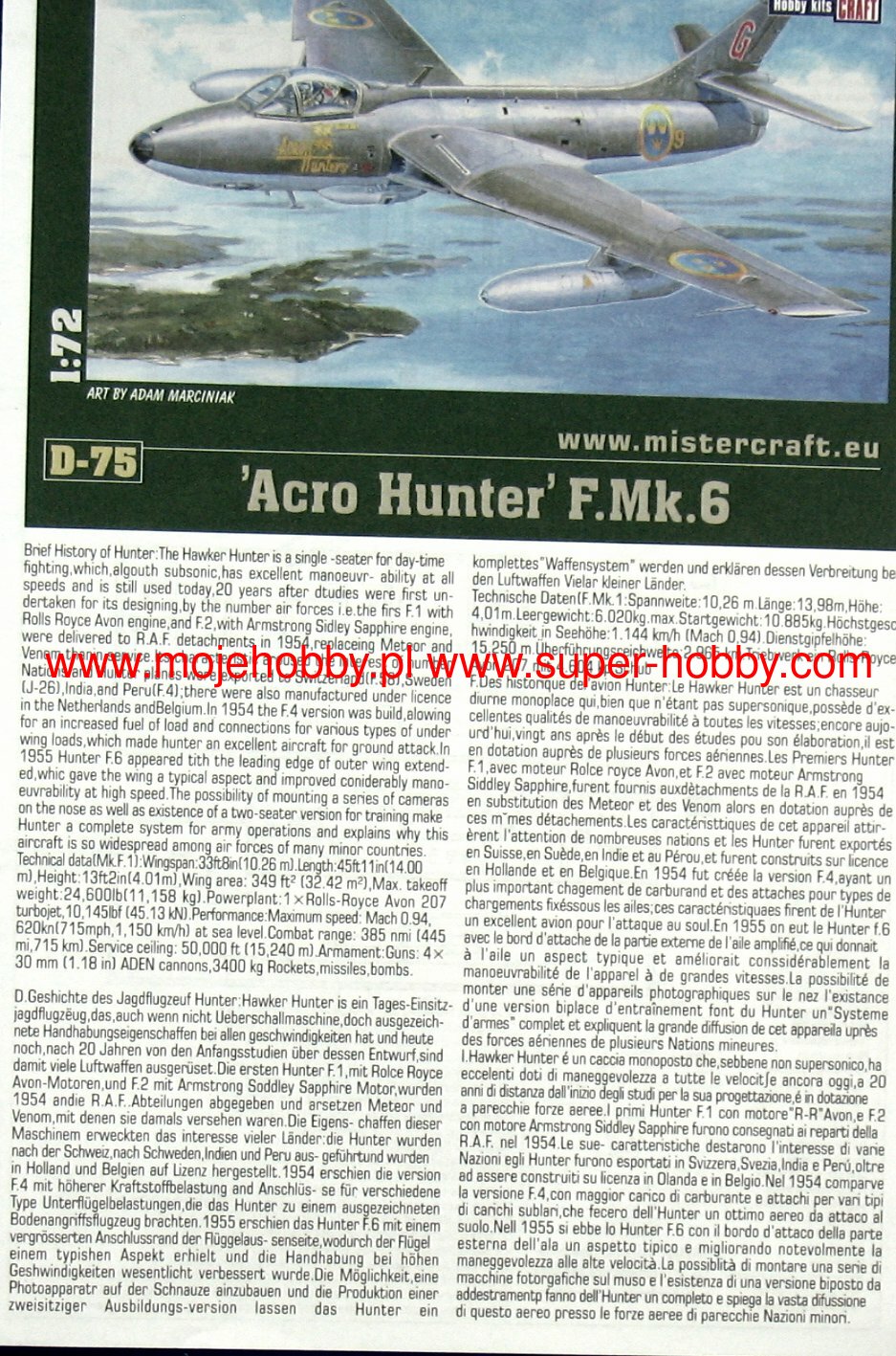 Note: Comany Mistercraft frequently changes, without any notice, the decals that come with the model, so they may differ from the photos and descriptions on our website. If you need a specific version, please let us know about that by entering the appropriate notice in the comments field when placing the order. The Hawker Hunter was one of the most successful and most widespread fighters of the 1950s. It was designed by British constructor Sir Sydney Camm in 1948 as a day fighter, successor to the Gloster Meteor. The first prototype flew in July 1951, while the first machine in the F.1 production series entered service exactly three years later. The Hunter FGA.9 was a version adapted to carry out attacks against ground targets, also equipped with the more powerful Rolls-Royce Avon 207 engine, instead of the Avon 203 from the F.6 model, and thus with a better payload and range. The changes also included redesigning and strengthening the wings. A total of almost 2,000 Hawker Hunter machines of all types were built, of which about 700 were then resold to foreign recipients after decommissioning. Belgium, Sweden, Peru and India. The Hawker Hunter machine was involved in, among others. in the Suez Crisis in 1956, in the Second Kashmir War (1965) and in the Bangladeshi War of Independence in 1971. Technical data (Hunter F.6 version): length: 14m, wingspan: 10.26m, height: 4.01m, maximum speed: 1150km / h, rate of climb: 87.4m / s, maximum range with overhead tanks: 3060km , maximum ceiling 15240m, armament: fixed - 4 30mm ADEN cannons, suspended - up to 3400 kg of cargo.