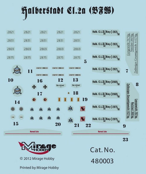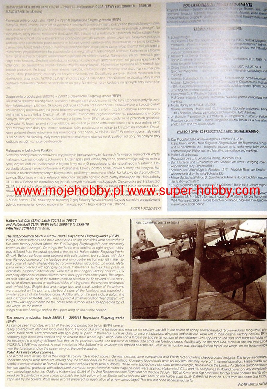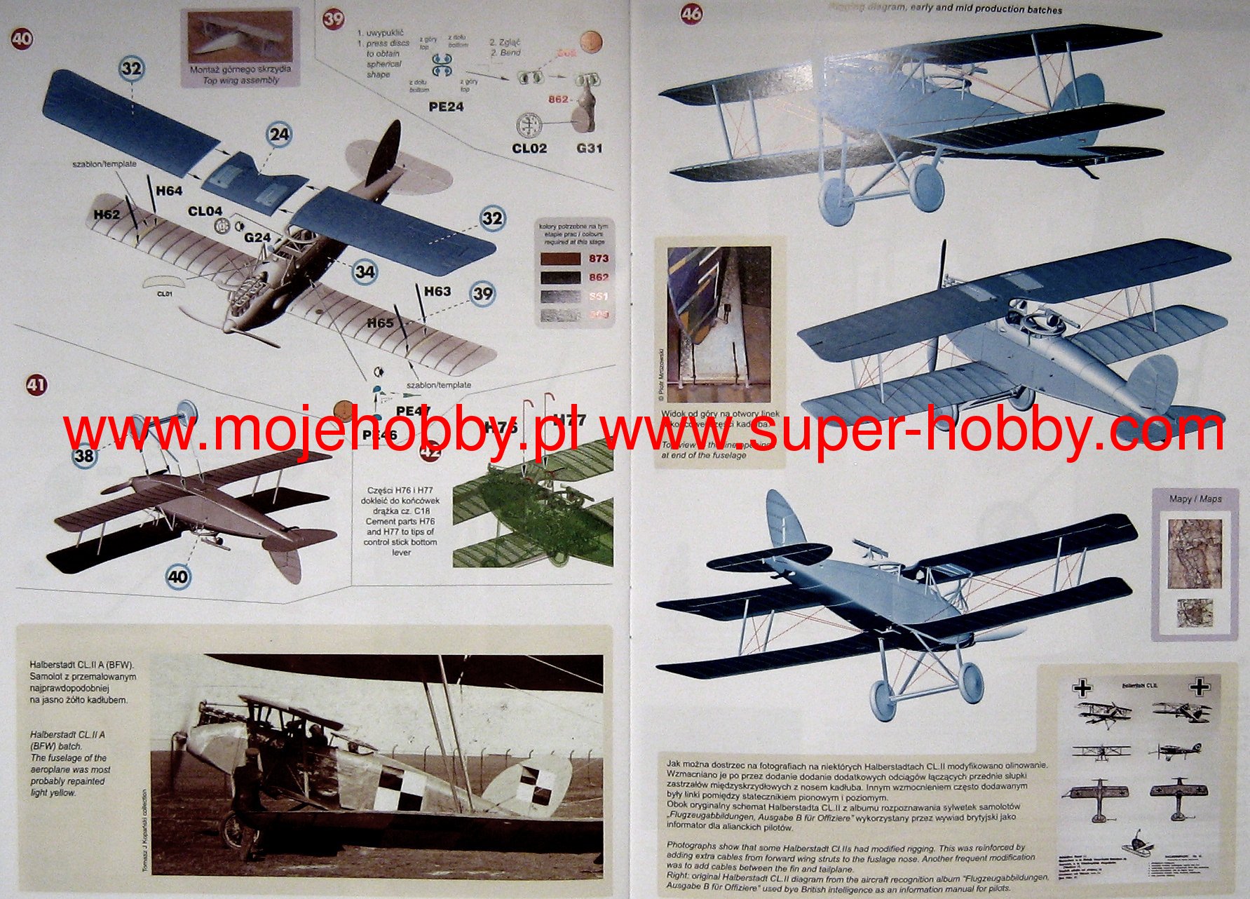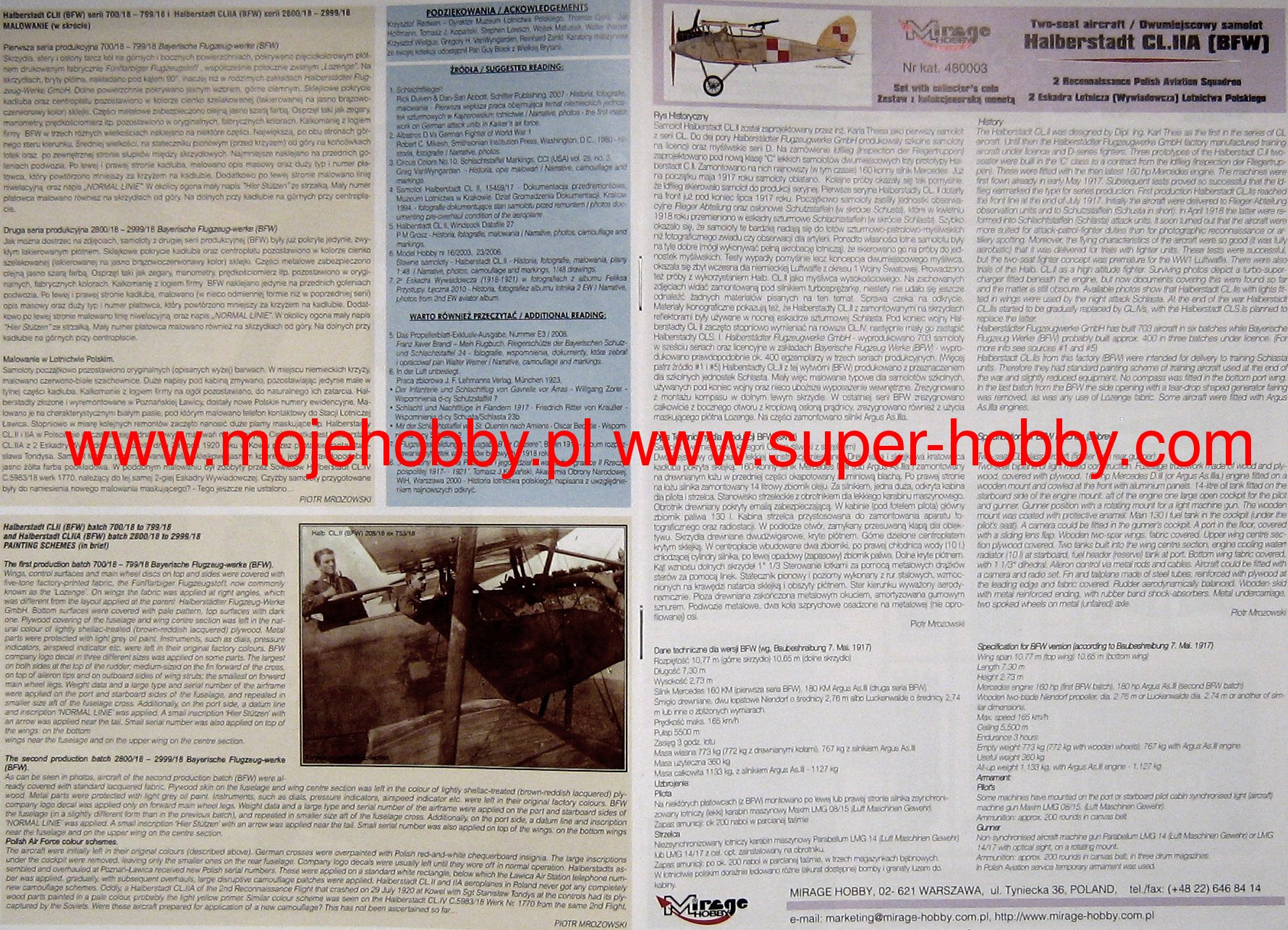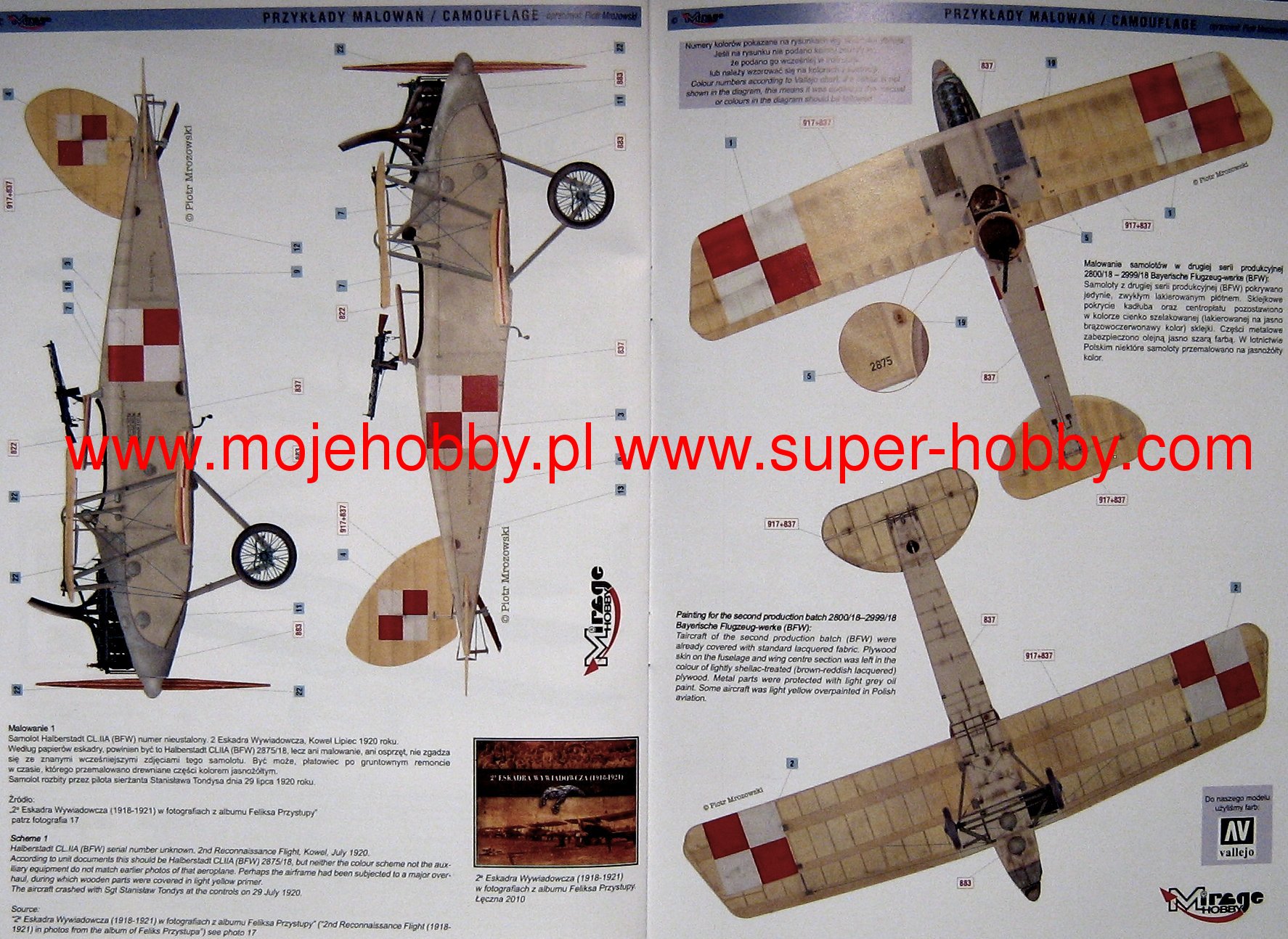 Download Mirage Hobby PDF catalogueThe Halberstadt CL.II is a German biplane, two-seater reconnaissance and fighter aircraft of a mixed, half-shell structure from the First World War. The drive was a Mercedes D.III engine with a power of up to 160 HP. The plane was designed by engineer Karol Theiss in 1916, and at the beginning of the next year a prototype flight took place. Halberstadt CL.II entered line service in August 1917. It turned out to be a very successful design, it was characterized by great maneuverability, good rate of climb and a wide field of fire. On the battlefield, the plane served in the Schlachtstaffelen units, which were responsible for direct support of the land forces. He performed very well in this role, an excellent example of which is his role in the German counteroffensive during the Battle of Cambrai (November 30, 1917). In total, 900 Halberstadt CL.II aircraft were built during the war. Technical data: length: 7.3 m, wingspan: 10.77 m, height: 2.75 m, maximum speed: 165 km / h, climb speed: 3.3 m / s, maximum ceiling 5090 m, armament: fixed-2 machine guns 7 , 92mm, suspended - up to 50 kg of bombs.