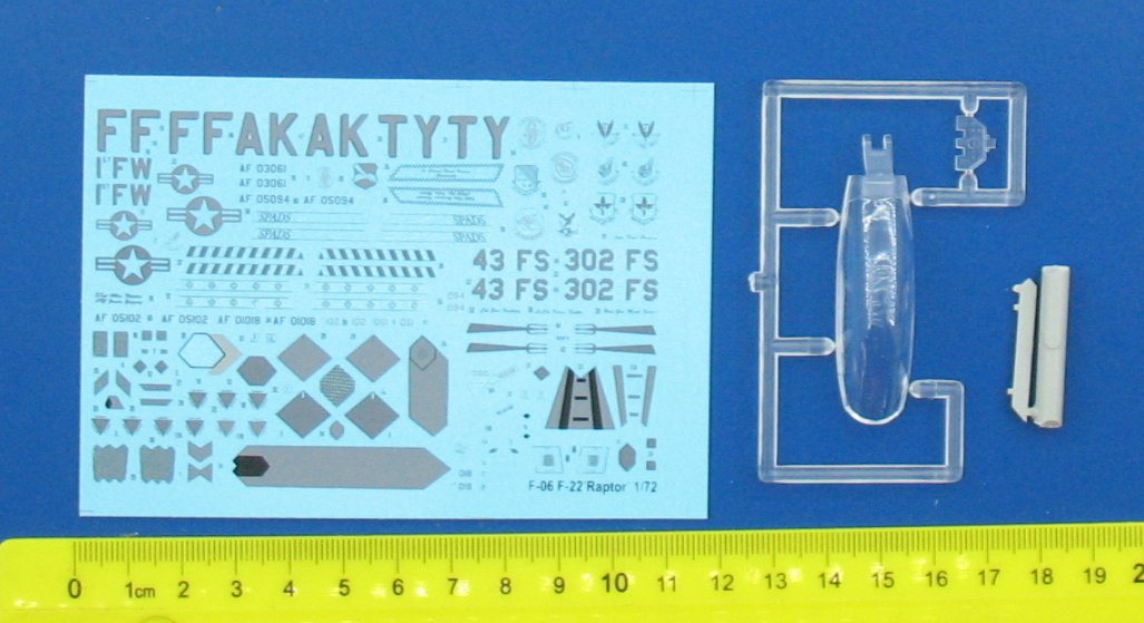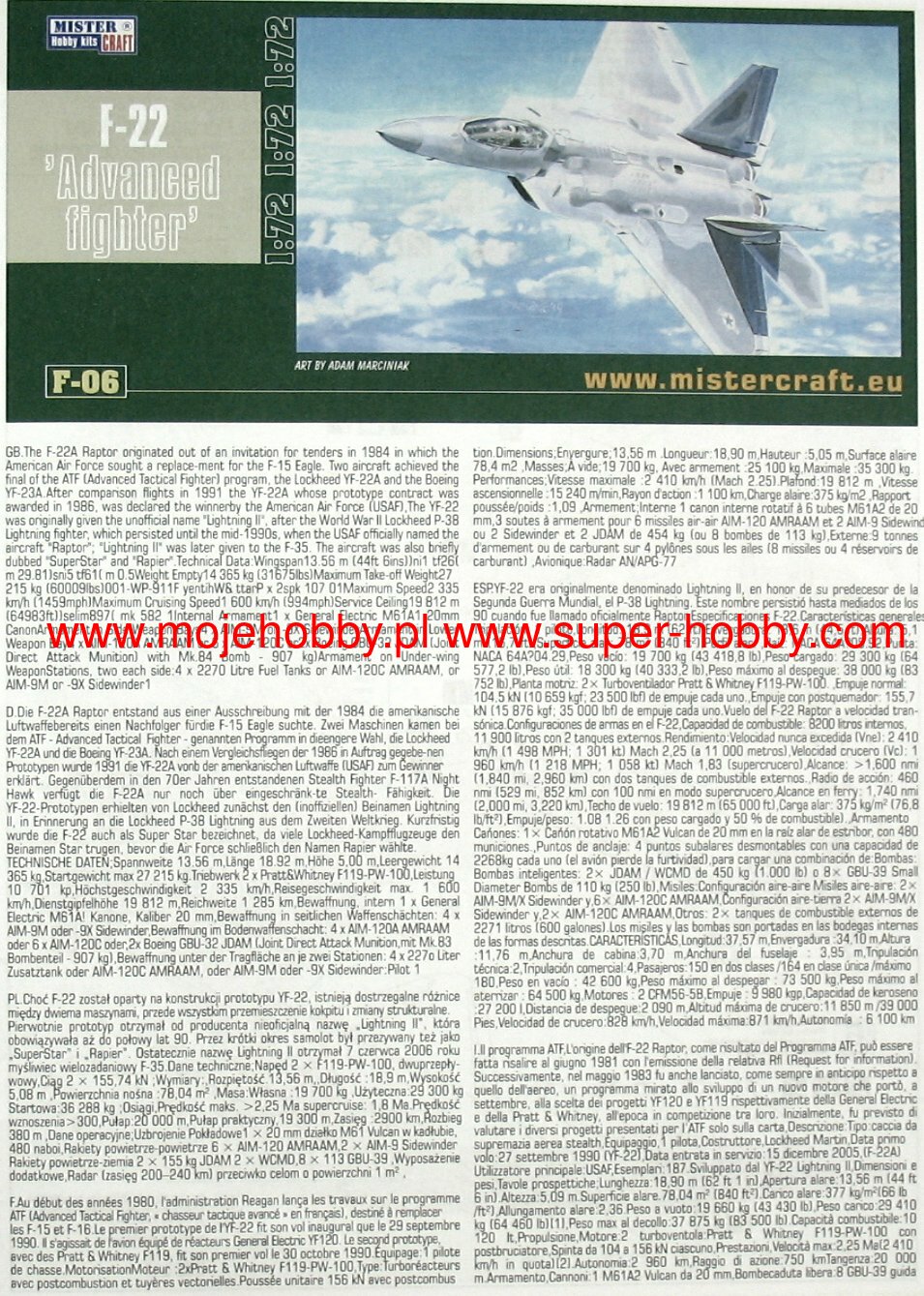 Note: Comany Mistercraft frequently changes, without any notice, the decals that come with the model, so they may differ from the photos and descriptions on our website. If you need a specific version, please let us know about that by entering the appropriate notice in the comments field when placing the order. The Lockheed F-22 Raptor is an American air superiority fighter with highly developed ground attack capabilities as well as electronic warfare and electronic watch. The F-22 was in April 1991 the winner of the competition announced by the USAAF for the Advanced Tactical Fighter, which dates back to 1981. It was then that a $ 12 billion program was launched and the construction of a highly maneuverable, indirectly controlled, Stealth fighter began. The US Navy joined the program in April 1986, hoping to build a successor to the F-14 Tomcat. Later that year, the Department of Defense announced that Lockheed and Northrop had advanced to the next stage. Each of the companies was to build a prototype, designated YF-22 and YF-23, respectively. From then on, Lockheed joined forces with Boeing and General Dynamics, which later resulted in the division of work on serial aircraft between the Boeing and Lockheed plants. The first prototype of the YF-22 was called 87-3997 / N22YF and was equipped with newly constructed General Electric YF120 engines. The flight of the plane took place on September 29, 1990. Shortly thereafter, on October 30, 1990, a second 87-3998 / N22YF prototype was flown, powered by an alternative Pratt-Whitney YF119 engine. After a careful comparison of the parameters with the competing YF-23 by the Northrop / McDonnell Douglas team, it was announced that the winner of the competition was the YF-22 with the YF119 engine. The design of the final version of the F-22A was frozen in March 1992. The differences compared to the prototype included an increase in the wingspan of a trapezoidal shape to 13.59 m, which, however, did not increase the wing surface, a reduction in the thickness of the wing profile at the root and its twisting, which ensured better controllability of the aircraft in terms of supersonic speeds. The area of the double vertical tail was also reduced to 27.2 m2. The Lockheed F-22 Raptor is one of the first, if not the only, fifth generation fighter in the world. Thanks to the use of a completely new power unit (two Pratt-Whitney F119-PW-100 engines with vector thrust) and low aerodynamic resistance, the speed of the F-22 - according to unofficial data - exceeds 2.4Ma. In addition, it is highly maneuverable, which allows you to perform such acrobatic figures as, for example, the Pugacheva cobra or Kulbit. Another important feature of the F-22 is the Stealth technology, however, based less than the F-117 on RAM, and more on the aerodynamic excellence, overall shape of the airframe and refined exterior details. The exact radar view (RCS), however, is still classified. It is also very important to use the highly innovative AN / APG-77 radar, thanks to which it is possible to detect objects from about 250 km. Moreover, this radar enables the F-22 to act as a "mini-AWACS" aircraft, which significantly increases the combat capabilities of the strike teams with this aircraft. AN / APG-77 can also be used to attack the enemy's electronic radar and overload his sensors. Production of the F-22 ended in 2011, with the production of 187 serial aircraft, with Lockheed obliged to maintain the production lines and facilities. Due to its technological advancement, the F-22 is not exported.