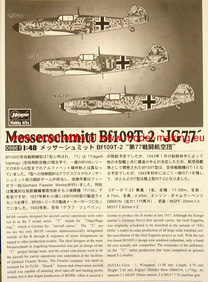 The Messerschmitt Bf-109 is a German metal-structure single-engine fighter in a low wing configuration with a classic tail. It turned out to be the basic and most produced Luftwaffe fighter during World War II. The flight of the prototype took place on May 29, 1935, and serial production continued in the years 1936-1945. In total, it is estimated that a total of about 35,000 Messerschmitt Bf-109 fighters of all varieties were produced, many of which ended up in the Czech and Israeli air forces after the war. The roots of the Bf-109 go back to the competition announced in 1933 by the Luftwaffe for a new fighter plane. In competition with the He-112, the Bf-109 project initially lost, but thanks to Willie Messerschmitt's intrigues, the project could continue and eventually he was the winner of the competition, becoming the Luftwaffe's primary fighter. Several main variants of the Bf-109 were developed in the course of production. The first pre-production series was the Bf-109B (Berta) with different versions of the Junkers Jumo 210 (A or Da) engine. They were tested in Spain from 1937 during the Civil War. The next version is the Bf-109C (Caesar). They had a different engine than the B version, and extensive armament consisting of two 20mm and 2 HP 7.92mm cannons. These machines also fought in the skies of Spain. The third version is the Bf-109D (Dora) with the Junkers Jumo 210 Da or Daimler-Benz DB 600 engine. It fought in the September campaign, but at the turn of 1939/1940 it was replaced by the E version. The most famous model was the Bf-109E (Emil) with a Daimler-Benz 601A or N engine. It was the first to use a three-blade, not a two-blade propeller. Bf-109E fought in the French campaign, over England, and in North Africa and on the Eastern Front. The ace who started his career on the Bf-109E was the famous Adolf Galland. The next version is the Bf-109F (Friedrich), which, according to the German pilots, was the most aerodynamically perfect. It sowed the changed shape of the fuselage, wings, cabin fairings, but no new engine was used. It was put into service at the turn of 1940/1941. As part of the development of the design, further Bf-109 specifications were developed, of which the G (Gustav) version was produced in the largest number of copies. The most important change increasing the machine's performance was the installation of a new 12-cylinder Daimler-Benz DB605A engine with 1475HP. The armament of the Bf-109G was a pair of 13mm machine guns located in the fuselage in front of the cockpit fairing, and the MG151 20mm or heavier MK108 30mm cannon. The last mass-produced version was the Bf-109K (Kurfirst), which production started in October 1944. A Daimler-Benz DB 605DB or DC unit was used as the engine. The Bf-109K was the fastest version produced during World War II, reaching up to 730 km / h. Apart from that, two versions were created - H and Z, but they were rather experimental versions and their mass production did not start. Subsequent improvements in propulsion and armament made the Messerschmitt Bf-109 one of the most dangerous fighters of World War II, and at the same time showed the great potential of the slightly angular airframe created by Willi Messerschmitt. Technical data (version Bf-109 G-6): length: 8.95 m, wingspan: 9.92 m, height: 2.6 m, maximum speed: 640 km / h, rate of climb: 17 m / s, maximum range: 850 km, maximum ceiling 12000m, armament: fixed - 2 MG131 13mm machine guns and 1 MG151 20mm cannon, suspended - 250 kg bombs, or 2 Wfr missile launchers. Gr. 21.