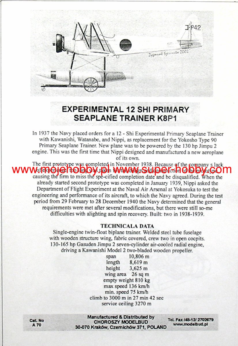 The Nippi K8P1 was a Japanese prototype training seaplane from the interwar period and the beginning of World War II. The prototype flight took place in 1938 or early 1939. The machine did not enter serial production. The drive was provided by a single engine Gasuden Jimpu II with up to 165 hp. The length of the aircraft was 8.6 meters with a wingspan of 10.8 meters. The plane did not have permanent on-board weapons. The Nippi K8P1 was developed for the needs of the Japanese Navy, which in the late 1930s sought to obtain a new training seaplane to replace the machines in the line. Yokosuka K4Y . The ordering party also imposed that the new plane would be powered by an engine Gasuden Jimpu II. It is worth adding that the K8P1 prototype was the first aircraft constructed at the Nippi plant. For this reason, the company recruited several subcontractors with more experience in aircraft construction. In total, only two examples of this aircraft were made, which were tested by the Japanese Navy in 1940, but did not enter serial production.