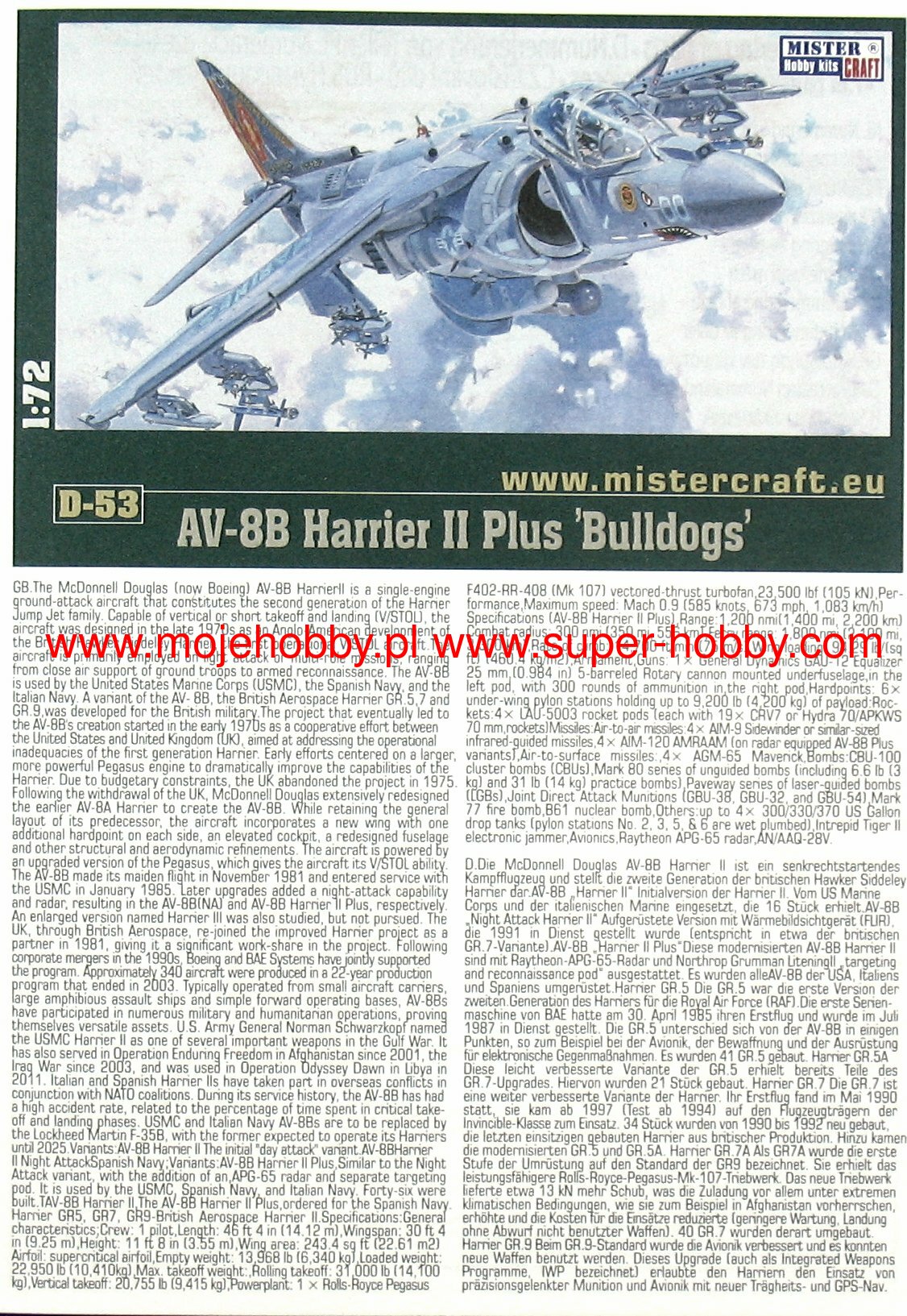 Note: Comany Mistercraft frequently changes, without any notice, the decals that come with the model, so they may differ from the photos and descriptions on our website. If you need a specific version, please let us know about that by entering the appropriate notice in the comments field when placing the order. The McDonnell-Douglas / BAe AV-8B Harrier II is a single-seat, V / STOL fighter-attack aircraft with a half-shell, duralumin structure. The roots of the Harrier II aircraft date back to 1973, when McDonnell-Douglas and BAe collaborated to create a new, significantly improved Harrier. The recipients were to be the American US Marine Corps as well as the British RAF and Royal Navy. However, due to the high cost of a new engine for Harrier (Pegasus 15) in 1975, the British government and thus BAe withdrew from cooperation. As a result, only the McDonnell-Douglas concern remained on the "battlefield". Taking into account the costs, the American label decided to make only a far-reaching modification of Harrier, using newer avionics, a different wing and large-scale composites. The first prototype, the YAV-8B, took off in 1978. In 1980, the British side decided to join the project again. The first built from scratch AV-8B flew in 1981 and entered the line in 1983. US Marine Corps units use the AV-8B, T AV-8B, AV-8B (NA) and AV-8B + versions. The first of them is the basic version of the aircraft, serving as a fighter-attacker. It has greater lifting capacity and range than the AV-8A, as well as is more maneuverable and has a more modern avionics and engine. The latter, on the other hand, was commissioned by Italy and Spain and is used on aircraft carriers of these countries. The RAF uses the versions GR.5, GR.5A, GR.7, GR.7A, GR.9, GR.9A, and T.10, T.11 and T.12. Airplanes marked as GR are fighter-attack versions, while T are two-seater training machines. AV8B / Harrier II took part in Operation Desert Storm (1991) and in the war with Iraq (2003) and Afghanistan (2006-2008). Technical data (version Harrier AV-8B): length: 14.12m, wingspan: 9.25m, height: 3.56m, maximum speed: 1085km / h, combat radius: 1205km, armament: GAU-12U fixed cannon caliber 25 mm, suspended - up to 3748 kg of cargo.