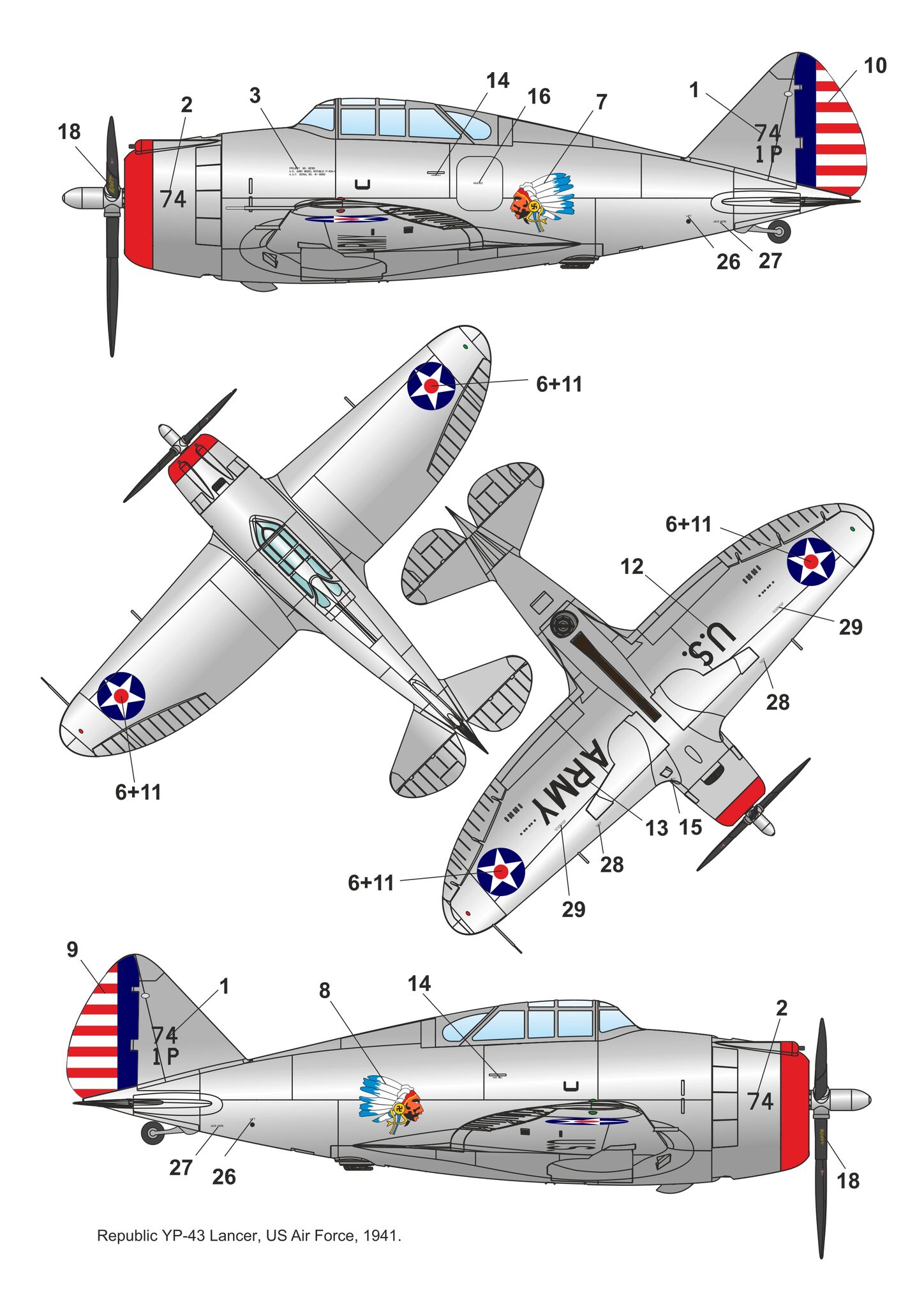 Republic P-43 Lancer was an American low-wing fighter, which was flown in 1940, and during its production (which lasted in 1940-1941), about 270 machines of this type were created. The plane, in the P-43A version, was 8.7 meters long with a wingspan of 11 meters. The drive was provided by a single Pratt and Whitney R-1830 engine with a maximum power of 1200 HP. The maximum speed was 573 km / h, with a climb speed of 13 m / s / The on-board armament consisted of 4 M2 Browning 12.7 mm machine guns. The Republic P-43 Lancer was developed for the needs of the US Air Force, then known as the United States Army Air Corps (USAAC), as a new primary interceptor. It stood in competition with prototypes, for example: P-38 Lightning or P-40 Warhawk. Interestingly, he did not come out of this fight completely defeated, because the US Air Force placed an order for the short-series production of this machine. Interestingly, despite the good performance and piloting properties and the ability to fly at high altitude, the machine was quickly recognized as unsuitable in combat and moved to the reserve or rebuilt into photographic reconnaissance planes, as well as exported to China and Australia. However, controversy continues to this day as to whether the Republic P-43 Lancer was not rejected too hastily by the USAAC. The main development version of the machine was the P-43A model, which compared to the P-43 model had better armor in the pilot's cockpit, self-sealing fuel tanks and a different version of the engine Pratt and Whitney R-1830. It was also a version with over 100 copies given to China.