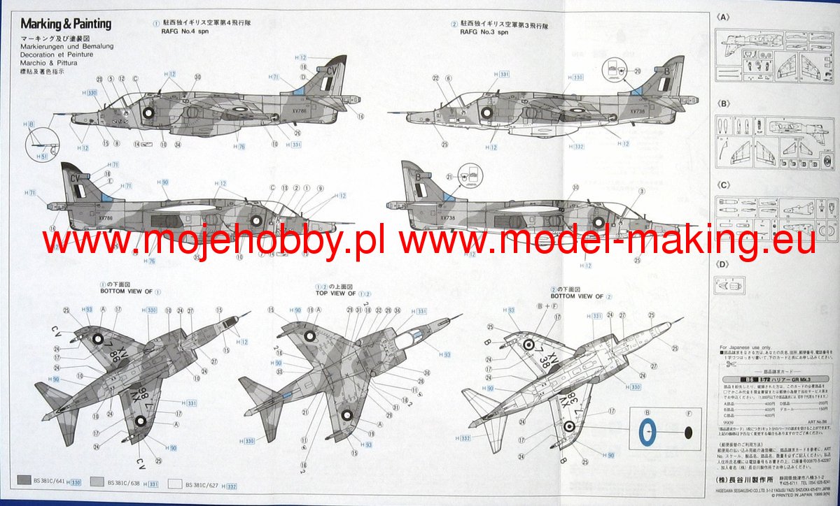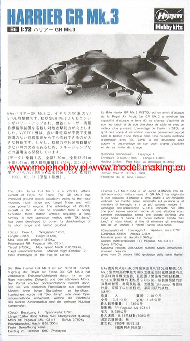 The BAe Harrier is a British single-seat V / STOL fighter, attack and reconnaissance aircraft with a duralumin, half-shell structure. The origins of Harrier's construction can be found in 1957, when Lord Sydney Camm of Hawker Aircraft and Dr. Stanley Hooker of Bristol Siddeley Engines started the construction of a tactical aircraft using the latest turbo-fan engine from Bristol plants, then known as BS.53. It was specially adapted to the vertical thrust vector ensuring the vertical take-off of a fixed-wing aircraft. Engine exhaust gases were directed to four staggered nozzles placed in pairs at the front and rear of the fuselage. The range of rotation of the nozzles exceeded 90 degrees, which allowed the exhaust gases to be directed directly rearward in normal flight, vertically downward for take-off and landing, or to any angle during the transition phase. Around the engine, Camm constructed a compact, conventional, high-wing metal airframe. In the forward part of the fuselage there was a one-person cabin, next to which there were two fixed, stationary air inlets for engines with a semicircular cross-section. The two-wheeled main and one-wheeled undercarriages are built in tandem in the central axis of the fuselage. The first of the six prototypes took off for the first time on October 21, 1960. After less than a year, a complete transition was made from vertical climb to horizontal flight and hover again. In February 1965, the UK government ordered six test aircraft. These were the first examples to be given the name Harrier. Apart from Great Britain, the only user of the standard Harrier aircraft is the Spanish Navy, where the aircraft are known as the Matador. To date, a dozen or so versions of the Harrier aircraft have been produced. Chronologically, the first was the Harrier GR.1 (an attack aircraft that entered service in 1969). Version T.3 was created quickly, i.e. a two-person school version of Harrier GR.1. The next version is the Harrier GR.3, which is the most modern assault version of this aircraft equipped with Pegasus 11 Mk 103 engines. Since 1978, the version marked as Sea Harrier has also been produced, the FRS.MK.1 model of which distinguished itself during the Falklands war. in 1982 as a fighter attack aircraft. As a result of the experience gained from this war, the FA.2 version was created, which has better avionics, including a great Blue Vixen radar, greater payload and can use a wider range of weapons. Technical data (GR.3 version): length: 14.37m, wingspan: 7.6m, height: 3.42m, maximum speed: 1185km / h, maximum climb speed: 254m / s, combat radius: 420km, armament : fixed - not equipped, suspended - up to 3176 kg of load.